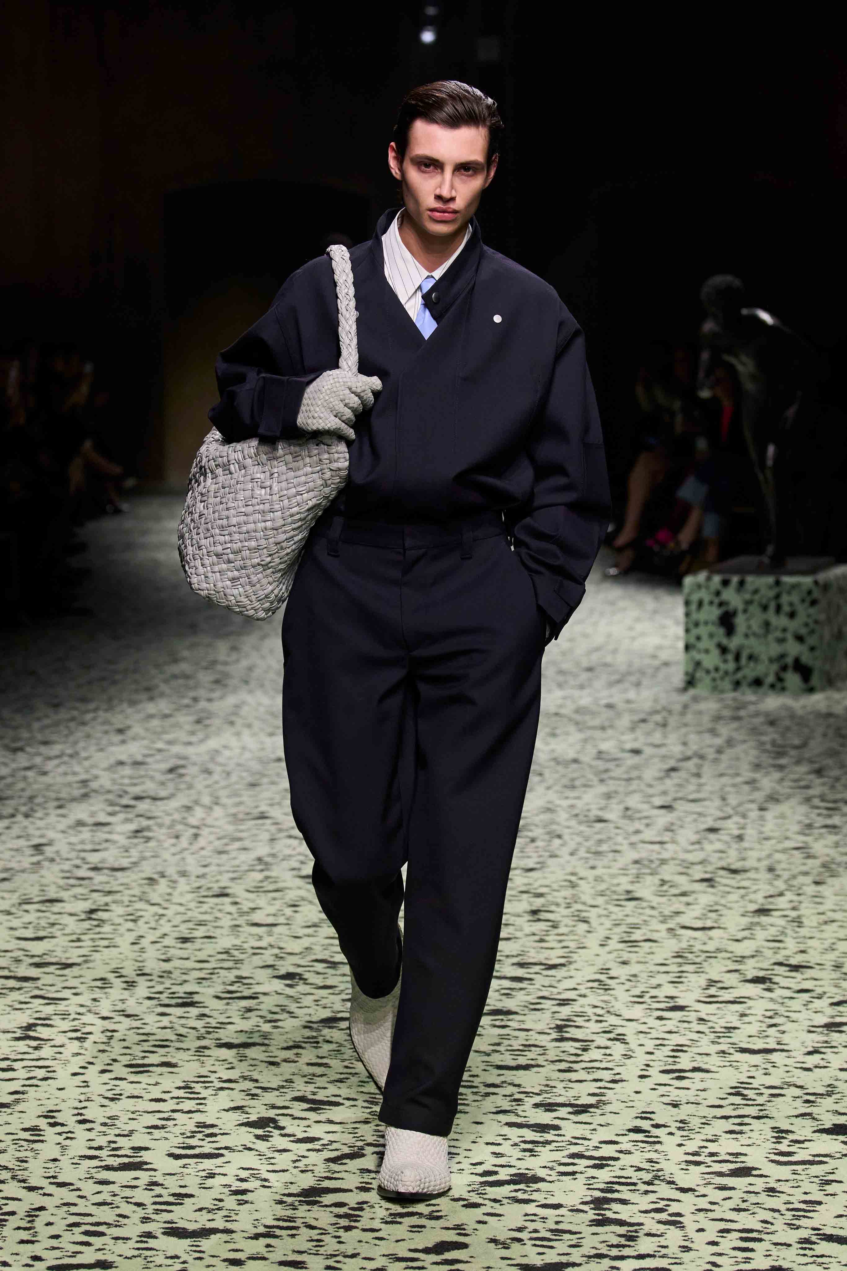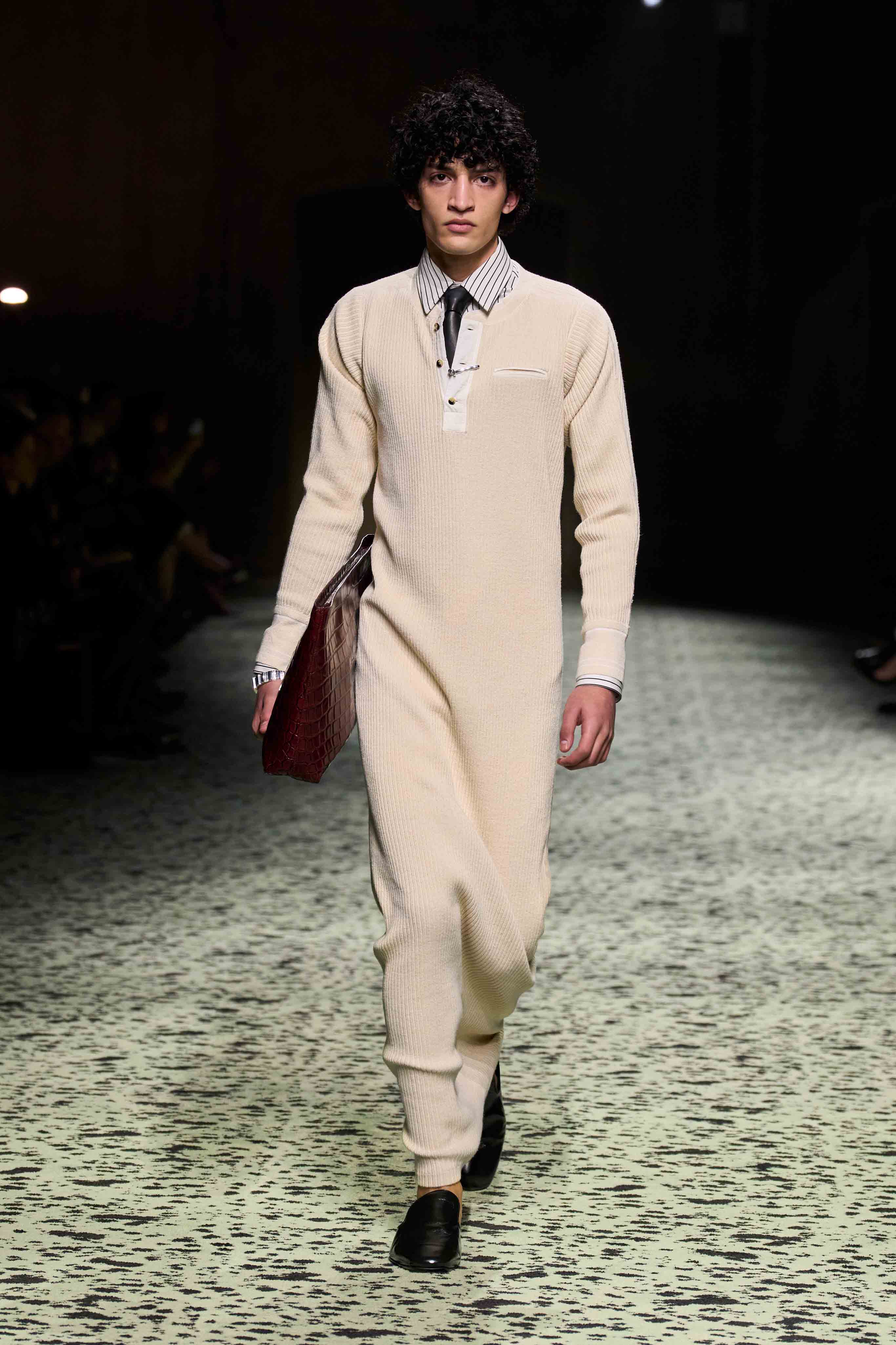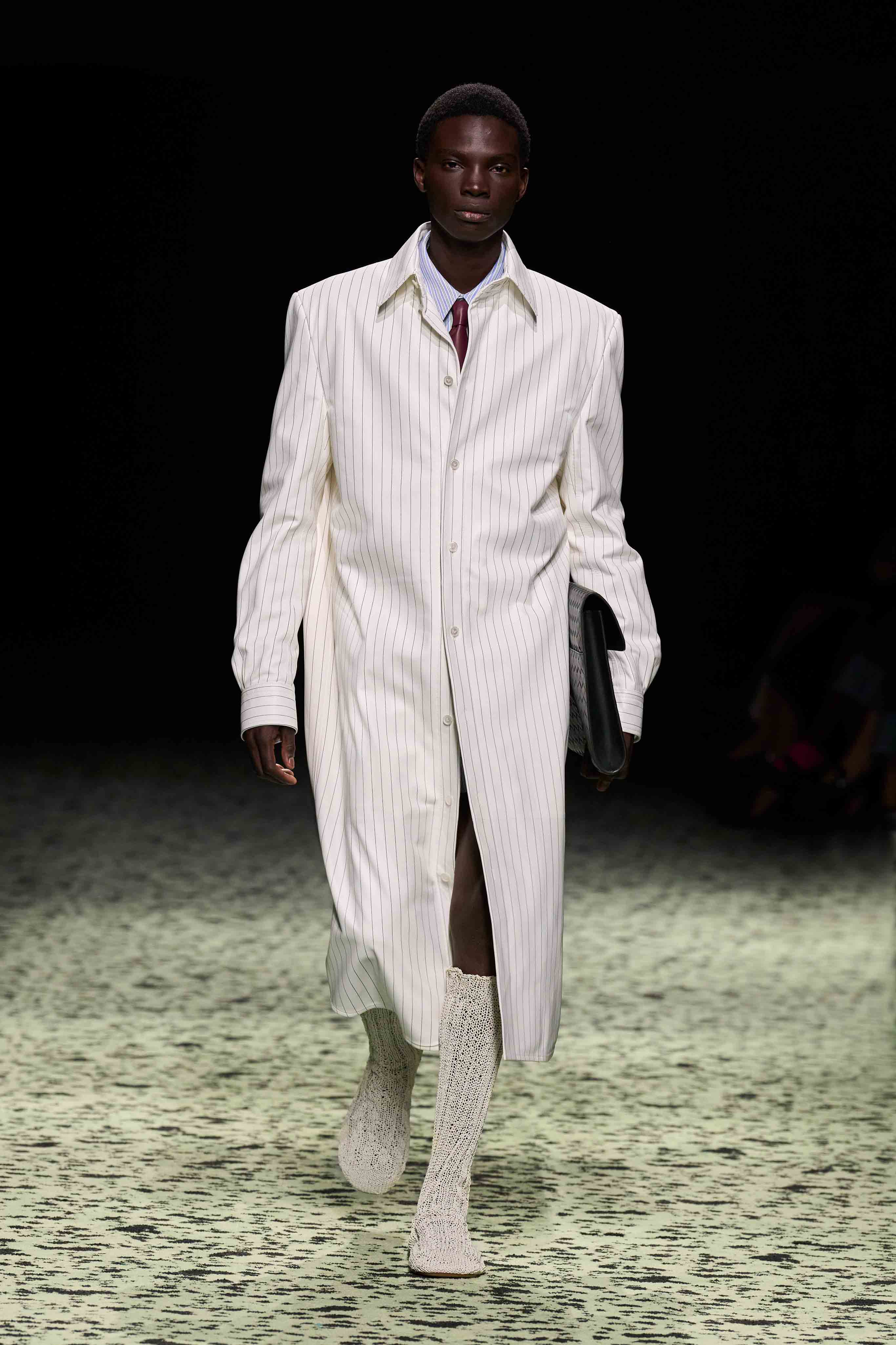 「パレード:ストリートの錬金術は多様なものが集まった中に存在します。誰に出会うだろう?角を曲がったところには何がある?あなたを驚かせるのは誰だろう?その出会いの驚きこそが重要なのです」とブレイジー。ショーは日常の朝をイメージさせる場面からスタートし、透け感のあるホワイトのシュミーズと、ベッドソックスを、ドレスとレザーを編んだシューズで表現。いずれもナッパレザーを全面に使用したピンストライプのナイトシャツやパジャマを纏った「おしゃれにこだわる実業家」などが登場。