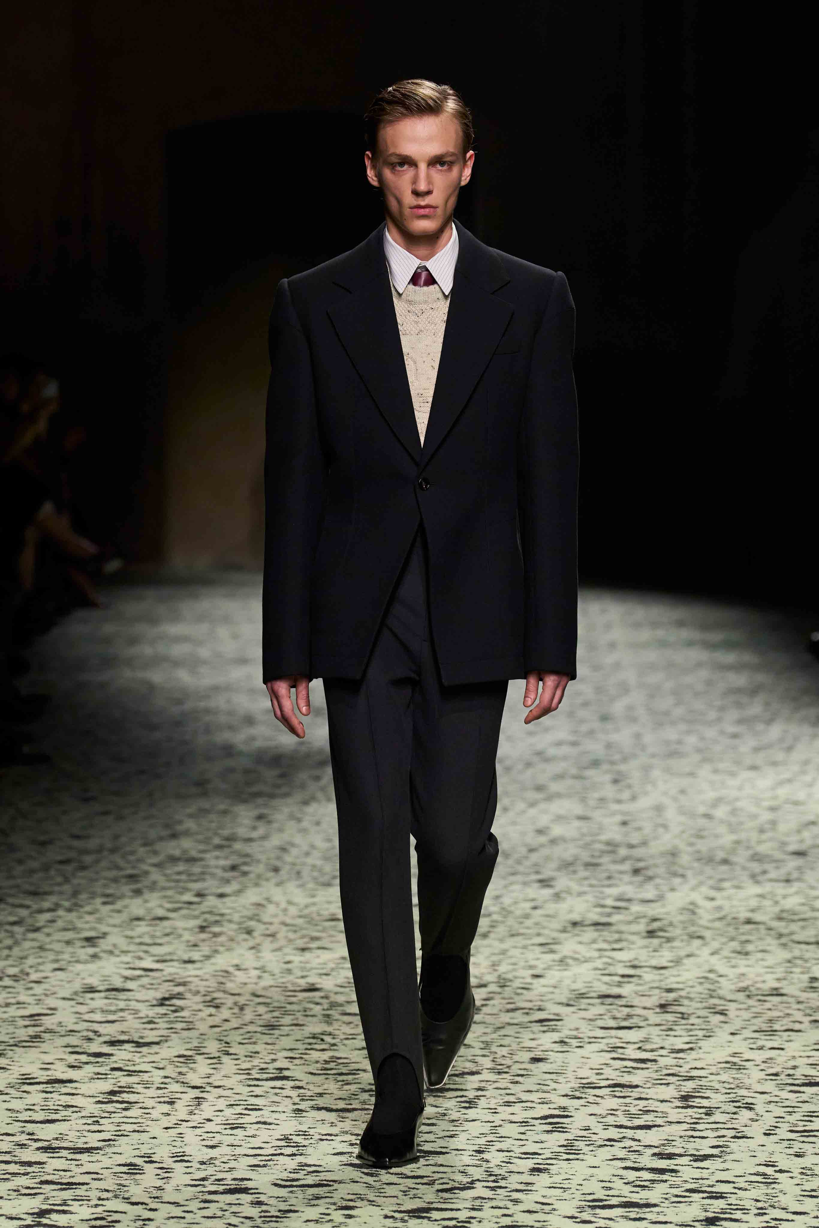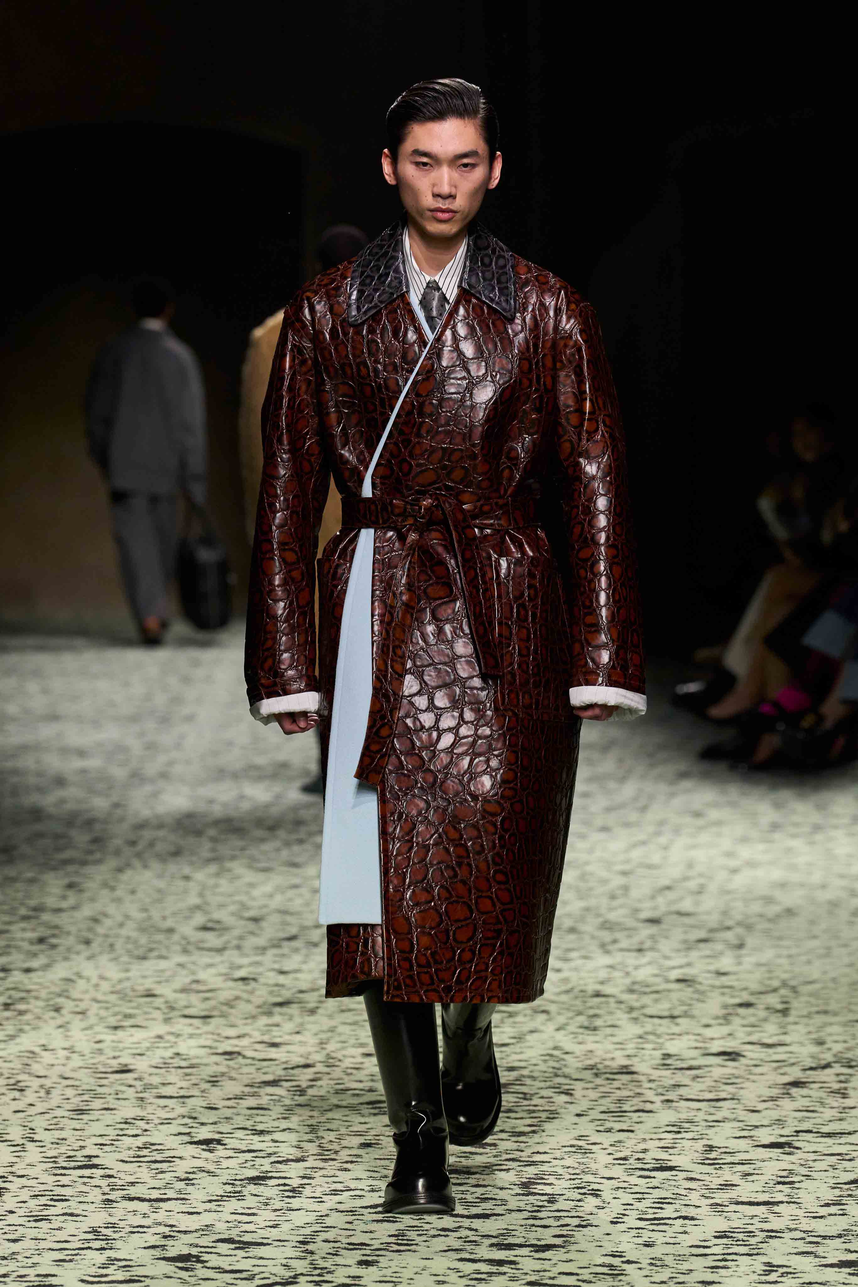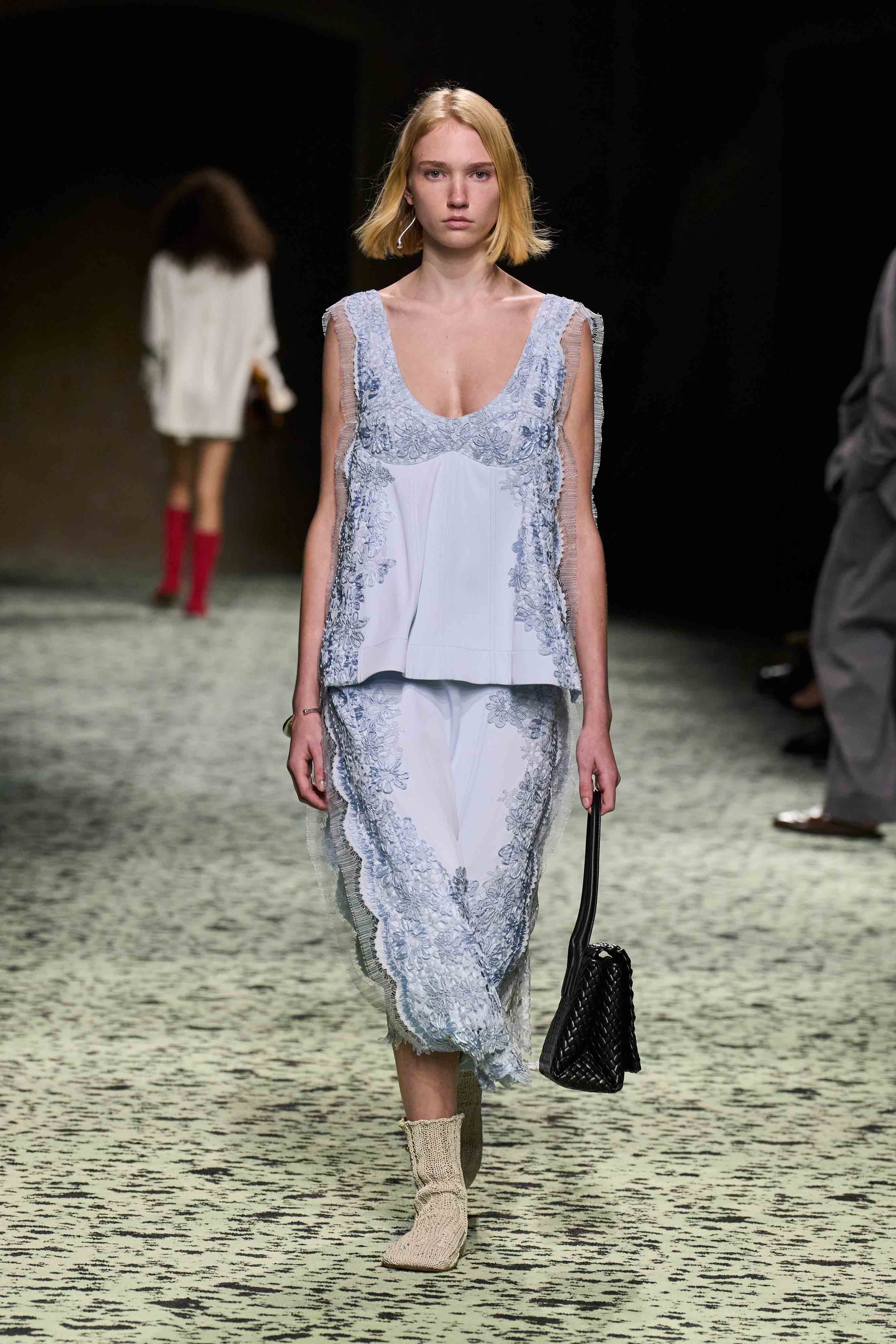 「パレード:ストリートの錬金術は多様なものが集まった中に存在します。誰に出会うだろう?角を曲がったところには何がある?あなたを驚かせるのは誰だろう?その出会いの驚きこそが重要なのです」とブレイジー。ショーは日常の朝をイメージさせる場面からスタートし、透け感のあるホワイトのシュミーズと、ベッドソックスを、ドレスとレザーを編んだシューズで表現。いずれもナッパレザーを全面に使用したピンストライプのナイトシャツやパジャマを纏った「おしゃれにこだわる実業家」などが登場。
