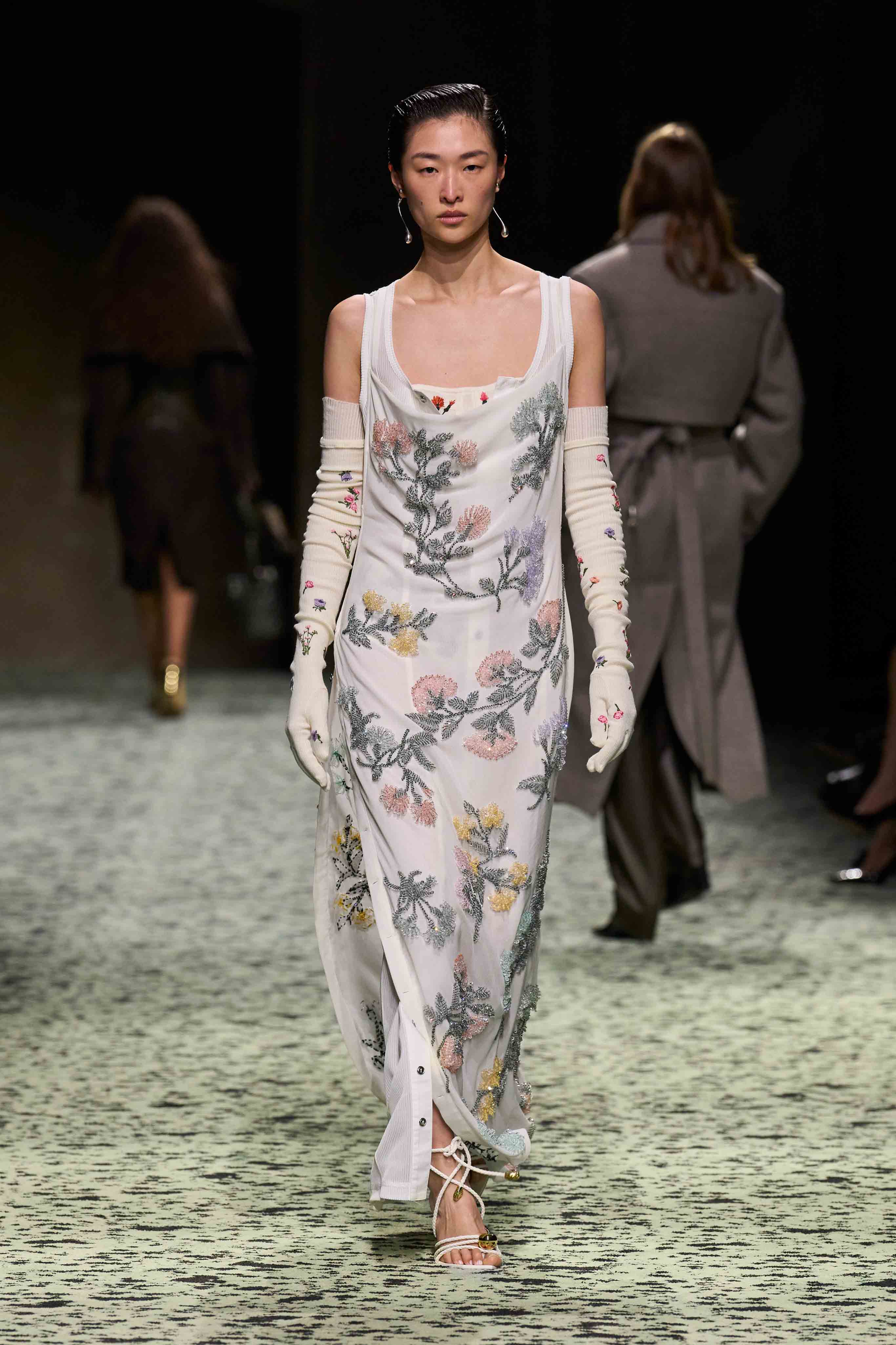Botticelli(ボッティチェリ)の「プリマヴェーラ」(1482年)のクロリスとフローラを現代的に再構成し、シルクに綿密な手刺繍などを施し配置に変化も持たせた。シャギーなフィルクーペジャカードや、新種の皮膚のように鱗や羽となって体を覆うイントレチャートなども登場。新たな創造上の生き物(クリーチャー)たちが手にするサーディンバッグのハンドルには、半透明のムラーノガラスをあしらった。