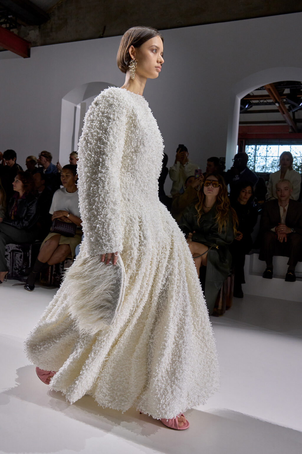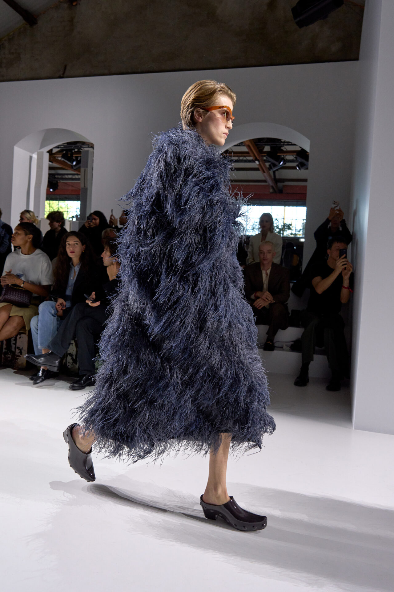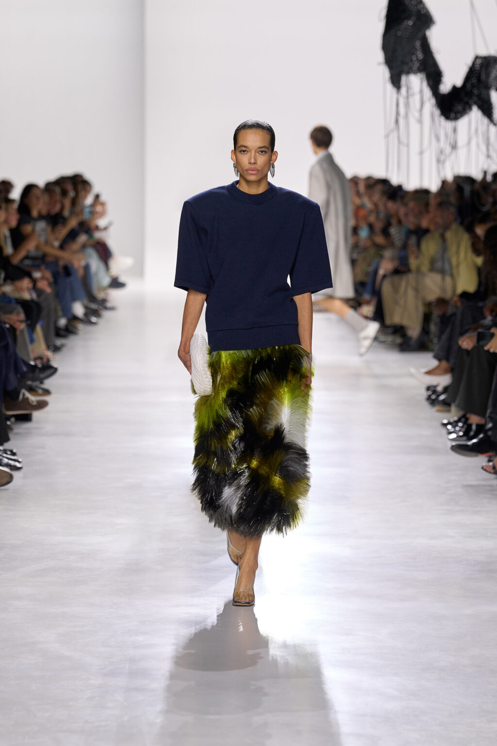 夢のようなフェザートップとフリンジスカートがランウェイの上で揺らめき、観客を瞬く間に陶酔させる。これらのルックは、艶やかなクロコダイルスキンジャケット、ウエストをシャープに絞ったスーツ、ワイドショルダーTシャツ、そして肩から流れるようなクリンクルドレスと組み合わされた。