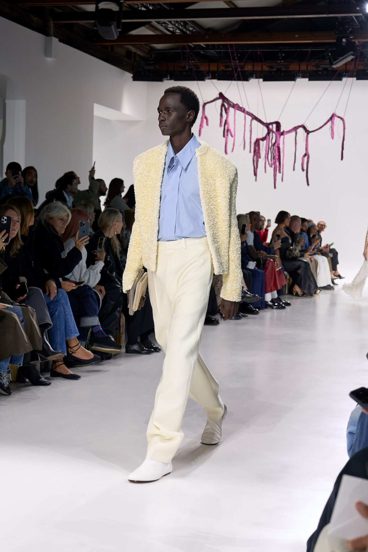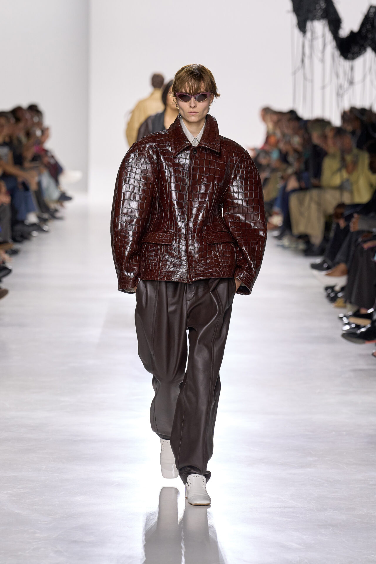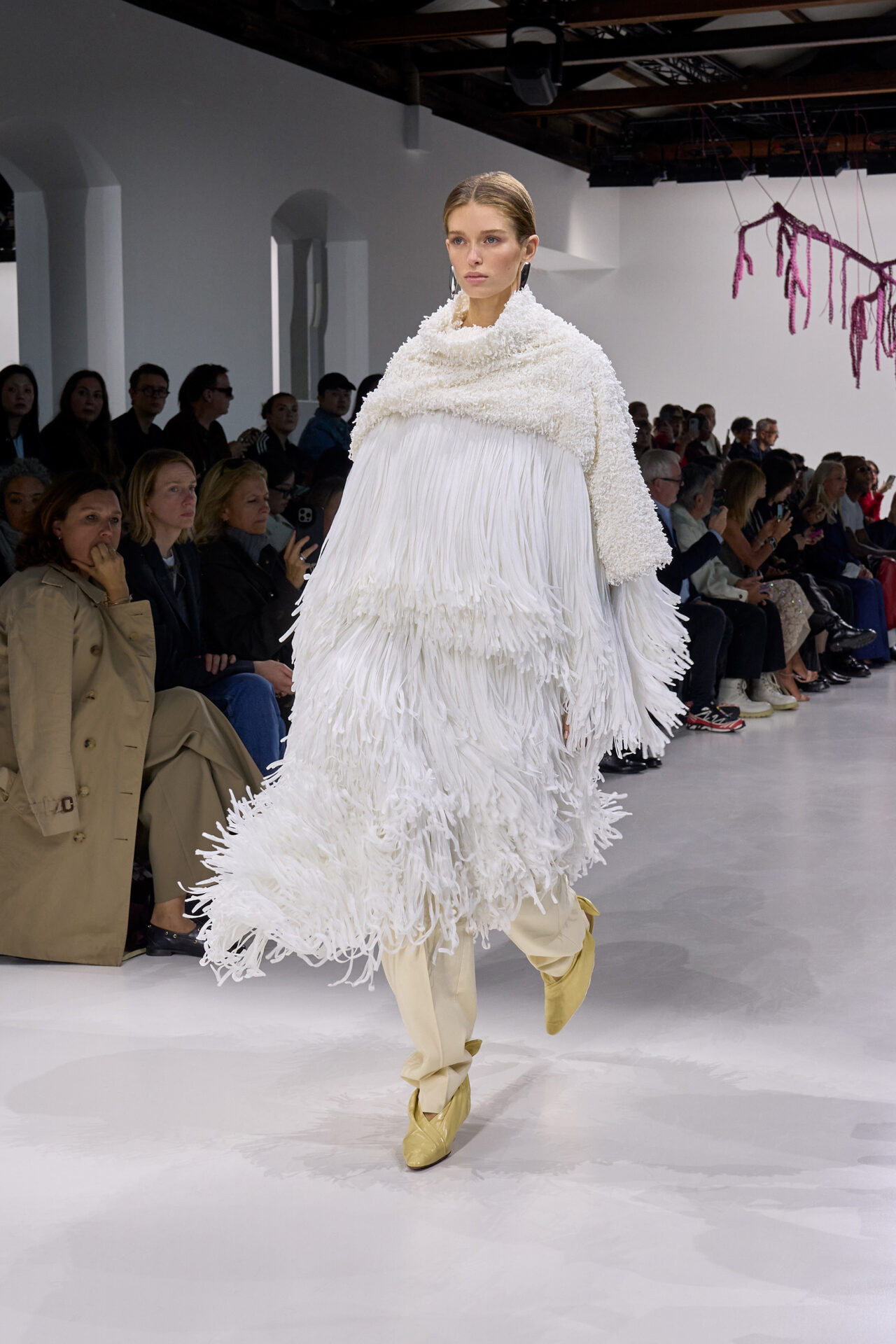夢のようなフェザートップとフリンジスカートがランウェイの上で揺らめき、観客を瞬く間に陶酔させる。これらのルックは、艶やかなクロコダイルスキンジャケット、ウエストをシャープに絞ったスーツ、ワイドショルダーTシャツ、そして肩から流れるようなクリンクルドレスと組み合わされた。