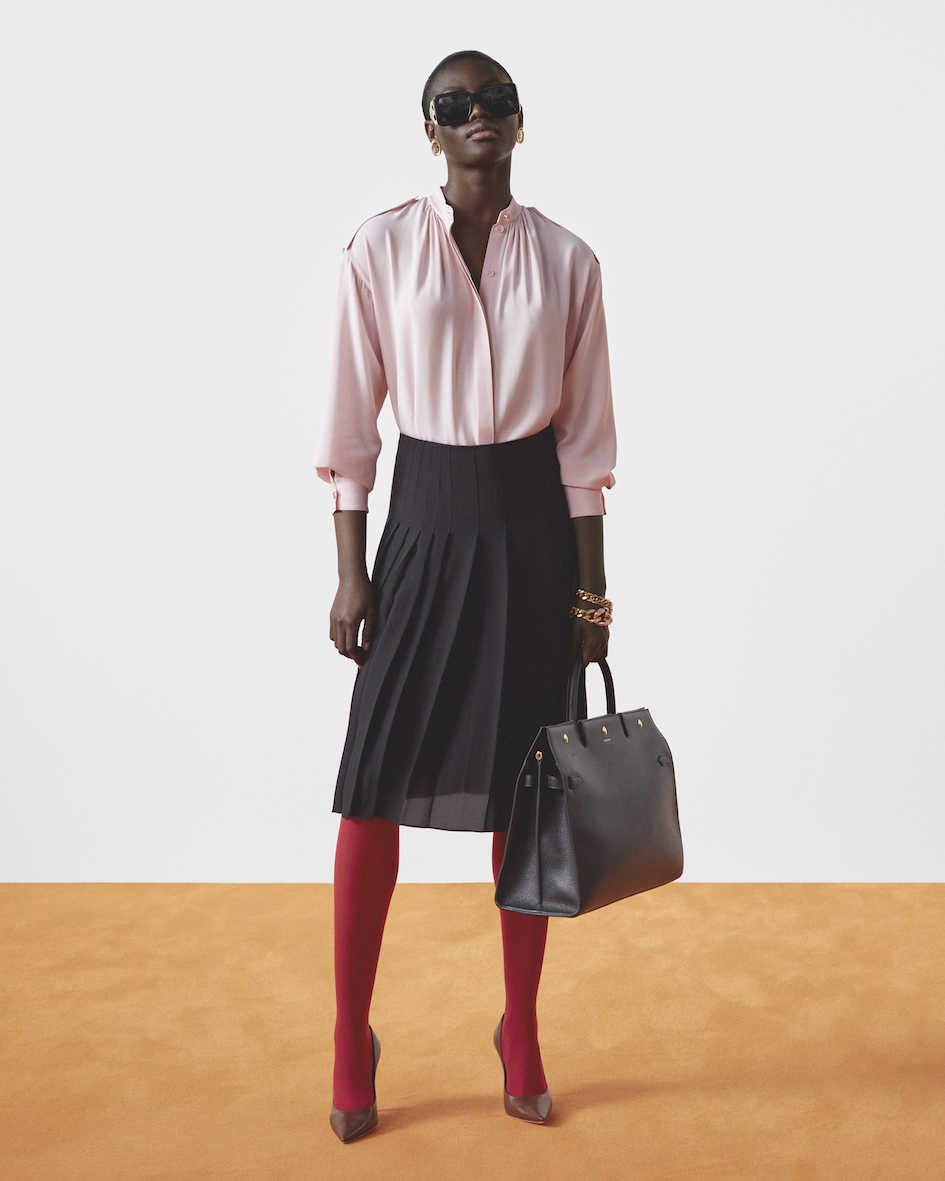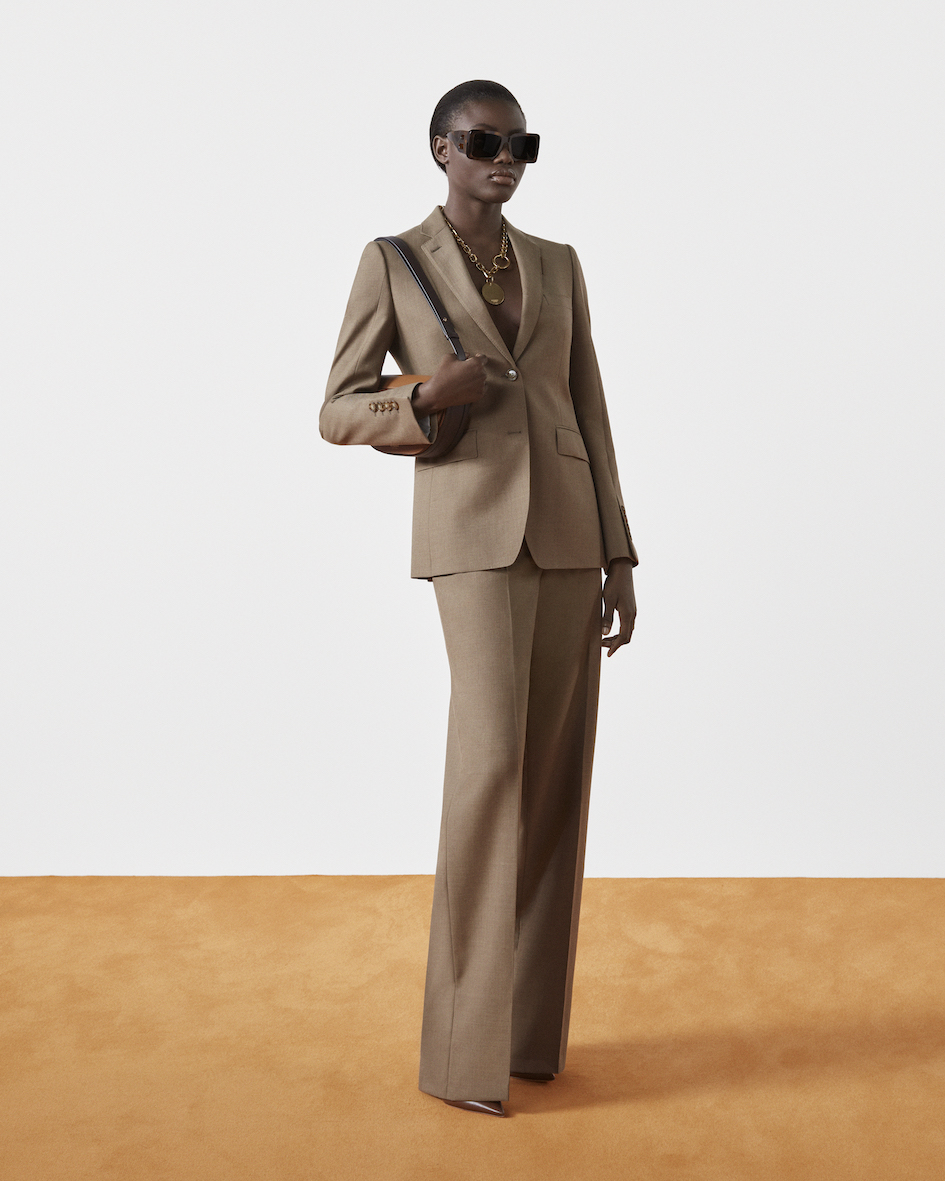 クラシックなテーラリングでは、ゴールドのトーマス・ バーバリー モノグラムのボタンが特徴的なシングルブレスト・リラックスフィットのウールジャケットを展開。モノグラムモチーフのアップリケが付いたコットンオックスフォードのシャツと、イタリア織のシルクジョーゼットのプリーツスカート、ワイドなウールトラウザーなども取り揃える。そのほかにも、ウールやシルクとカシミアをブレンドしたファンネルネックセーター、ベスト、カーディガン、ブラックとキャメルのポロシャツに焦点を当てた。全国のバーバリーストアと、BURBERRY公式オンラインショップで展開。