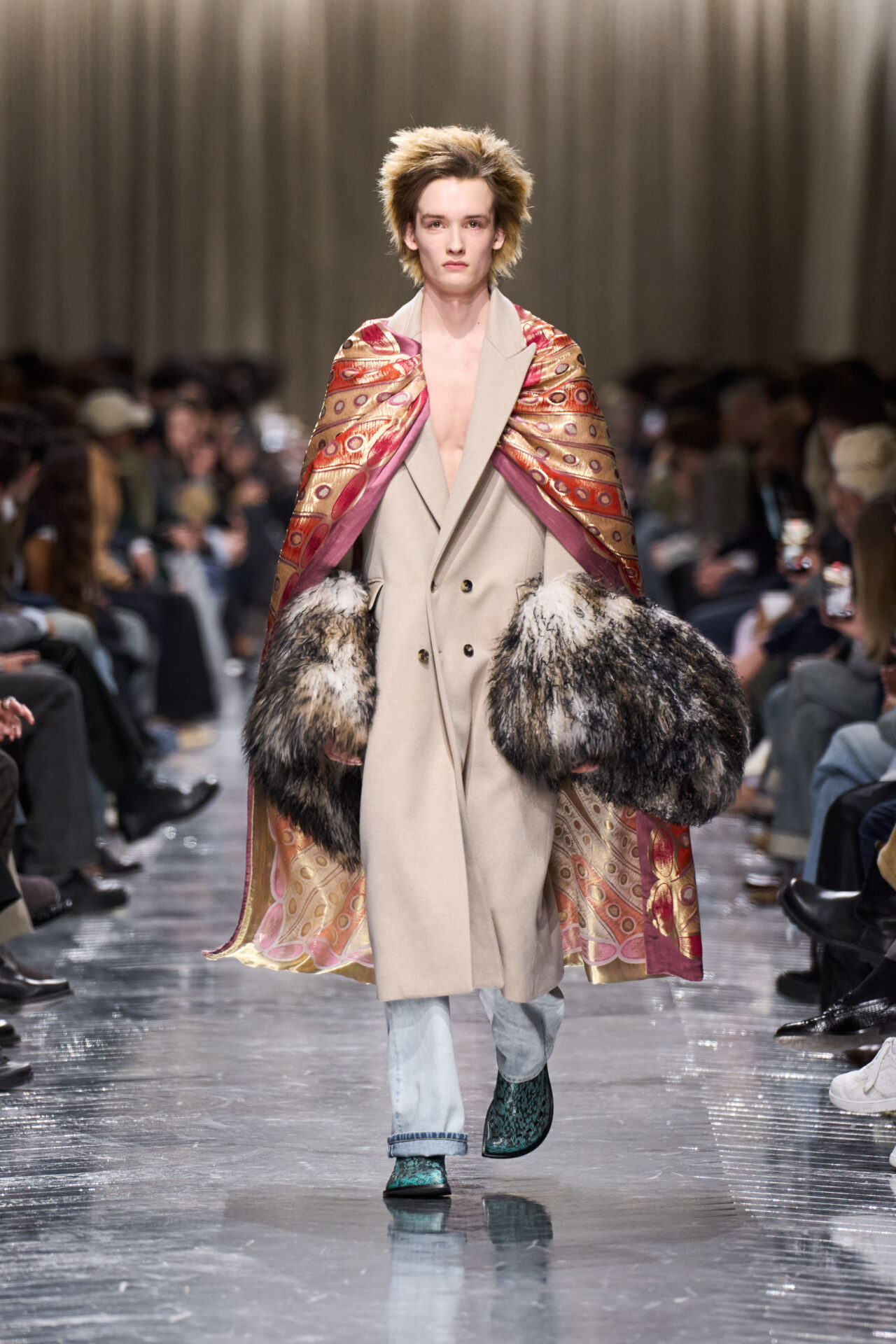 また別のルックでは、ムードボードやフロントロウにも登場していたロマンティック・ポップシンガー、マギー(Mk.gee)に着想を得たファーライン付きのパーカーが、グランジなムードを添えていた。そこに色落ちしたデニムのカーゴパンツが加わり、さらにルーズな佇まいを演出している。