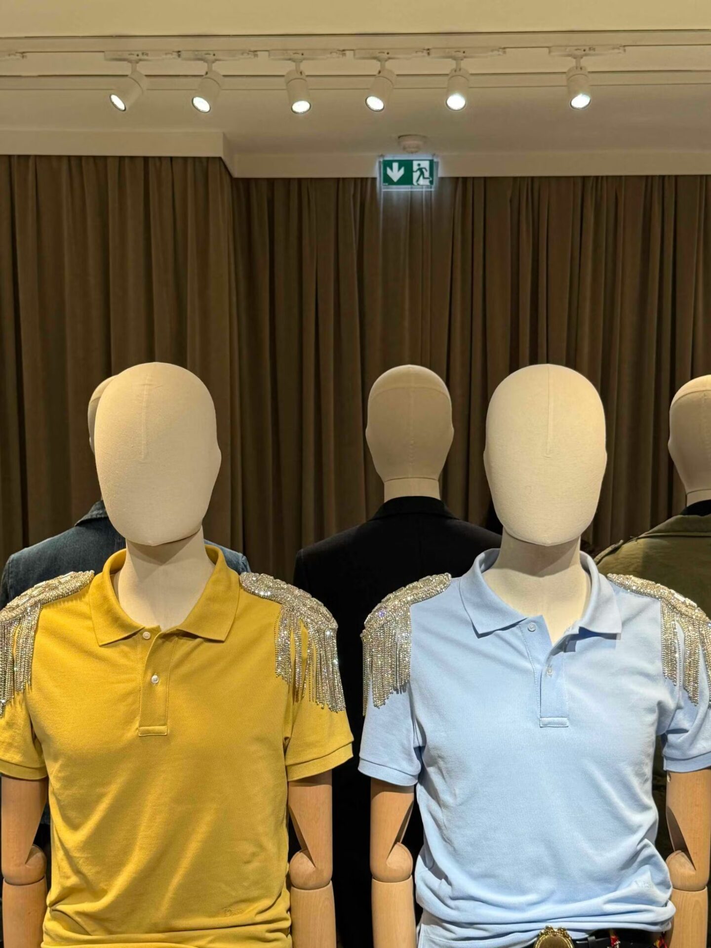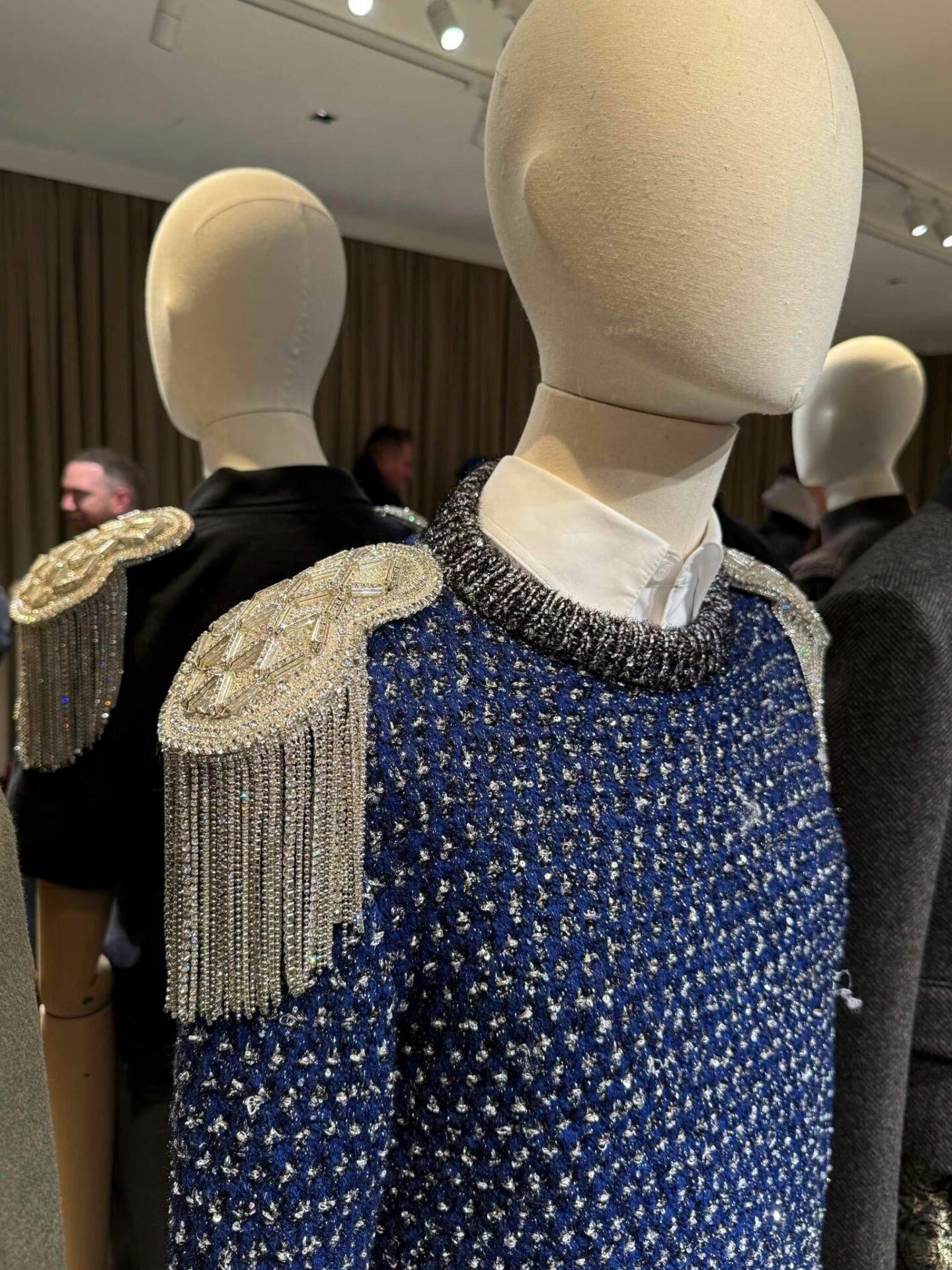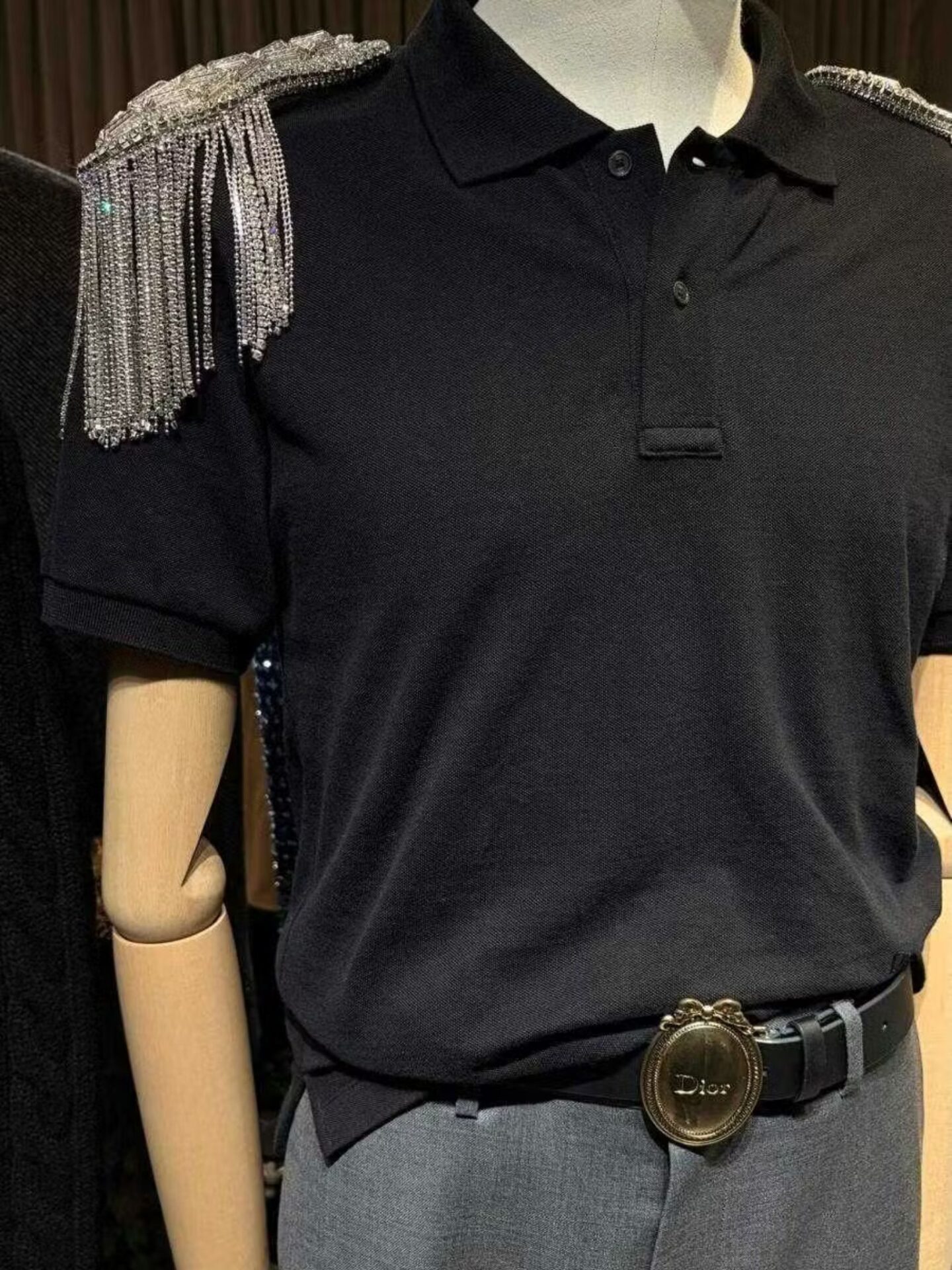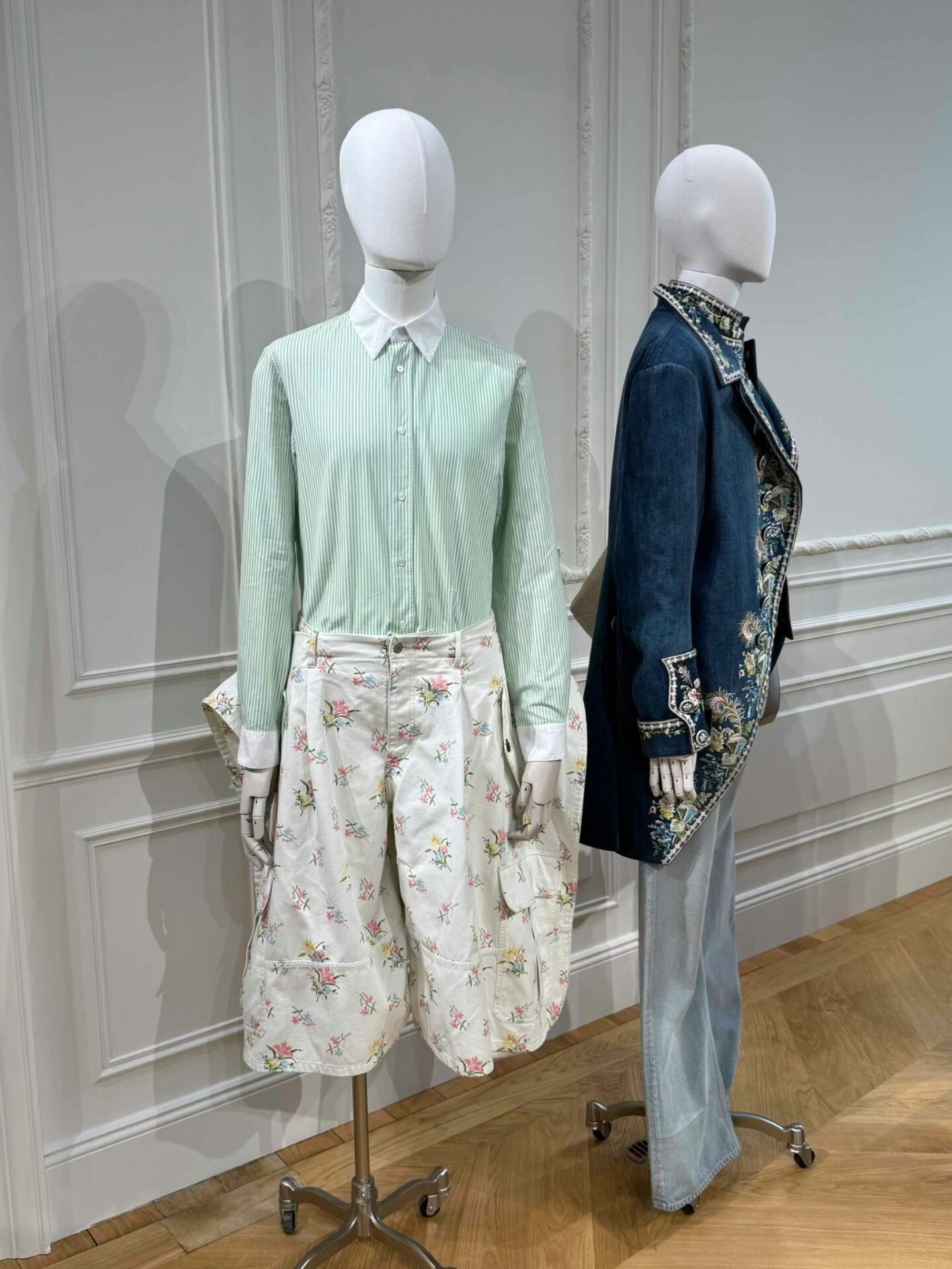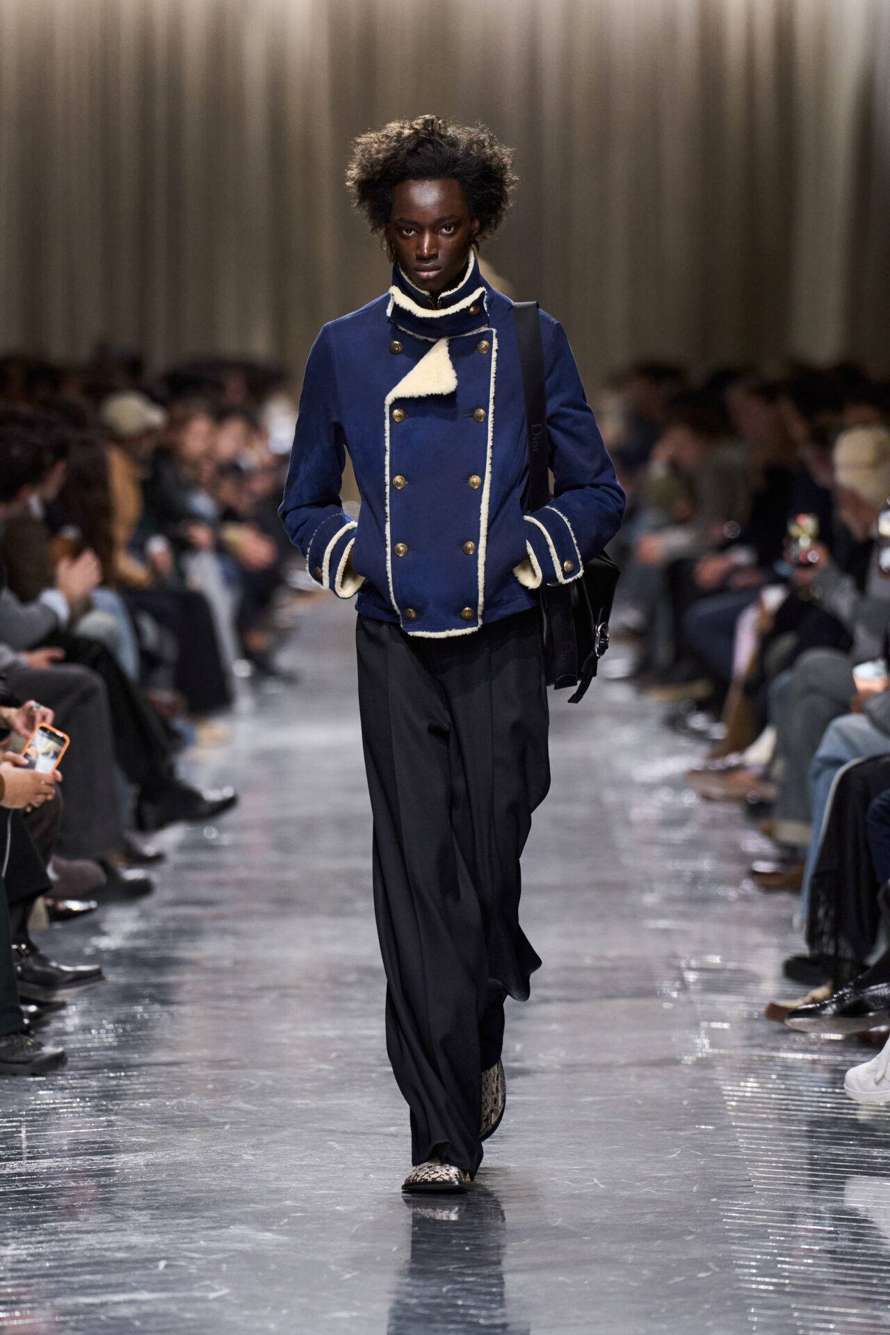 しかし、その狂騒の裏には、着やすいメンズウェアが数多く存在していた。これはショーの翌日、『HIGHSNOBIETY』がアンダーソンのジェンダーフルイドなコレクションを間近で見たことで明らかになった。そこには、リラックス感のあるポロシャツ(とはいえ、きらびやかな肩章が飾られている)に、プリーツの入ったスレートカラーのスラックスと、装飾的なベルトを合わせたルックがあった。ゴルフコースからナイトクラブまで、軽やかに行き来できる装いだ。