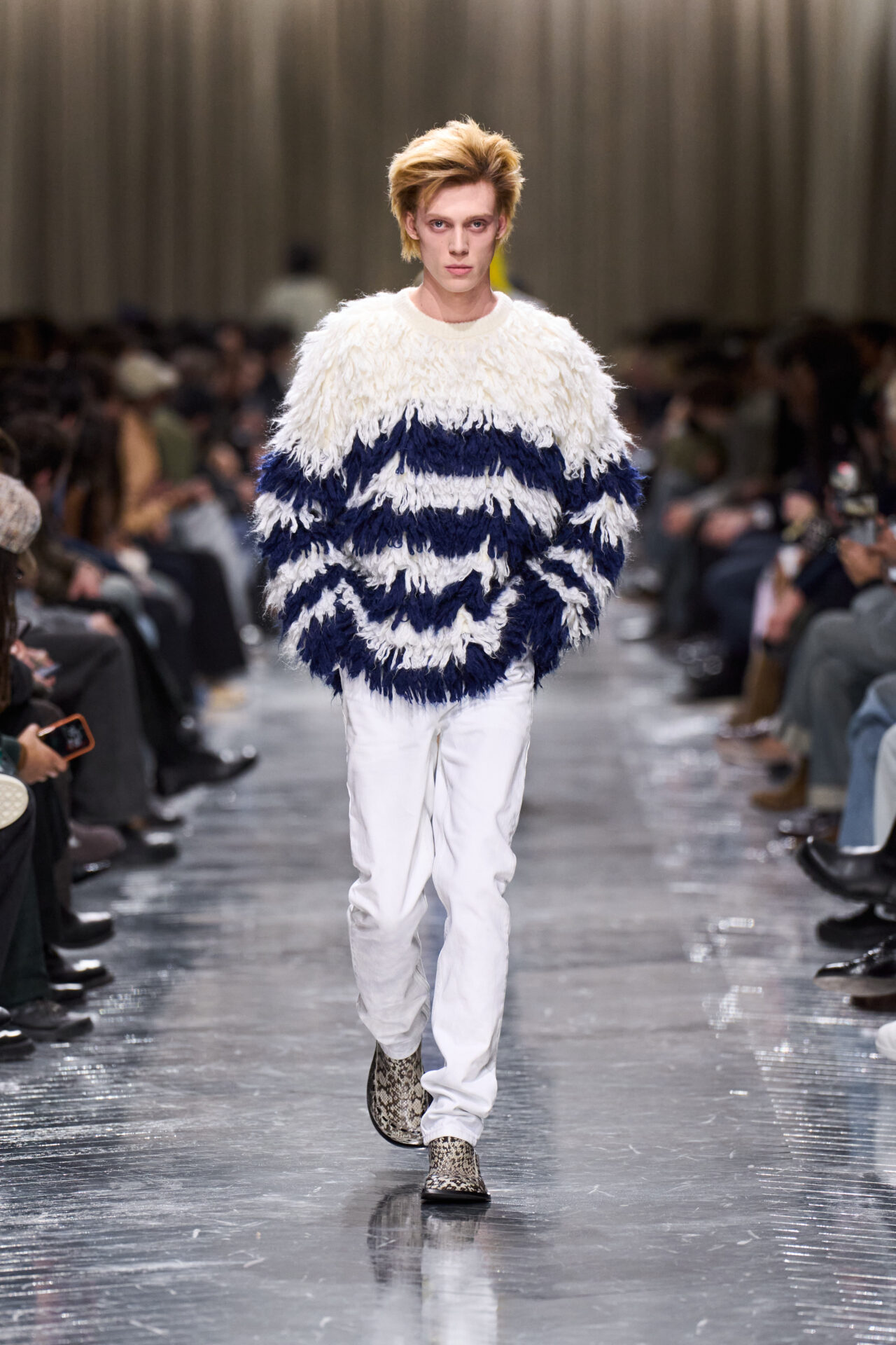 ジョナサン・アンダーソン(Jonathan Anderson)によるDior(ディオール)メンズの復活は、一目見ただけで頭をかき乱されるほどの衝撃だった。何しろ、モデルの3分の1以上が身に着けていたネオンイエローのヘアピースから、目を逸らせなかったのだ。一部の業界関係者が推測するように、おそらくあれは伝説的なスコットランド人デザイナー、パム・ホッグ(Pam Hogg)のトレードマークであるカナリア色の髪の毛へのオマージュだったのだろう。いずれにせよ、ヘアスタイリストのグイド・パラウ(Guido Palau)が手がけたこの人工的なヘアスタイルは、この先に待つ狂気を予感させるものだった。