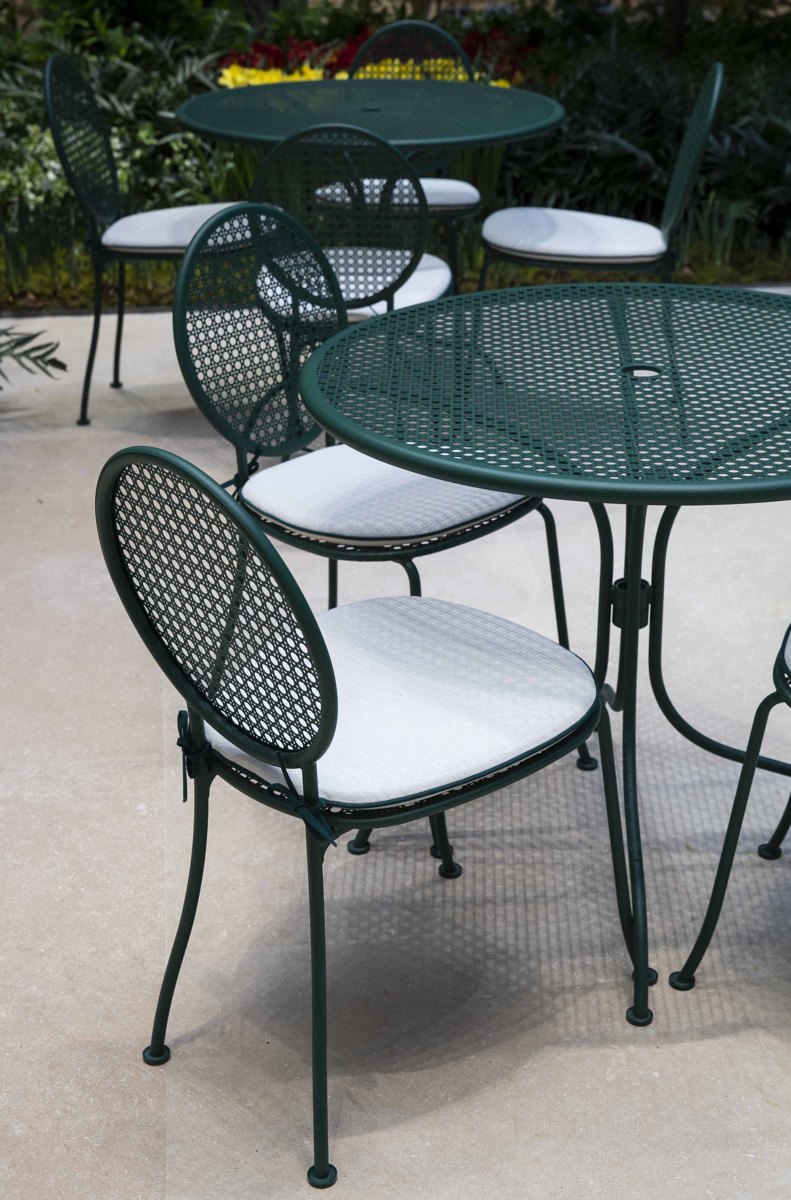 透かし彫りの「カナージュ」があしらわれたチェアやアームチェアはフランスのアール ドゥ ヴィーヴルの象徴であり、ブランドのアイコンでもある「メダリオンチェア」のオーバルシェイプを彷彿とさせる。グリーンメタルのラウンドテーブルとスクエアテーブルはフランスで制作されている。