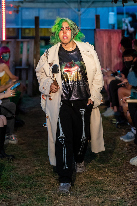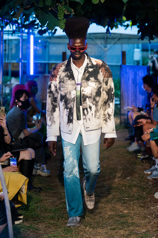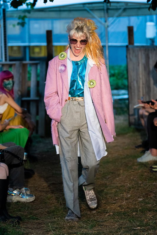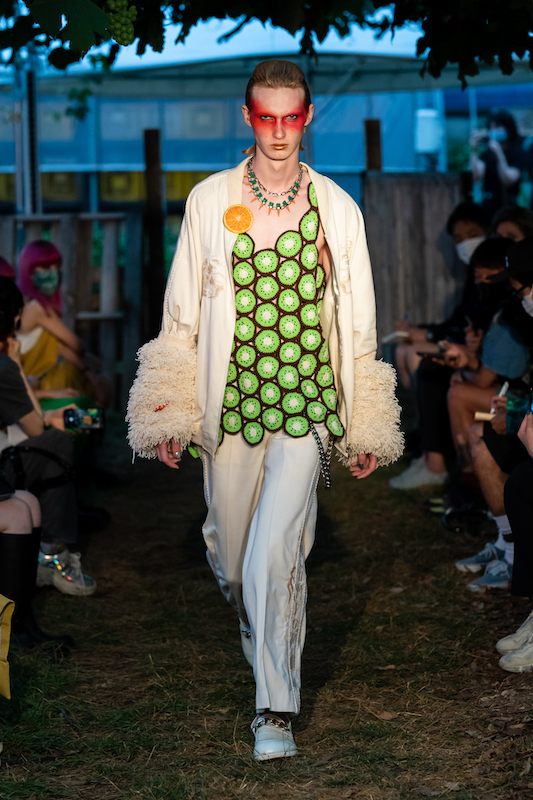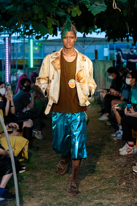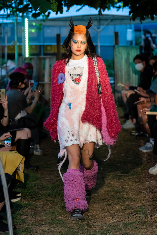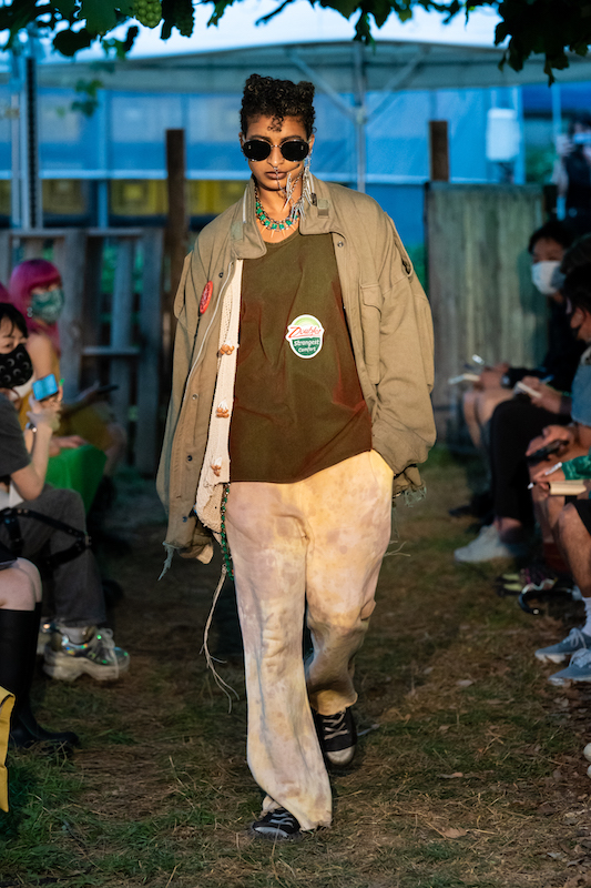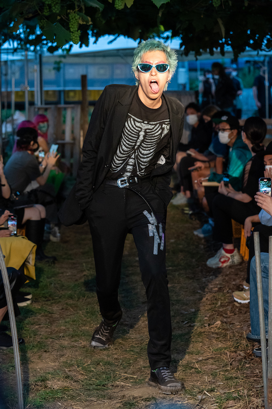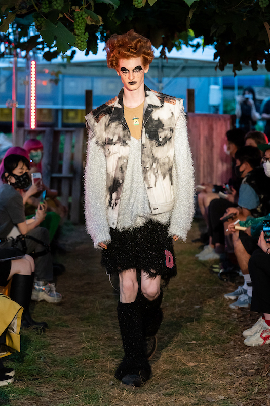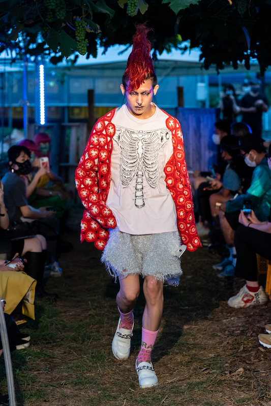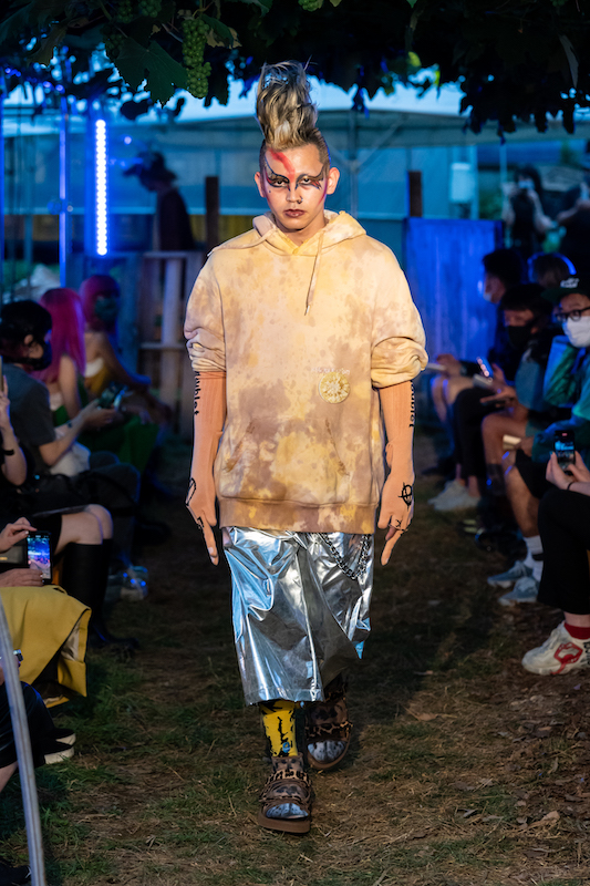 内容:「環境に良い素材や仕組みで作っている服だからかっこいい」という声に対し、「ファッションとはそういうものだったのか」と疑問がよぎり、環境に良い素材や仕組みの中で反抗的なパンクな服を作り上げた。食べ物や植物の加工後に出る廃棄物から染色し、廃棄されるバナナの茎をもとにした糸の使用、余り糸や玉ねぎの外皮、ミルクプロテイン、キノコの栽培技術の応用、古着やコロナ禍により需要が減少した「洋服の青山」のリメイクアイテムなども展開。