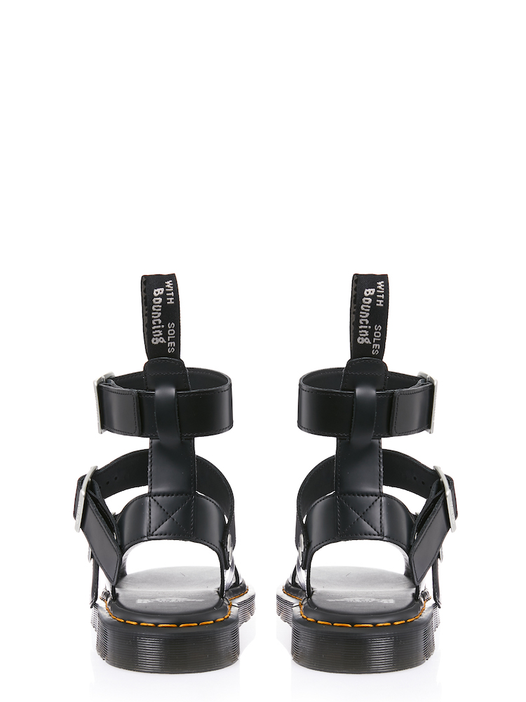 グラディエーターに着想したサンダル「グリフォン」をベースに、オウエンスの美学を反映するタフなブラックスムースレザーを採用。特別仕様のワイズのスモークショアソールを採用し、通常よりも長くデザインされたアッパーストラップとアンクルストラップはパラジウムのバックルで固定され、イエローステッチとブラック×パールのヒールループで仕上げている。