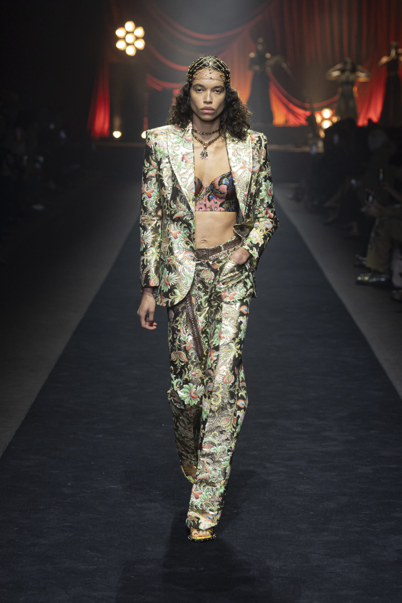 プリントや色彩の動きから着想を得て、変化し続ける「言語」としてのエトロを表現。ブランド創業当初から受け継がれる自由や反骨精神に、サイケデリックな感覚を融合させたスタイルを描き出している。フリルやフリンジ、クロシェ編みなどの軽やかなテクスチャーが繊細な表情を添え、光沢のあるテーラリングやジャカードのモチーフが鮮やかな色彩とともに際立った。