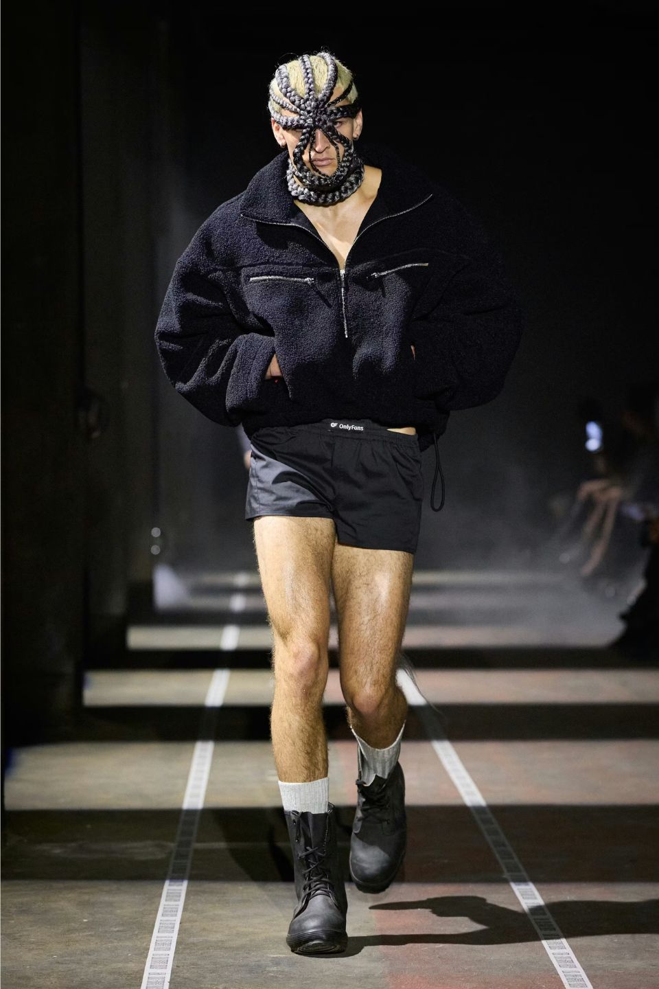 彼のレーベルは、多様なセクシュアリティを露骨に讃える表現で知られる印象が強いかもしれない。実際、2026年秋冬コレクションではOnlyFans(成人向けサブスクリプションサービス)とのコラボも行われた。しかしルイ・ガブリエル・ヌイッチ(Louis Gabriel Nouchi)は、同時に質の高い服作りを熟知したデザイナーでもある。新作コレクションは、リドリー・スコット(Ridley Scott)監督の『エイリアン』へのオマージュだ。フェイスハガーや歪んだ肉体といったモチーフは、ガーゼのように透けるテキスタイルで表現され、リプリーのジャンプスーツに着想を得た官能的なスーチングや、未来的な印象を与える力強いニットウェアが重ねられていた。