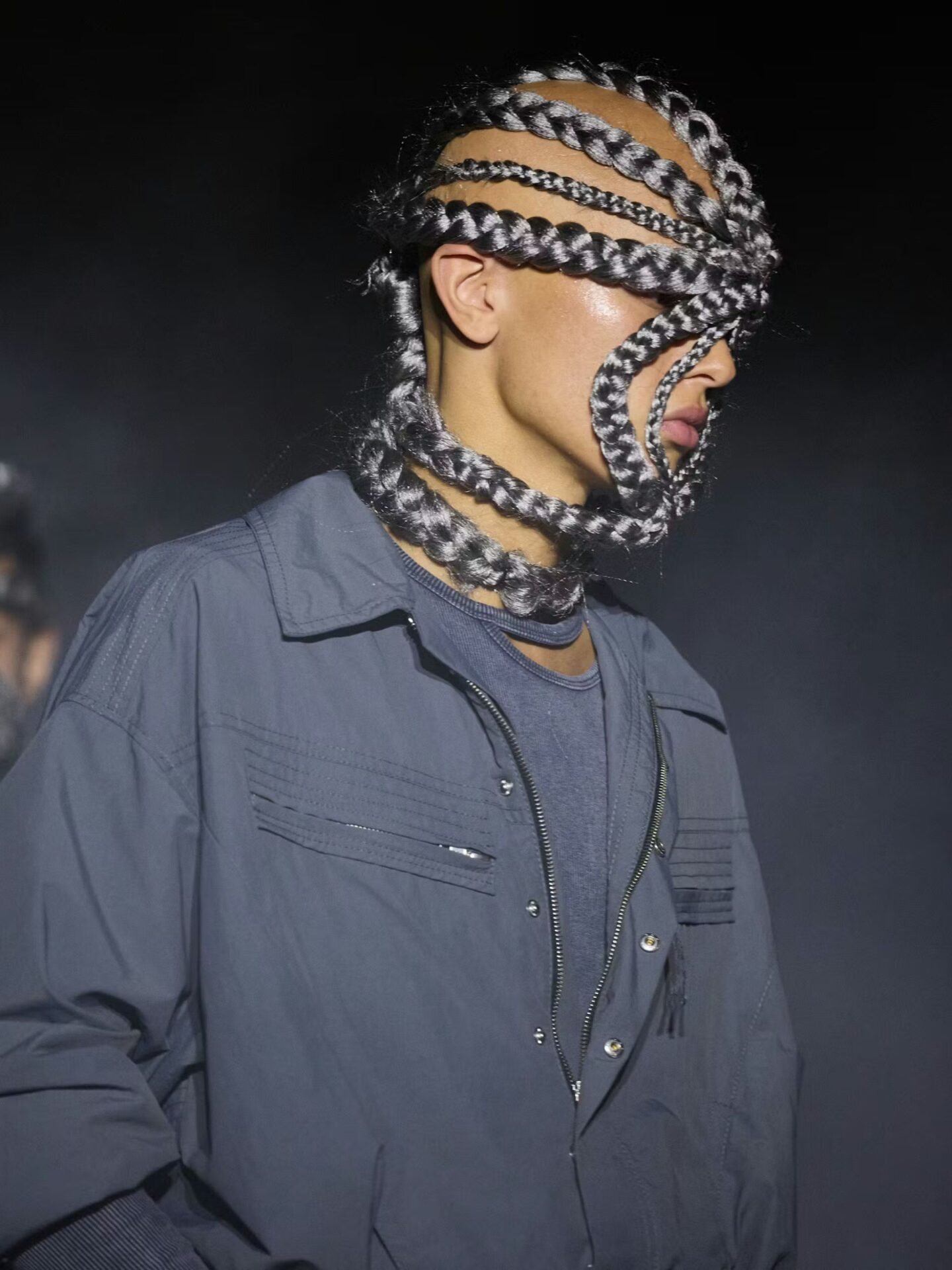 COMME des GARÇONSの創設者、川久保玲のシーズンごとの着想源を解き明かそうとすること自体、どこか傲慢ですらある。本人もまた、安易にカテゴライズされることを嫌う。稀なインタビューで問われても、影響も夢も欲望もなく、古い服を残す計画もなく、スタッフにアイデアを服に落とし込ませるつもりも一切ないと答える。(どこまでが本心で、どこまでが記者への牽制なのかは定かではない) それでもなお、ひび割れたホッケーマスクを被り、暗く歪んだ厳格なスーツに身を包んだCOMME des GARÇONS HOMME PLUS(コム デ ギャルソン オム プリュス)のモデル達を見ると、川久保が “なんらか” の状況について言及しているように感じざるを得ない。