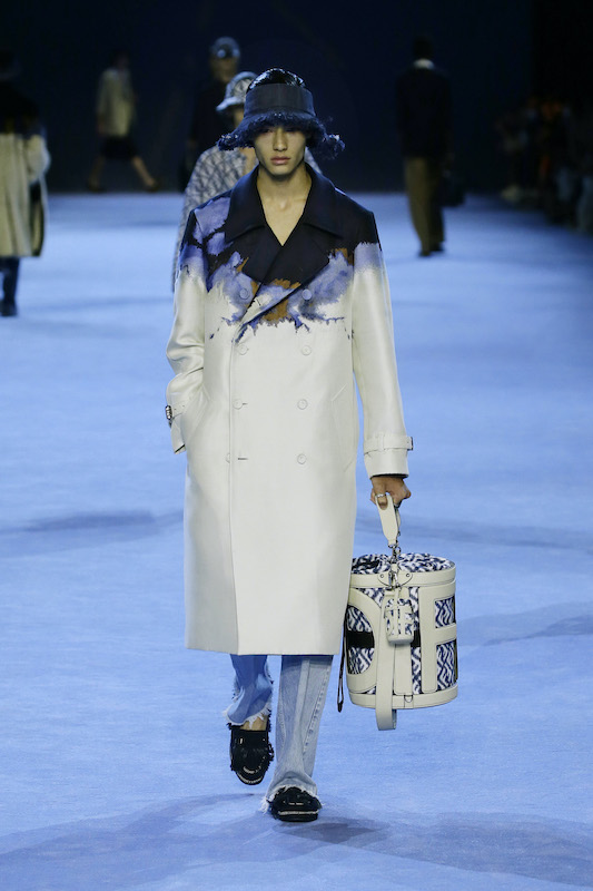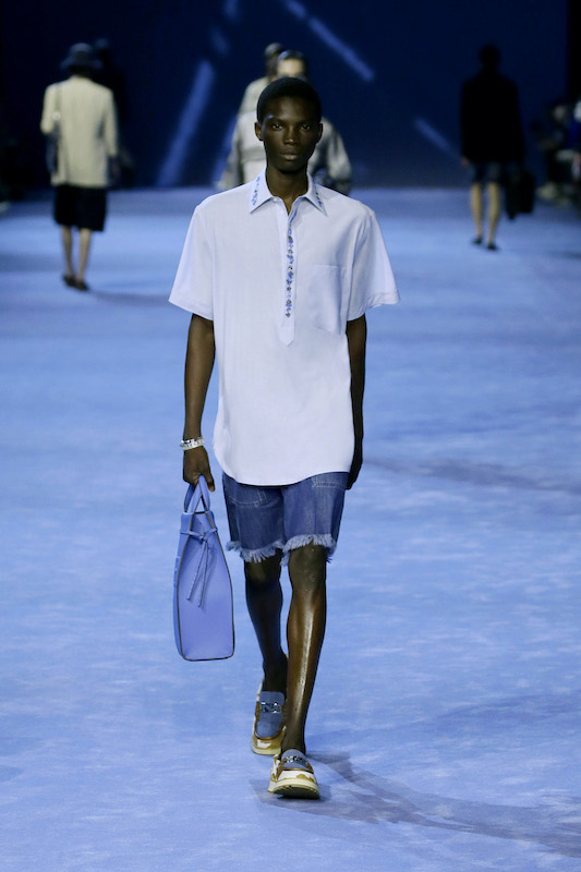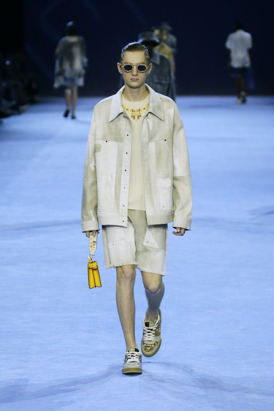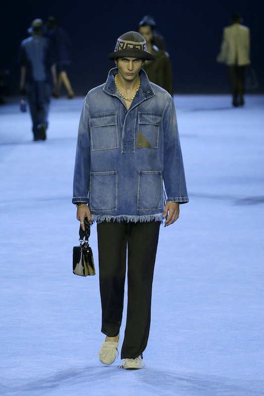 コレクション全体を通じて見られたデニムは、リアリティとファンタジーを融合。プラッシュのローブやコットンツイルのシャツジャケットにはトロンプ・ルイユプリントのようなデザインを落とし込み、ロングラインの5ポケットデニムをカットし、色あせた「フェンディ バゲット」バッグとトートを創出。ヘムラインにフェザーのようなデザインをあしらった軽くソフトなシャンブレーショーツも登場した。
