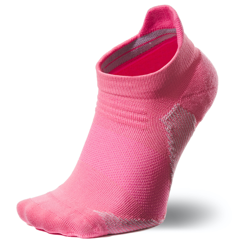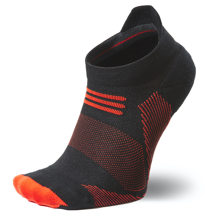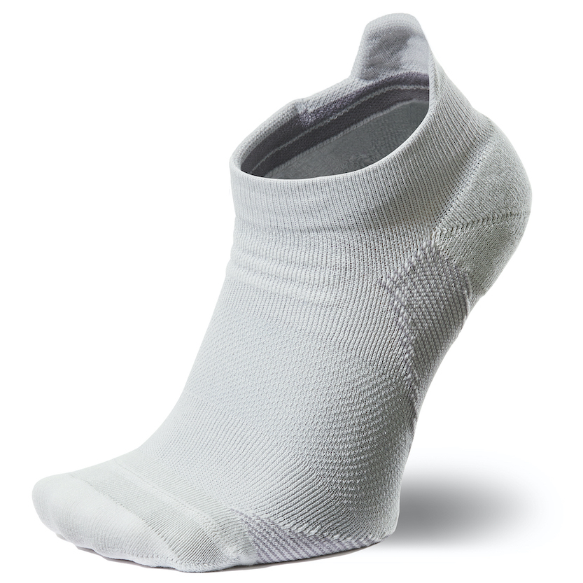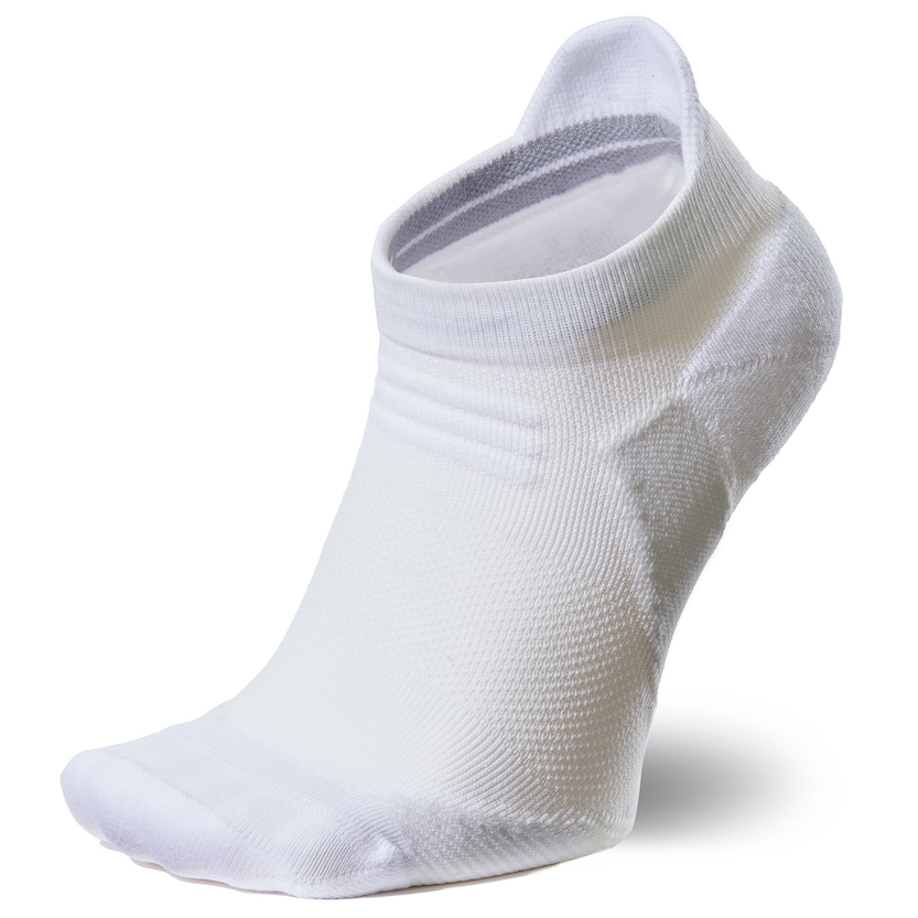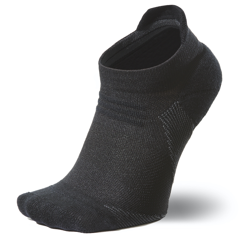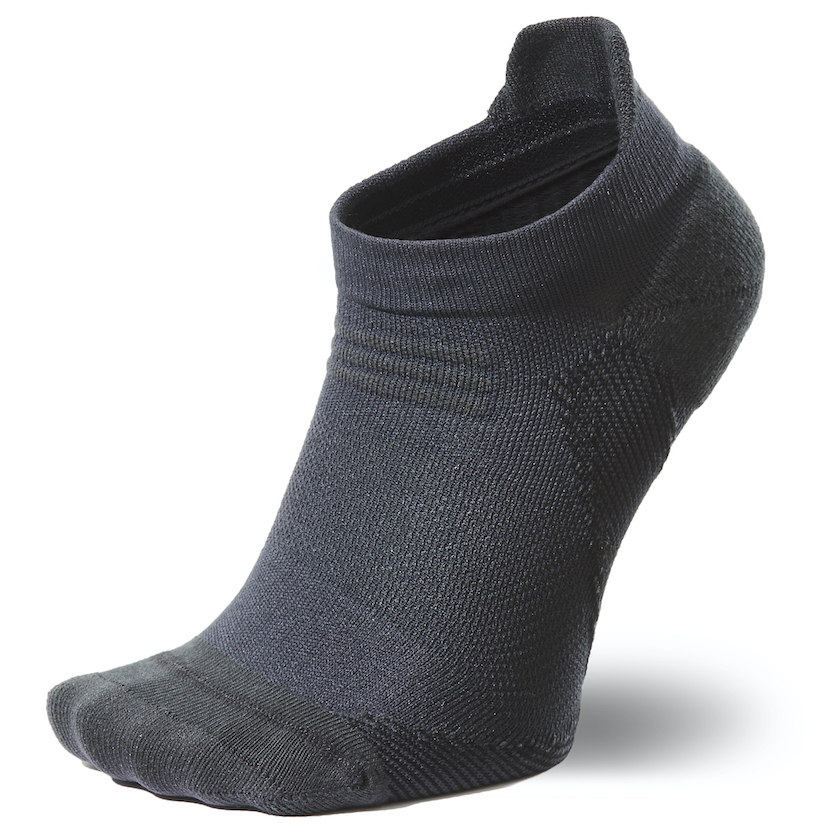 ソックス内側のつま先とかかと部分は、クッション性の高いパイル構造を採用。つま先は強度の高い糸で補強し、アキレス腱部分はシューズ内のズレによる当たりを軽減するよう少し長めに設計した。環境も配慮し、メイン素材はリサイクルポリエステル、爪先・かかと部分はリサイクルポリエステルとオーガニックコットンを使用。