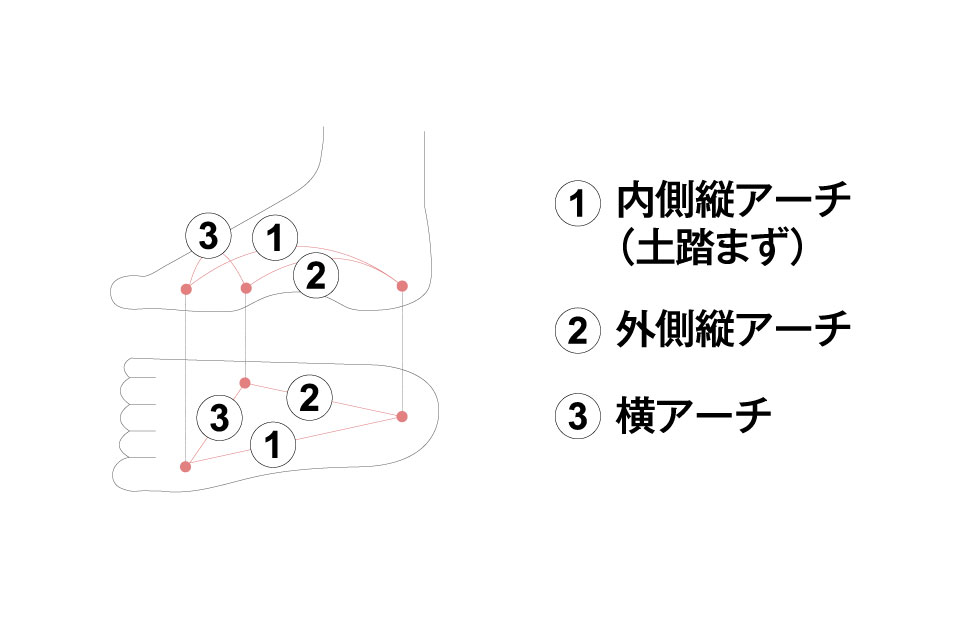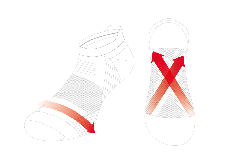 足裏にある3つのアーチをサポートするテーピング構造を持ち、足裏の内側縦アーチ、外側縦アーチ、横アーチをサポートして、足にまつわるトラブルの原因となりやすいアーチの崩れを軽減。アーチを支えることで、着地時に脚にかかる衝撃を吸収し、推進力をもたらすという。