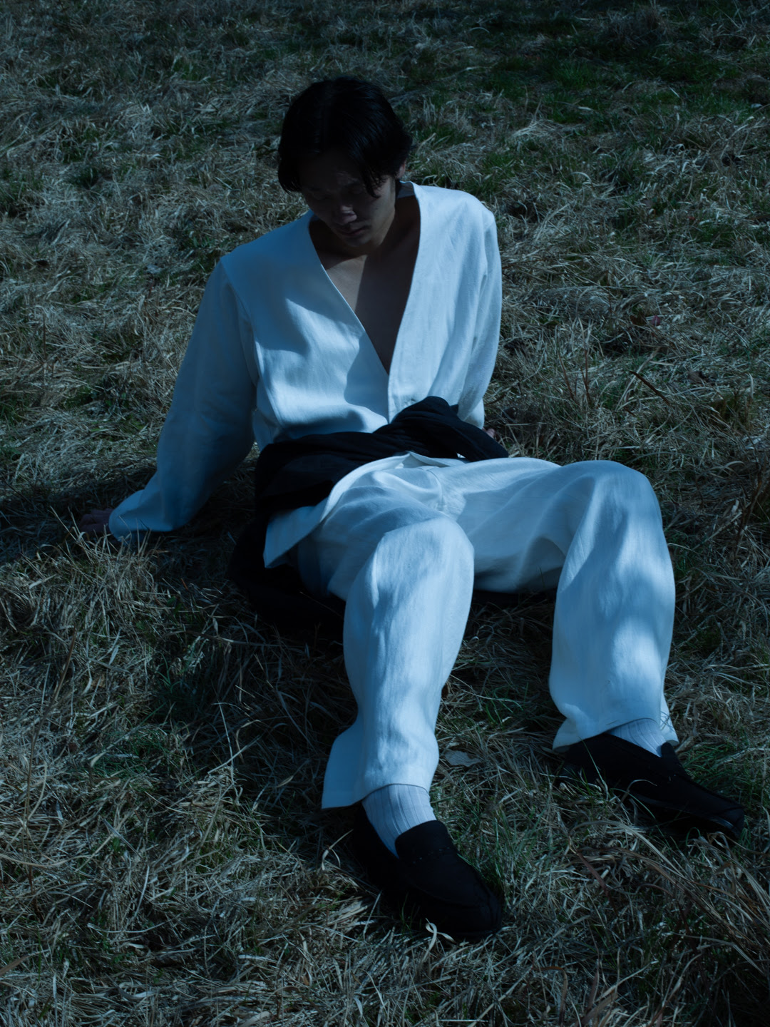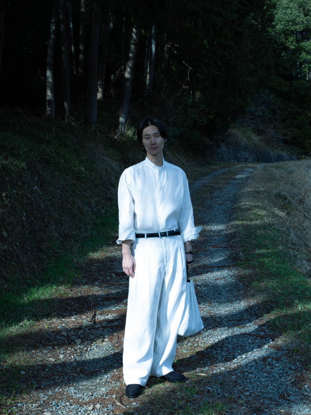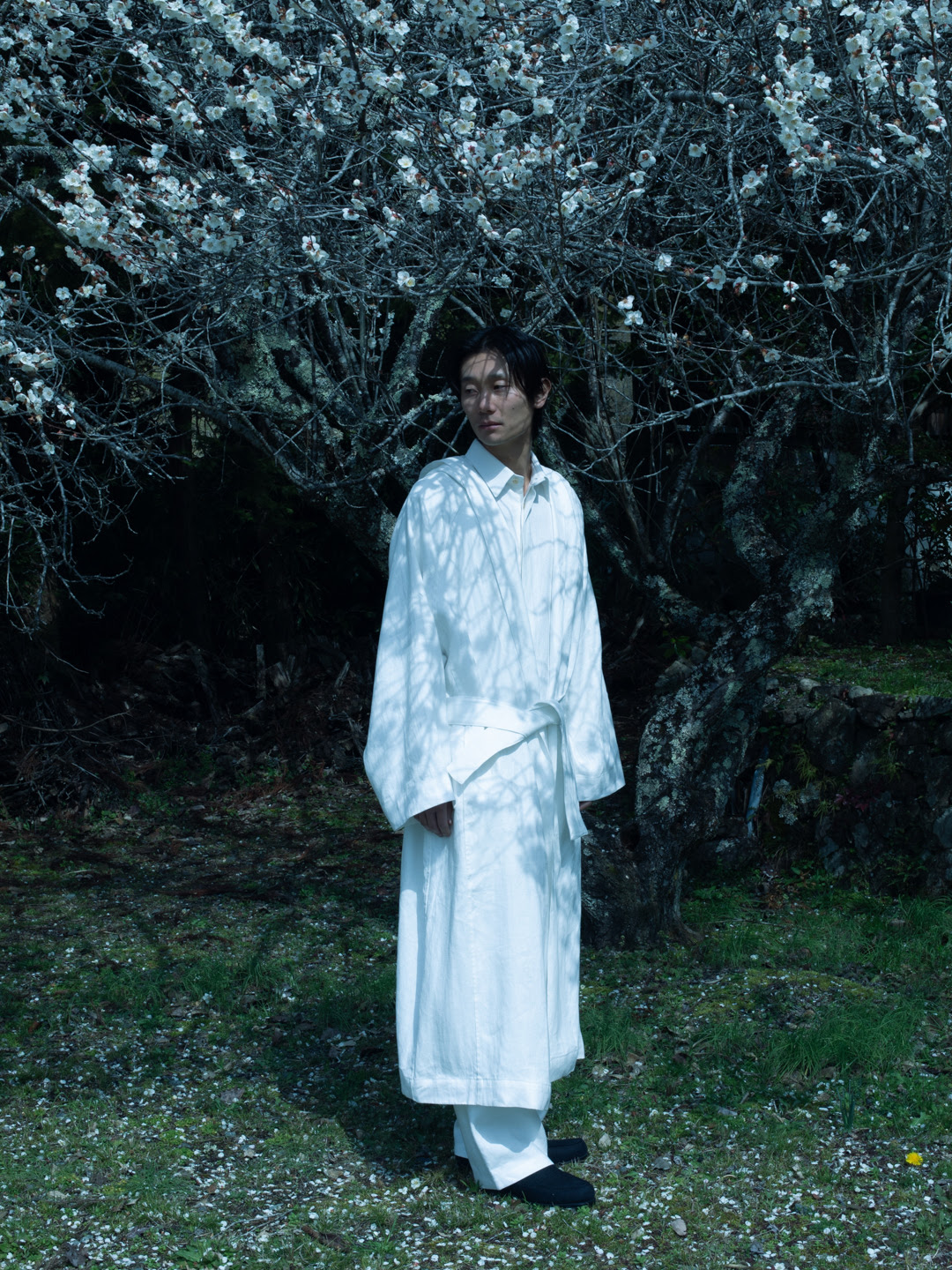 織物を通して素材と時間の関係を探求してきたHOSOOの思想を、衣服へと拡張。衣服を「形」ではなく「関係」として捉え、素材と体のあいだに立ち上がる関係性として表現する。
