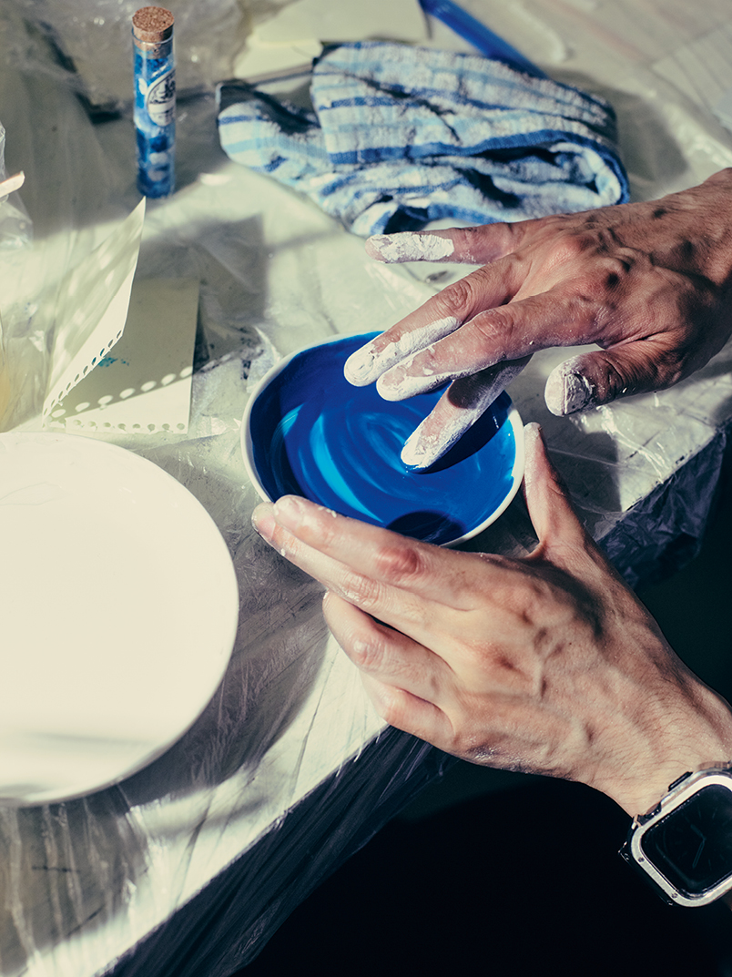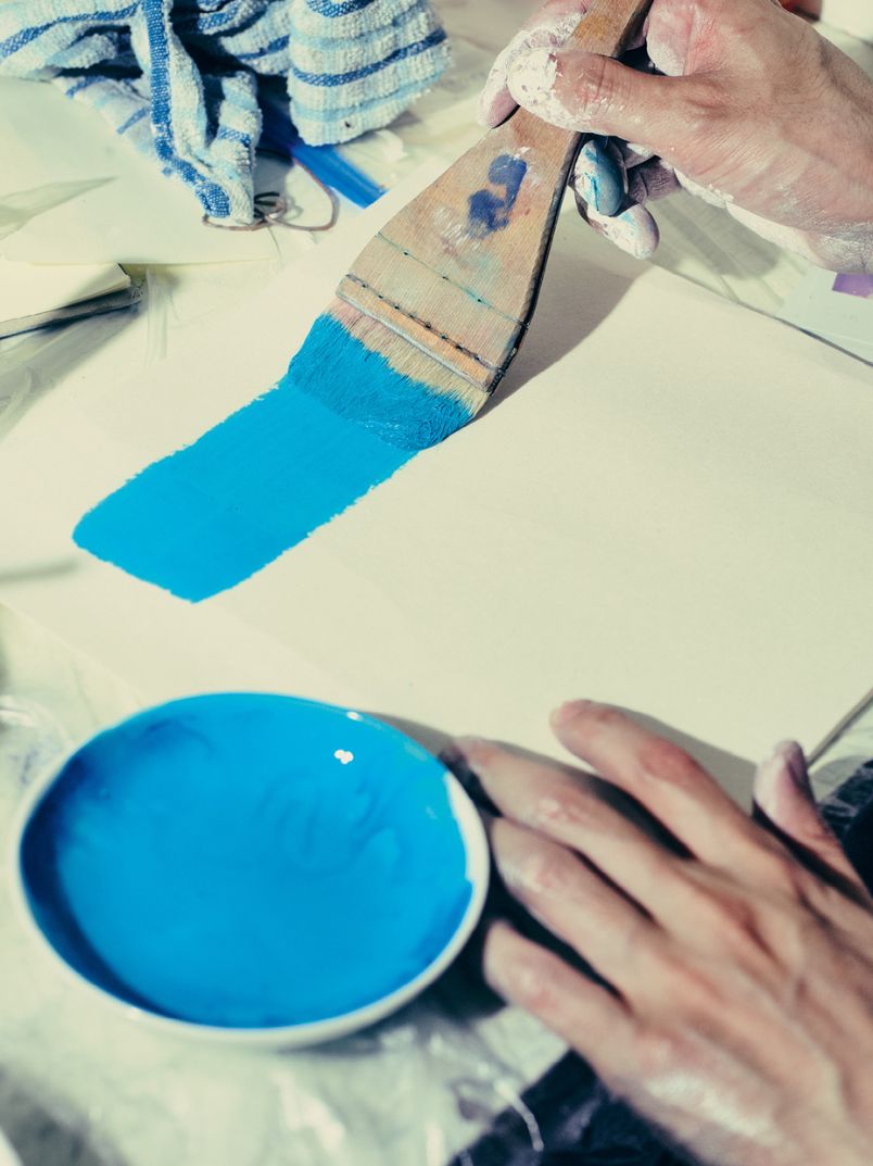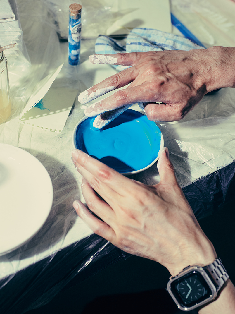 一色一色が一期一会です。いろんな顔料混ぜたり、化学反応を使い、湿度や温度によって色が全くコントロールできないんです。そこで気づくんです。この色だったら空を描いてみようとか、空の青を作ってたけど海の青になったとか。そういう制作を毎回やっていけるので、アンコントロールの部分を楽しめる。だから自分で強制しないで済むんですよ。無理にコントロールしようとしないというか、少し任せる部分が多くなる。それを受け入れることの方が重要で。そこは本当にスケーターと似ているんです。