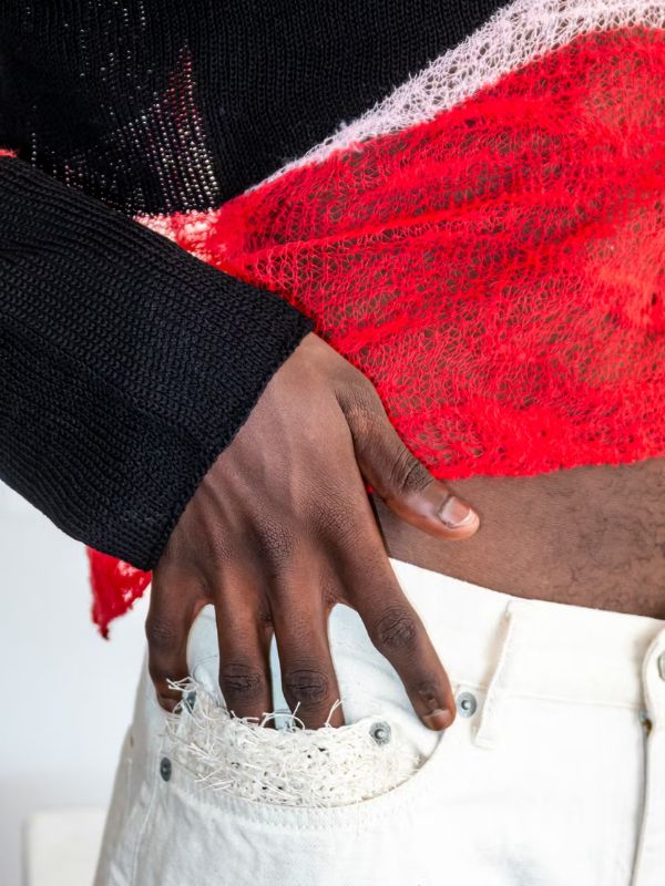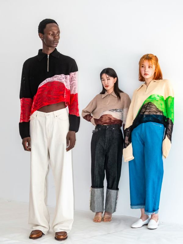 彼の作品の中には、不規則な編み目や手編みのアイテム、大きな穴が開いているものや、オフショルダー、落とした裾、そして敢えて処理をせずに残された糸端などが見られる。別の作品では、強くねじられた糸やふわふわした糸、スラブ糸、そして不均一な糸などが用いられ、それらは珍しい染料による鮮やかな色彩をまとっていた。また、2026年春夏コレクションでは、CWU-36Pのボンバージャケットをニットウェアとして再構築したことで、本来は内側にあるはずの鮮やかなオレンジの裏地が透けて見えるように仕立てられていた。