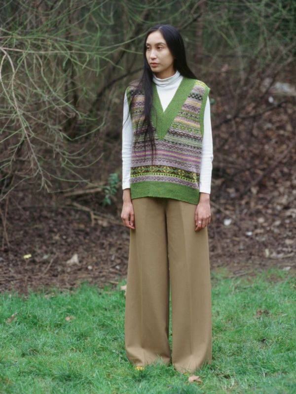 1890年代から続く家族経営のニットウェアブランド、スコットランド生まれのJamieson’s(ジェイミソンズ)との継続的なコラボにおいても、同様のことが起きている。具志堅は、同ブランドが誇るシェトランドウールを用いたいくつかの作品を手がけてきた。そのひとつがリバースステッチ・フェアアイル ジャンパーで、縫い目を敢えて表に出すことで、「裏返し」たような表情を作る。もうひとつはジャンパー風スカーフ。片方の袖を縫い合わせていないため、クロップド丈のセーターとして着ることも、首に巻くこともできるハイブリッドな一着だ。「Jamieson’sのスタッフが最初にデザインを見たときは、『こいつ、一体何をやってるんだ?』という反応でした」と具志堅は語る。「でも、最終的な仕上がりには気に入ってもらえました」