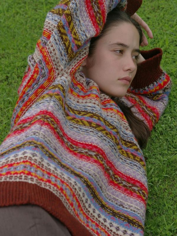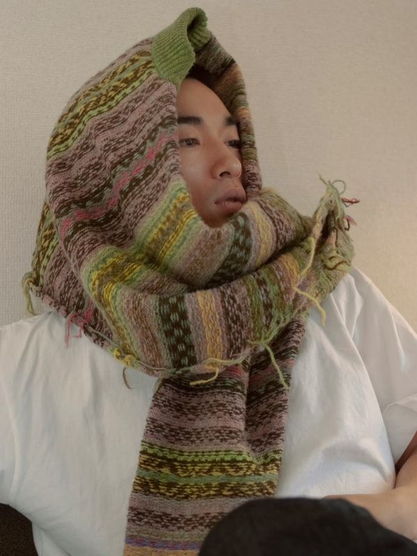 1890年代から続く家族経営のニットウェアブランド、スコットランド生まれのJamieson’s(ジェイミソンズ)との継続的なコラボにおいても、同様のことが起きている。具志堅は、同ブランドが誇るシェトランドウールを用いたいくつかの作品を手がけてきた。そのひとつがリバースステッチ・フェアアイル ジャンパーで、縫い目を敢えて表に出すことで、「裏返し」たような表情を作る。もうひとつはジャンパー風スカーフ。片方の袖を縫い合わせていないため、クロップド丈のセーターとして着ることも、首に巻くこともできるハイブリッドな一着だ。「Jamieson’sのスタッフが最初にデザインを見たときは、『こいつ、一体何をやってるんだ?』という反応でした」と具志堅は語る。「でも、最終的な仕上がりには気に入ってもらえました」