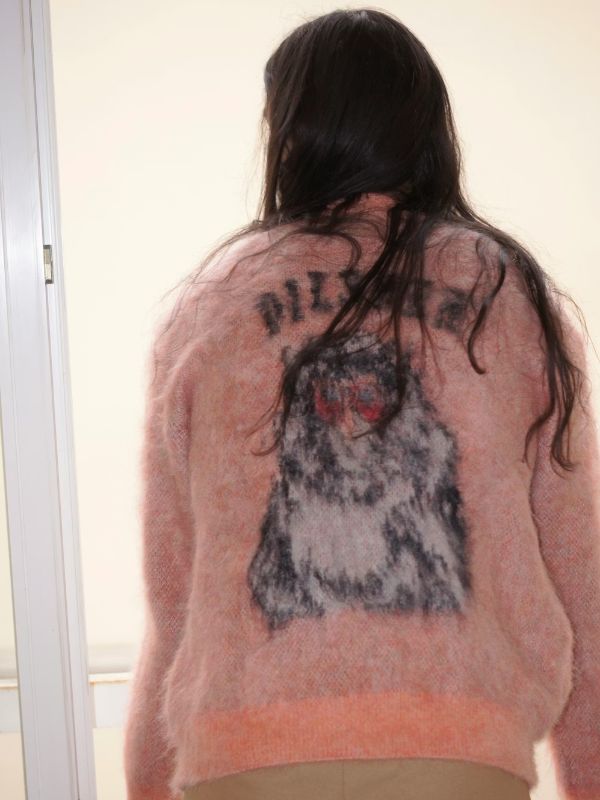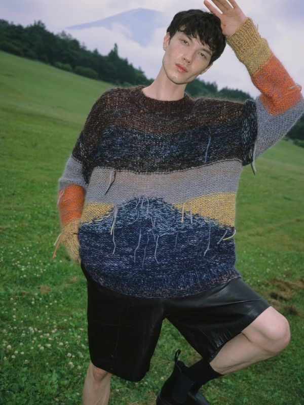 これは彼のニットウェアに対する遊び心とユーモアをよく表している。各コレクションはいずれも彼の日常に根差しており、作品の多くはそうした何気ない出来事を文字通り描いたものだ。2024年秋冬コレクションのふわりとしたモヘアのカーディガンには、背中に1匹の猿があしらわれている。それは、かつて新潟のパブで目にしたビールポスターのイメージをもとにしたものだ。別の2つのジャンパーには、2022年1月1日の夕暮れと夜に、自宅の窓から見た富士山がそれぞれ描かれている。