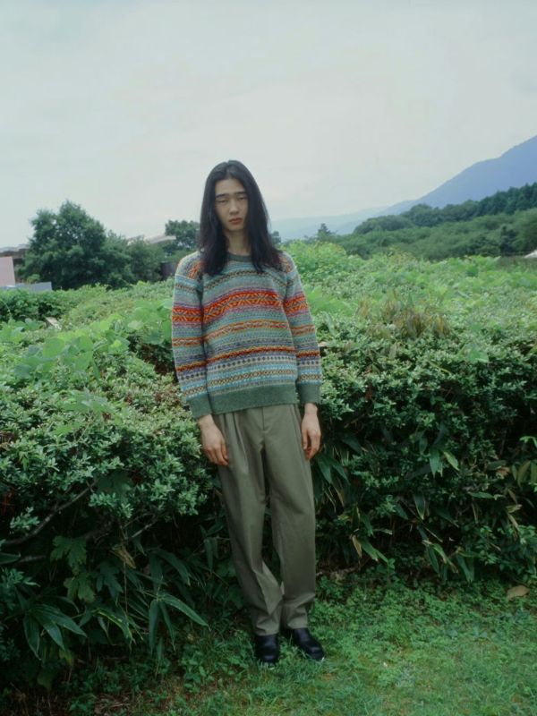 中国の新進気鋭のブランドでのお披露目の機会が白紙になった後、具志堅は独立を決意した。「ほとんど無一文に近い状態でした」と彼は振り返る。「だから、次のコレクション(2019年秋冬)に取り組みながら、日中は仕事をかけ持ちしていました」。このとき初めて、彼は全ての作品を自らで編むのではなく、日本の工場と共に政策を行った。その変化は、彼の創作の自由を制限するどころか、むしろ大きく押し広げることになる。「自分の技術的な制約から解放されたことで、デザインのアイデアをさらに追求できると気づいたんです」。その一例が、彼が頻繁に採用する編み技法「インターシャ」だ。モチーフを生地の上に重ねるのではなく、生地の中に直接「描き込む」技法により、鮮やかな色彩のパターンを成立させる。