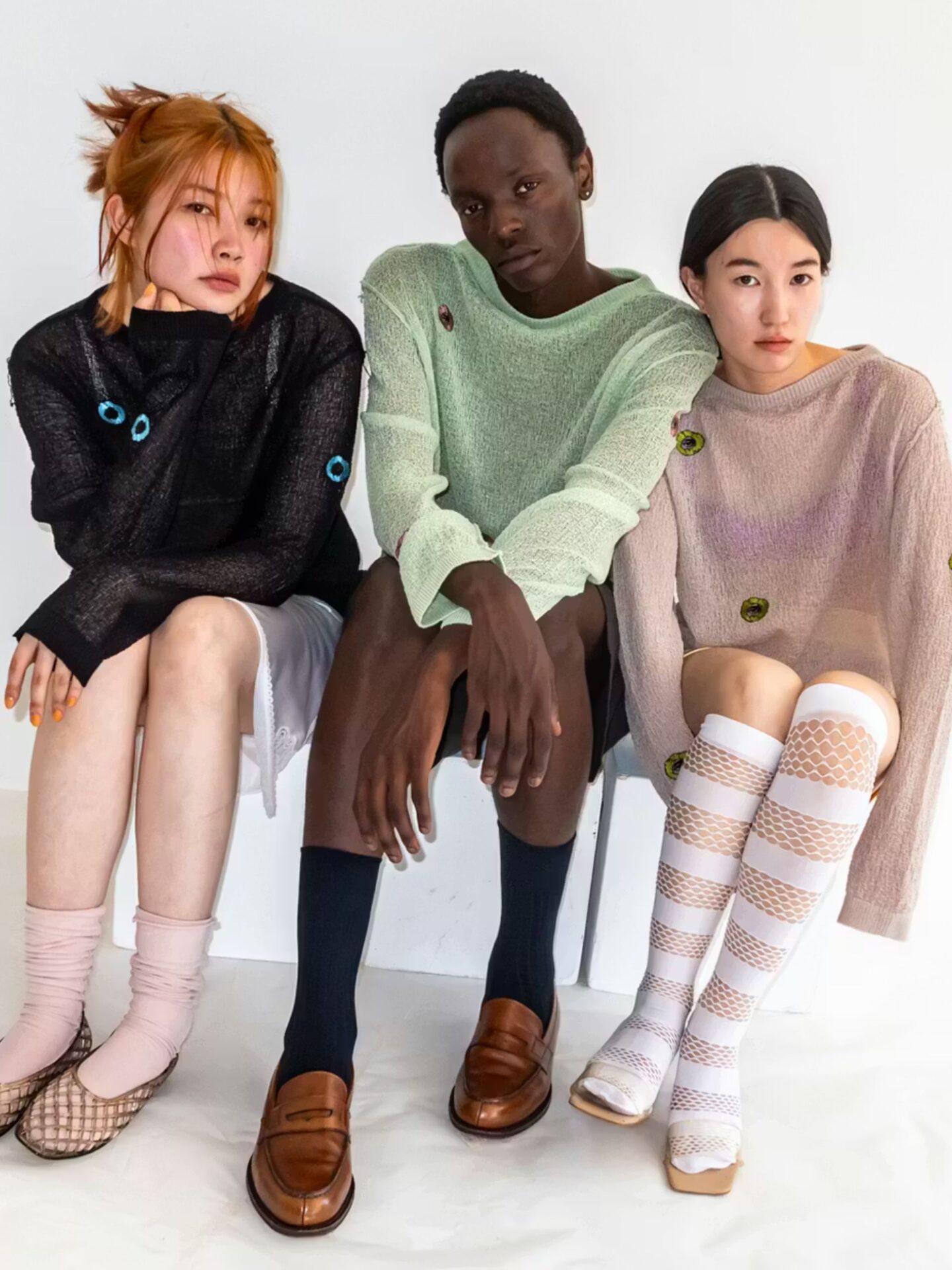 2019年に自身の名を冠したブランドを立ち上げて以来、具志堅はそうしたある種の切実さを自身の代名詞としてきた。奇抜ながらも着やすい彼の服は、ニットウェアの世界におけるほぼ全てのルールや慣習に、どこか逆らっているようにも見える。「ニットがとにかく好きなんです」と彼は言う。「というのも糸そのものから糸の組み合わせ方、編み方の技法、パターン、質感、色、デザインに至るまで、あらゆる要素に自由があるから」