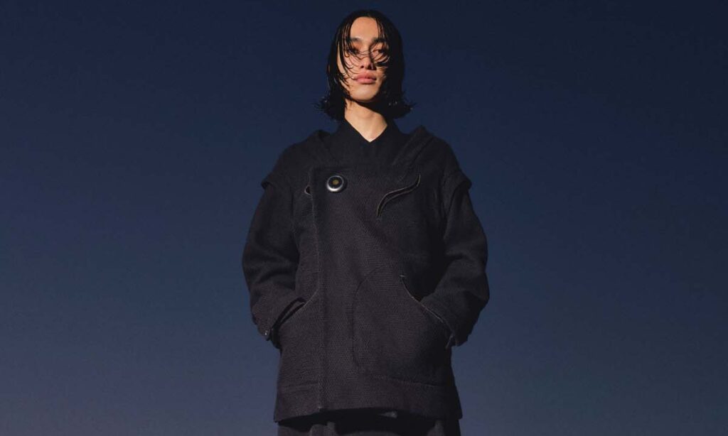 キールックス:ミッドナイトブルーの生地に花柄のパターンが隠れる(スライド1)。グラフィックTシャツや書道をデザインに加えたベルトも注目のルック(スライド13)。
