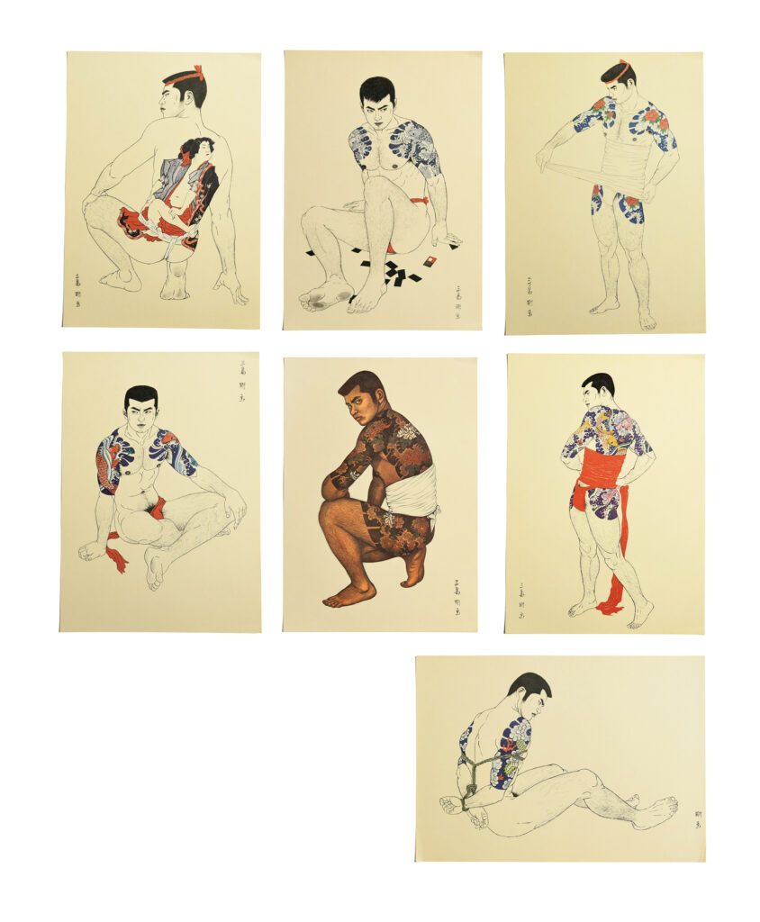 三島剛が描く、浮世絵を彷彿させる力強い作品群に魅了されて画集の出版を即決した伊藤文學氏は当時を思い返す。「三島剛っていう人はヤクザみたいな人だと言われていたんだけれど、実際はすごく綺麗好きな人なんだよね。食器なんかもすごく綺麗に整えてあって。本職はね、京都のお人形の顔を描いていた。人形は顔が命、一筆で描かなきゃいけないわけ。毛が一本一本丹念に描かれた原画を見たときは感動したね」。『薔薇族』での活躍後、雑誌『サブ』のアイコンとなるほど三島の画力は凄まじいパワーを持っていた。真っ白な背景にふんどし一丁で立ちはだかる漢の勇ましい立ち姿。体毛が繊細に再現され、隆々とした筋肉に入った芸術的な和彫りがつぶさに描かれている。一筆一筆に執念を感じさせ、見る者の心を掴む。まるで忸怩(じくじ)たる思いを強いる社会への報復として、秘めたる情念を注ぎ込んでいるかのようだ。