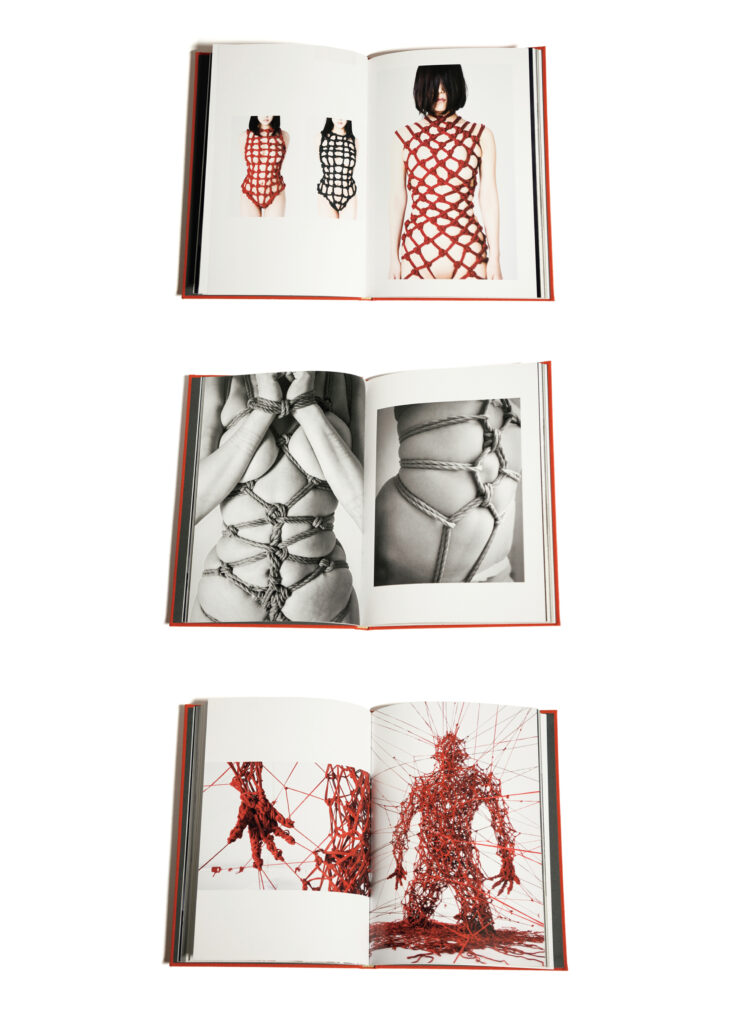 緊縛も日本に起因する芸術のなかでタブー視されながら、ファッションとの親和性を深く持つ文化だ。日本を代表する写真家の荒木経惟氏は緊縛を写真表現の一部に取り入れ、さらにそれをファッションフォトグラフィーの文脈と組み合わせることで、モードと日本の伝統芸術に接点をもたらした第一人者である。1963年にデビューし、雑誌『SMスナイパー』での連載企画にて緊縛をテーマにしたポートレート写真の新しいアプローチを見出した荒木。彼にとって緊縛とはエロスを表現するためのひとつのメソッドでありながらも、性的な欲望を開放するためではなく、ときに被写体の演戯欲を叶えるドラマティックなショーであったという。縛りという手法の完璧性に従わず、あえて不完全さや人間らしさをありのままに表現した親密なポートレートは、現在も世界中から高い評価を受けている。