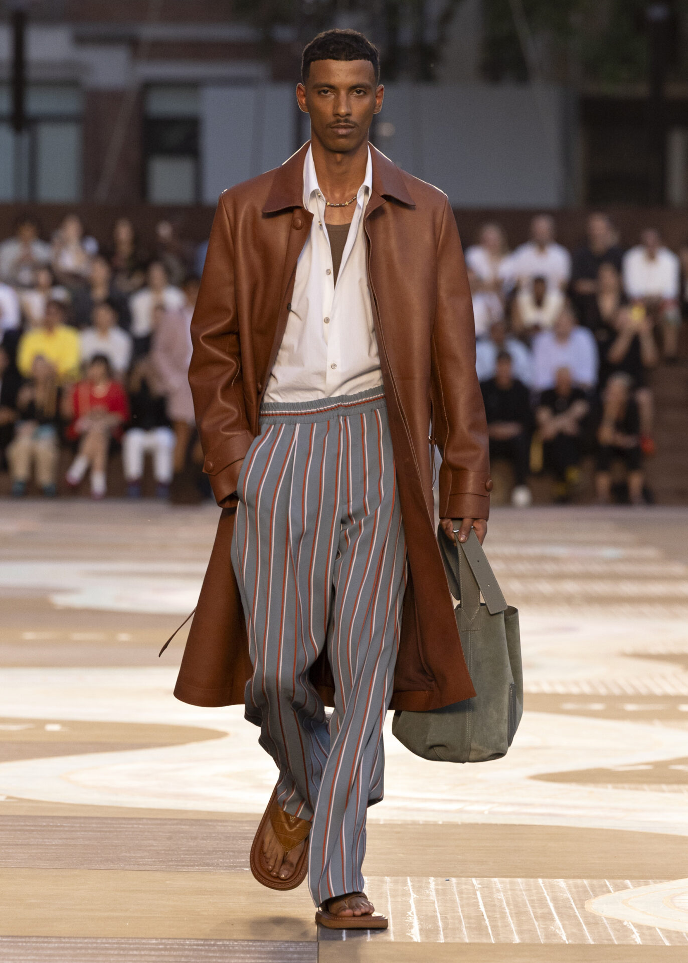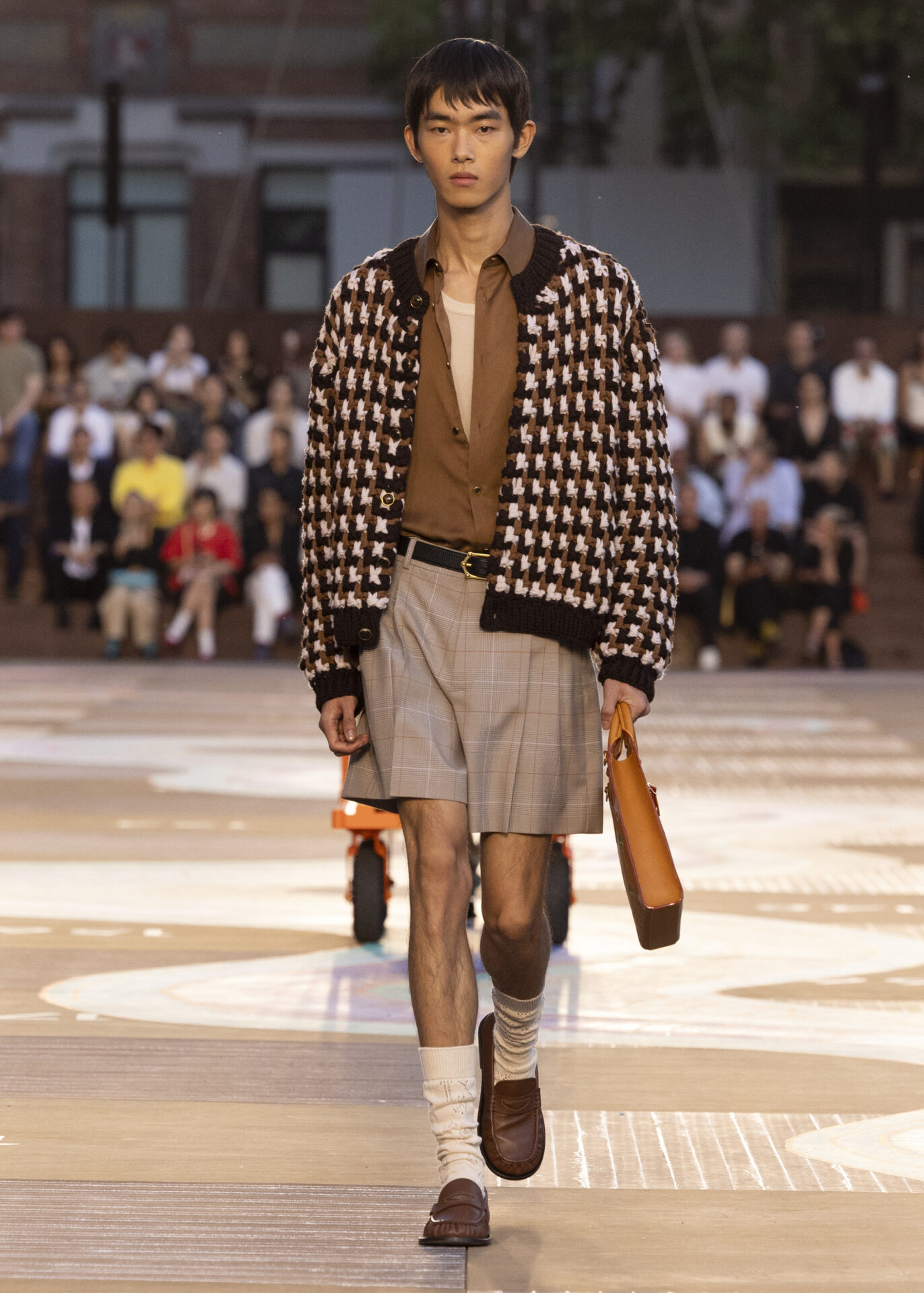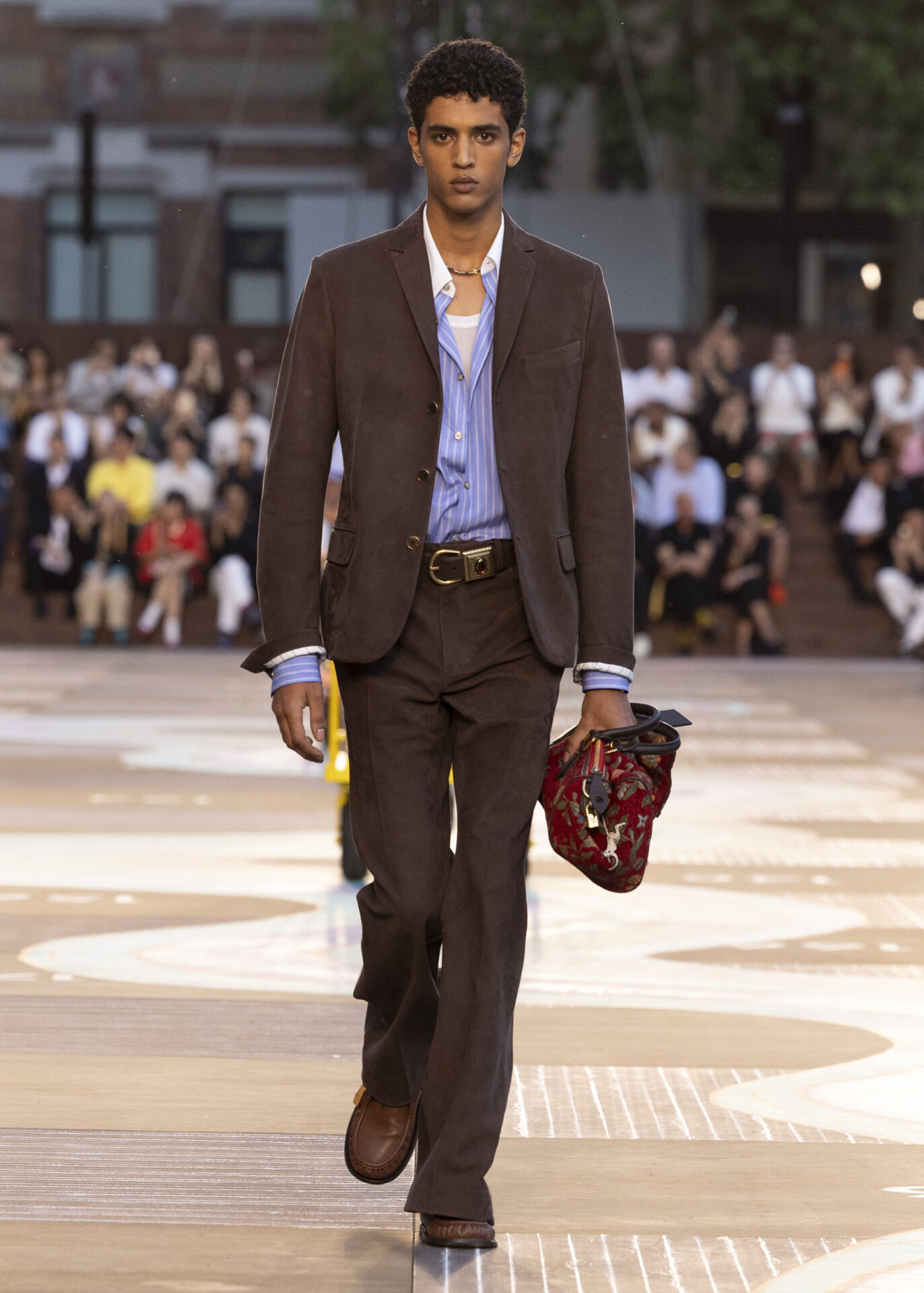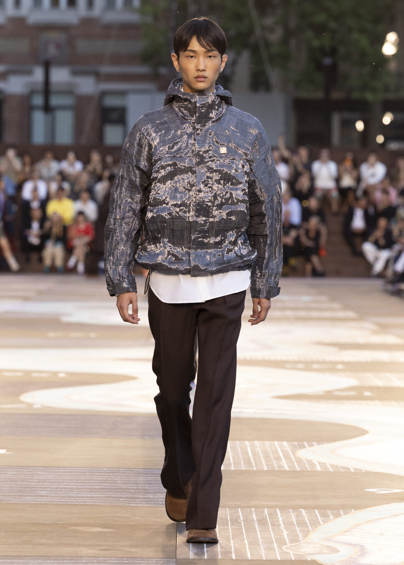 LOUIS VUITTONによると、コーヒー豆の色味を表現したデニムは、染色をせず天然の色を持つ綿糸を織り込んで仕上げられている。この独特な風合いは、コレクション全体に散りばめられた深みのある色彩と見事に調和している。