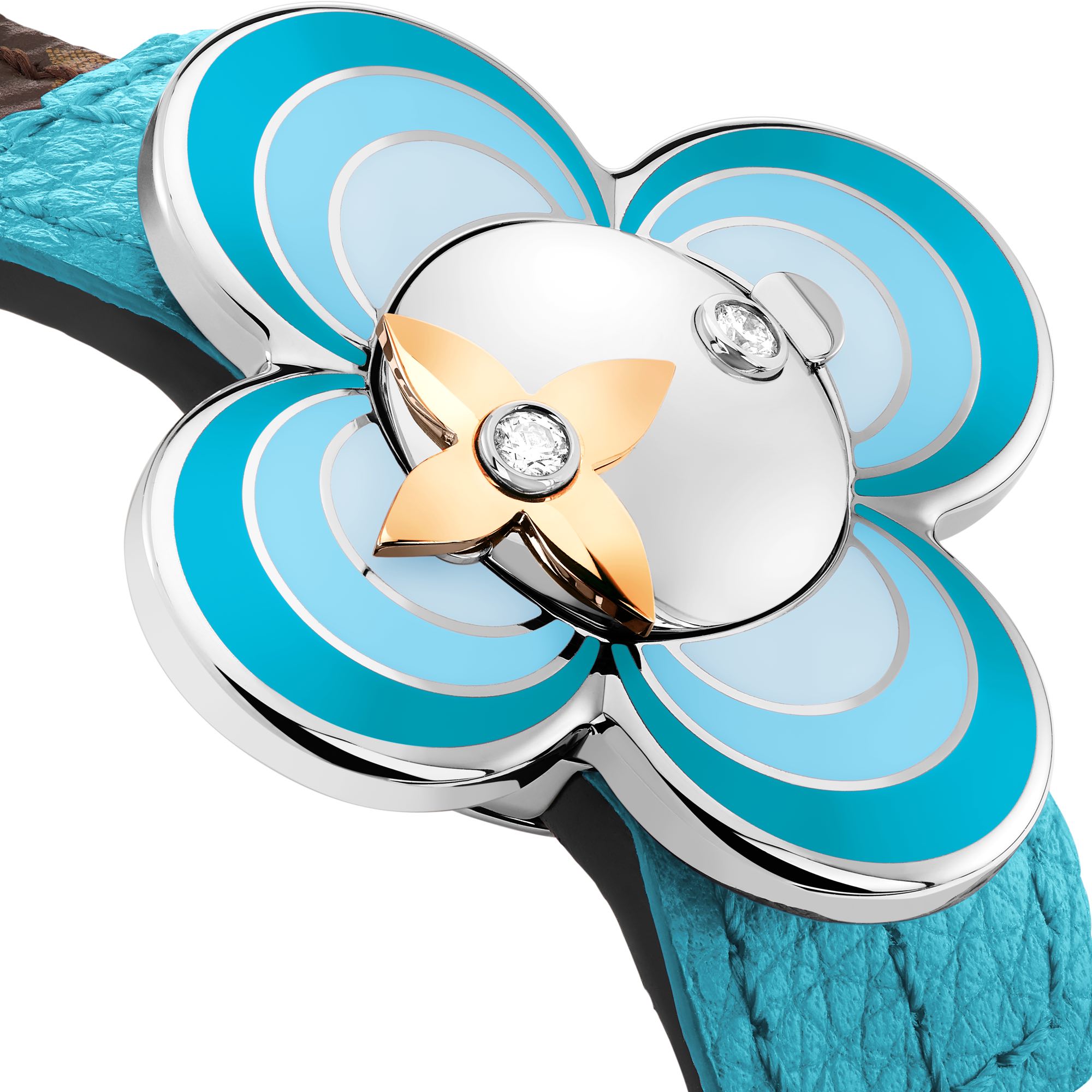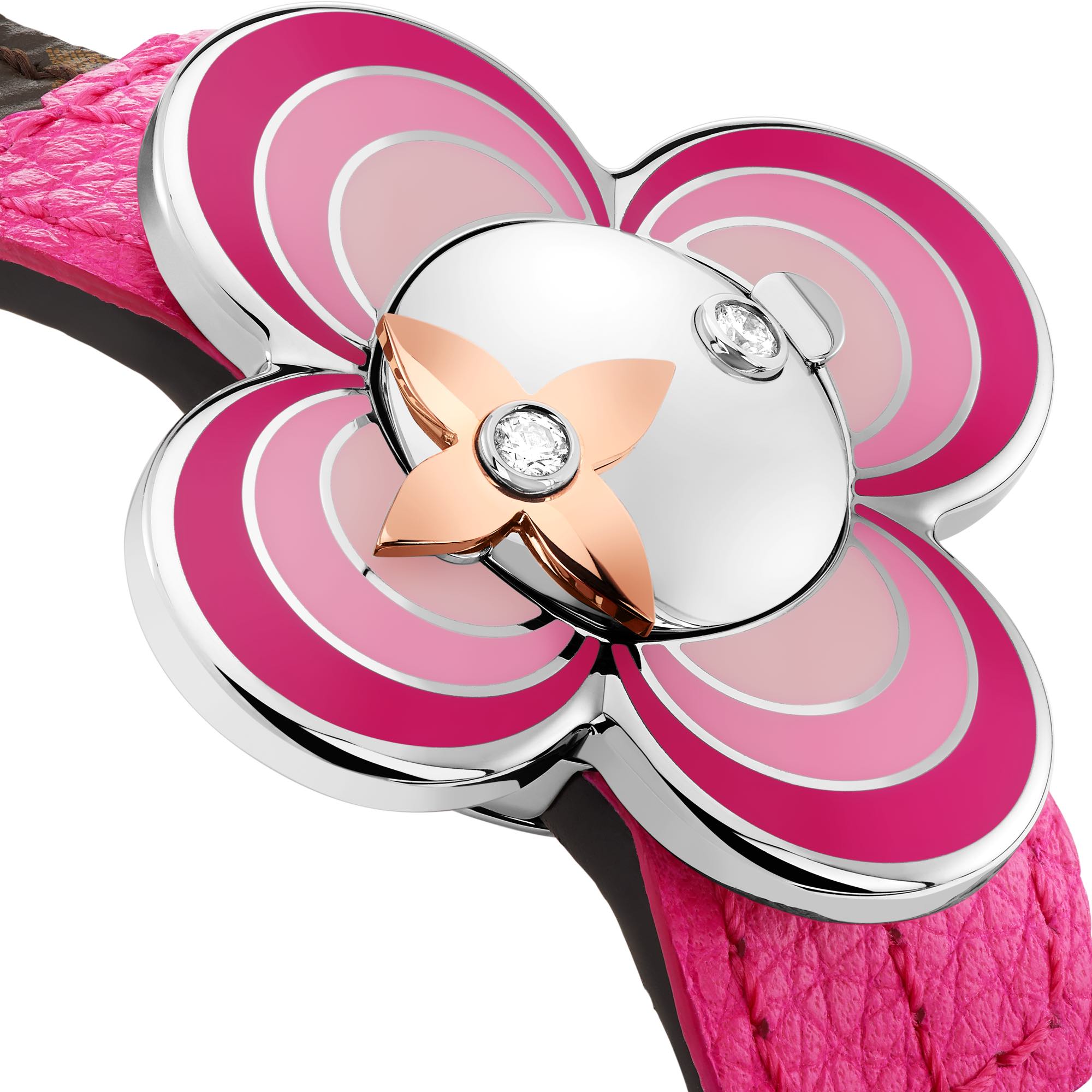 艶のあるステンレススティールにダイヤモンドとゴールドをあしらいキャラクターの愛くるしい表情を再現。メゾンの職人によるラッカー加工のモノグラム・フラワーをデザインしたダイアルが、キャラクターの顔をスライドさせることで現れるシークレットウォッチとなっている。