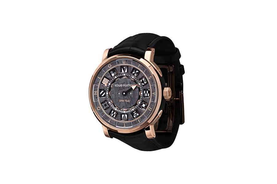 「エスカル スピン・タイム メテオライト」は、メゾンの時計製造アトリエ「ラ・ファブリク・デュ・タン ルイ・ヴィトン」のマスター時計職人により開発、製造されたスピン・タイムムーブメントを搭載。回転するキューブが時針の代わりとなり、文字盤に設置されることで時を示すシステムだ。12個のキューブのうち11個には、ブランドの様々なモチーフをグレーカラーで表現。12個目はゴールドカラーの面を用い、上品かつ遊び心溢れるデザインを落とし込んだ。