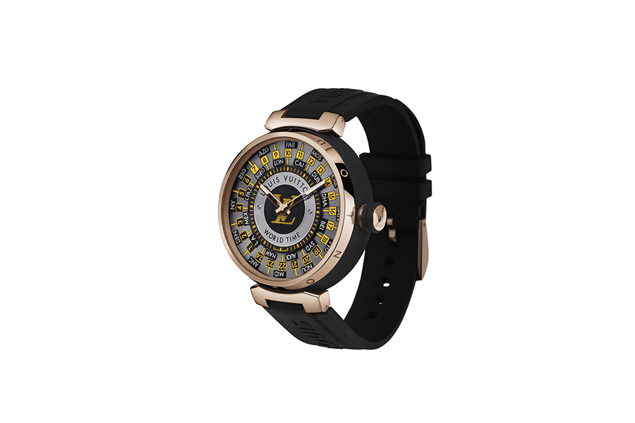 スピン・タイムムーブメント同様、時計製造アトリエで開発、製造されたワールドタイム機能を搭載した「タンブール ワールドタイム ランウェイ」は、24のタイムゾーン全ての時間を一目で読み取ることが可能。文字盤は、メゾンの文字盤職人が新たな構造とスタイルコードを用いて手がけ、ピンクゴールドとブラックPVDコーティング仕上げのステンレススチールを組み合わせたケースに収められた。