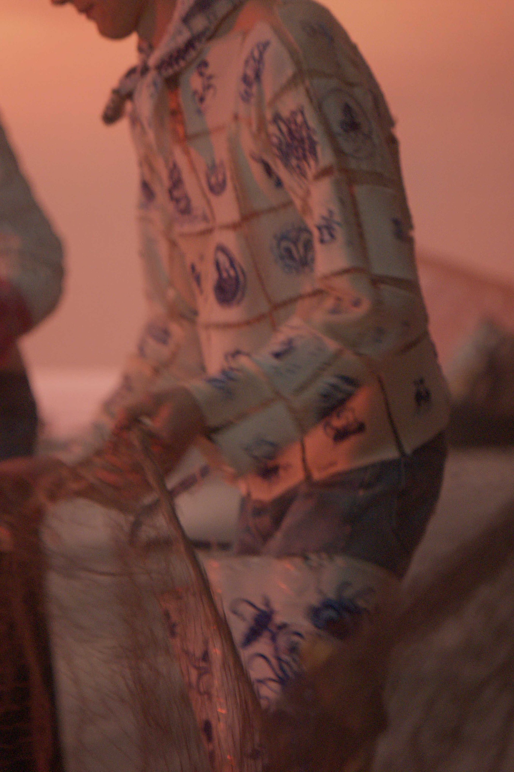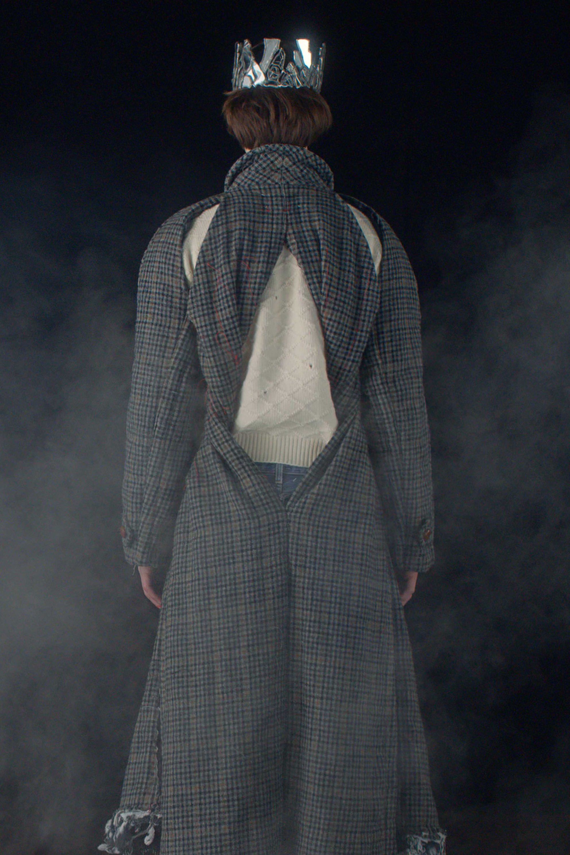同様の工程は、ローデンコートやヴィンテージのデニムジャケット、シャツなどにも採用。カッティングで大胆に変形させたスカートやスーツは、従来のライニングを用いることで馴染みのある姿に仕上げた。海洋や海岸にまつわるワードローブは、マスクにあしらった動物のシンボルやアンダーウェアの刺繍で見ることができる。