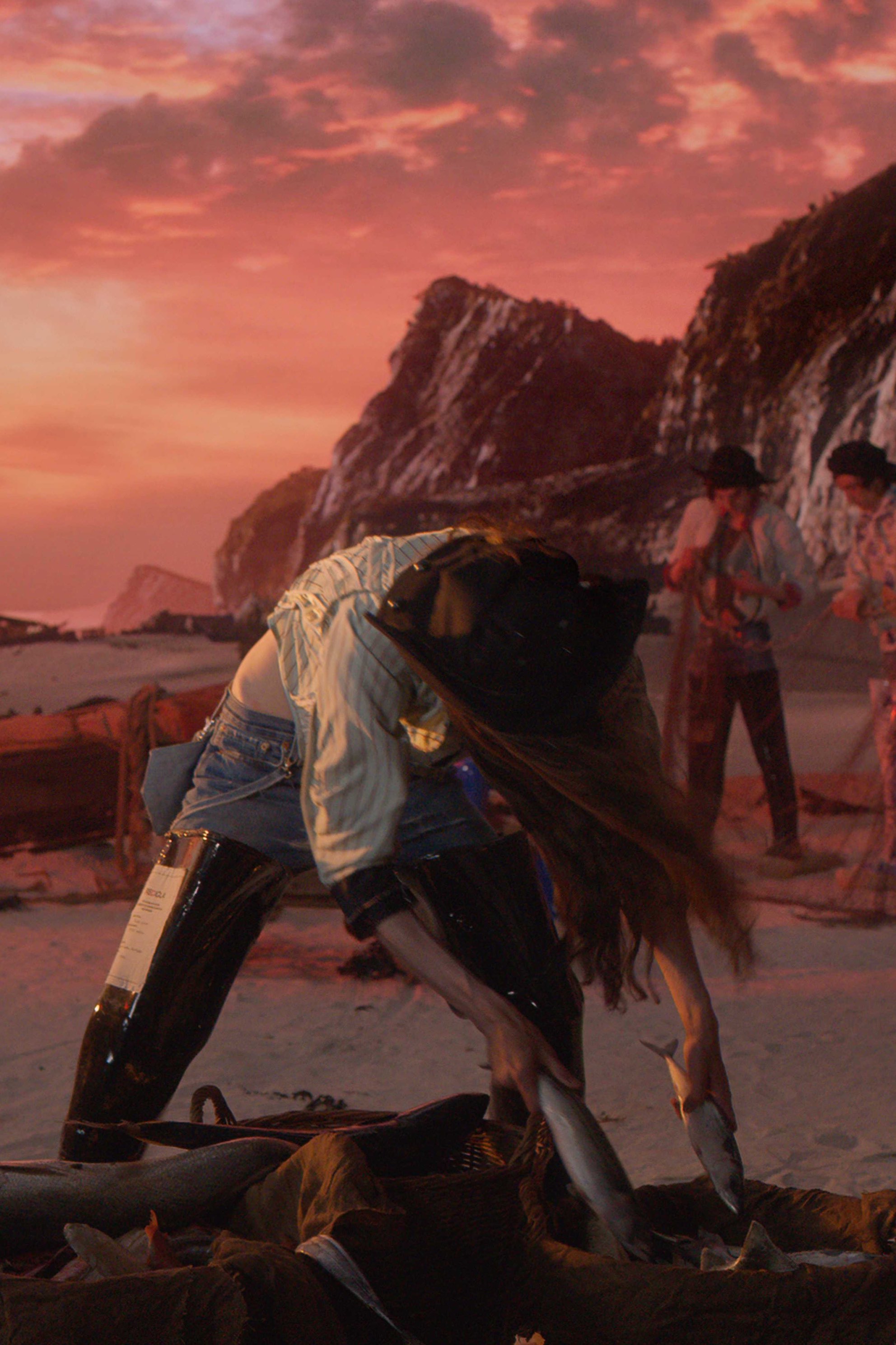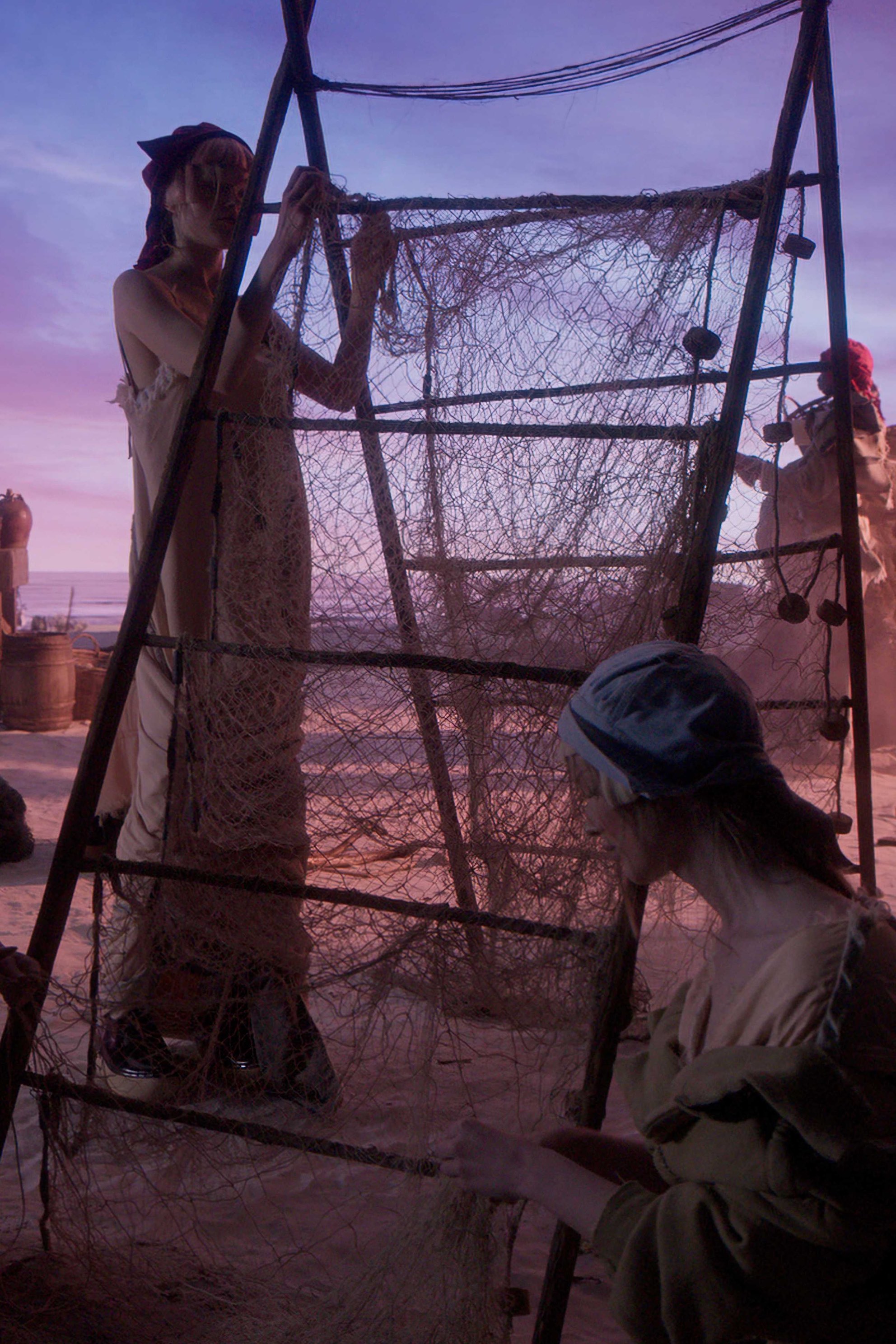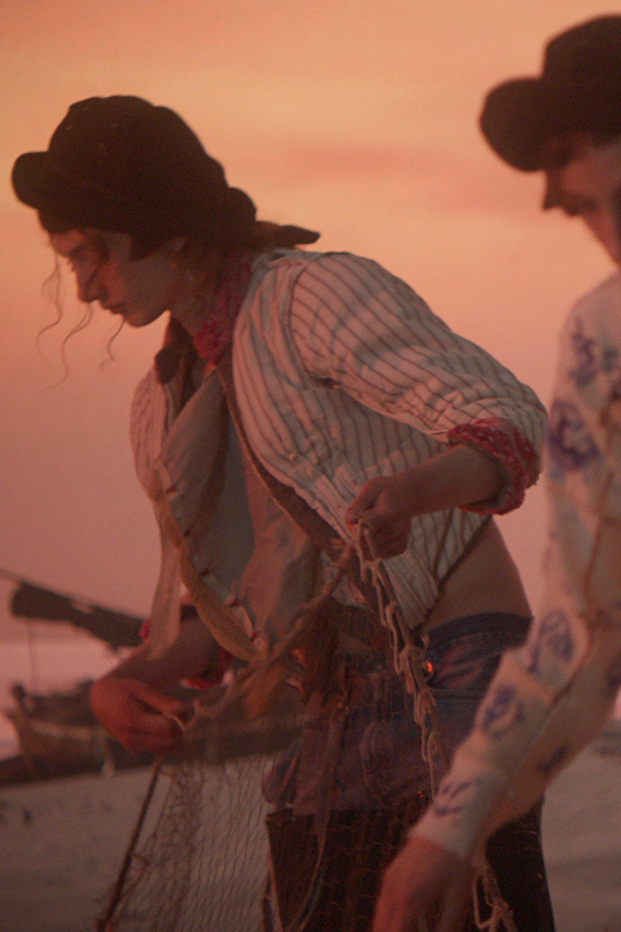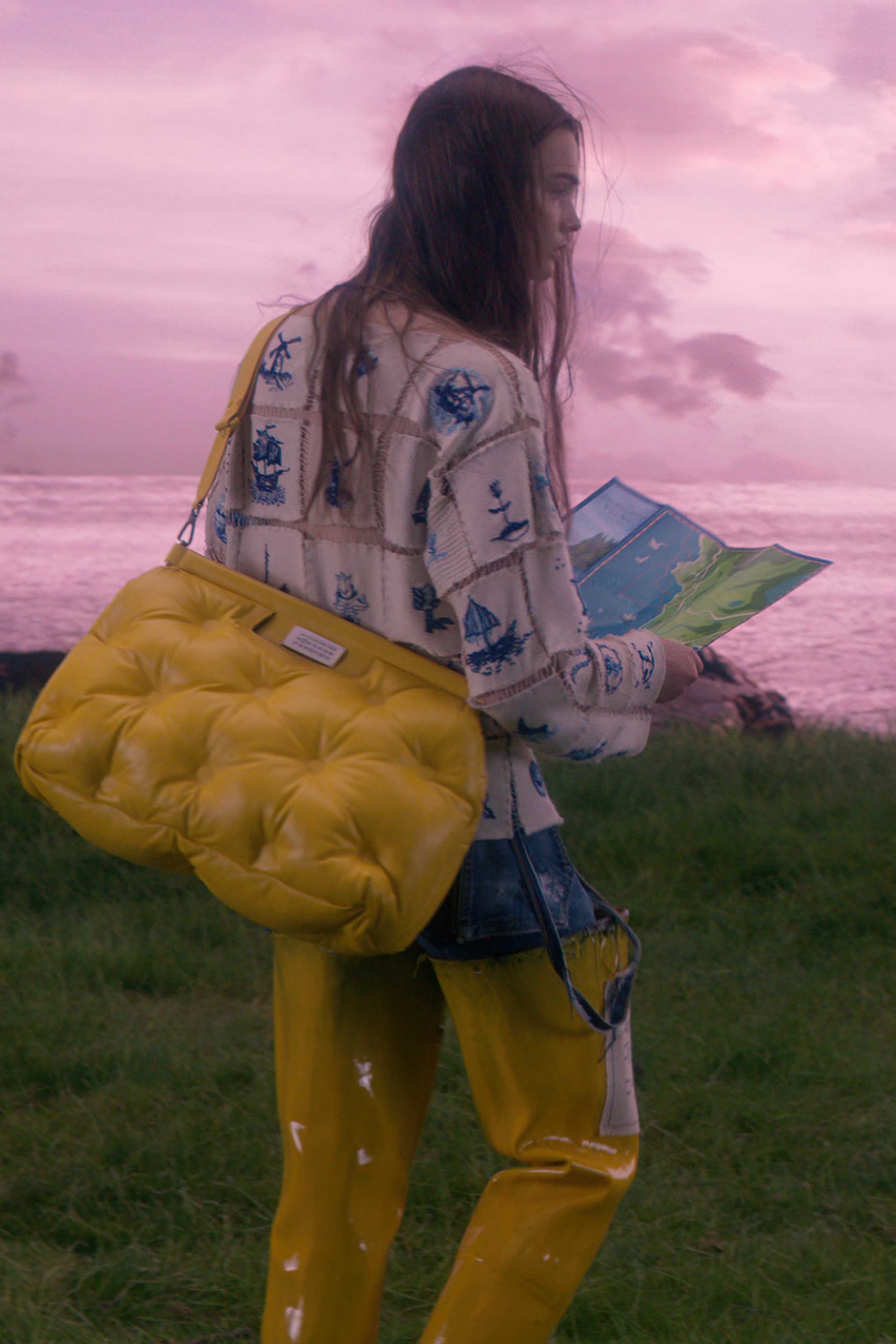 クロッグシューズは、通常シューズの木型で使うアオギリ科の木を用いたほか、「タビ」クロッグウェーダーは、漁師の長靴などを融合し、ウェーダーにペイントを何層も重ね履き込んだようなテクスチャーを与え、ソールとアッパーのー部をハンドカットして「タビ」のクロッグソールに手作業で留め付けたもの。ジュエリーは壊れたアンティークのボトルをハンドメイドし、酵素とサンド加工を施し半透明に変色させ、海岸で見つけた古い難破船のグラスを再現した。透明なマスクはプレキシグラスで製作し、動物のイラストをあしらったほか、コレクションではメゾンのアイコンバッグ「グラム スラム」も登場した。