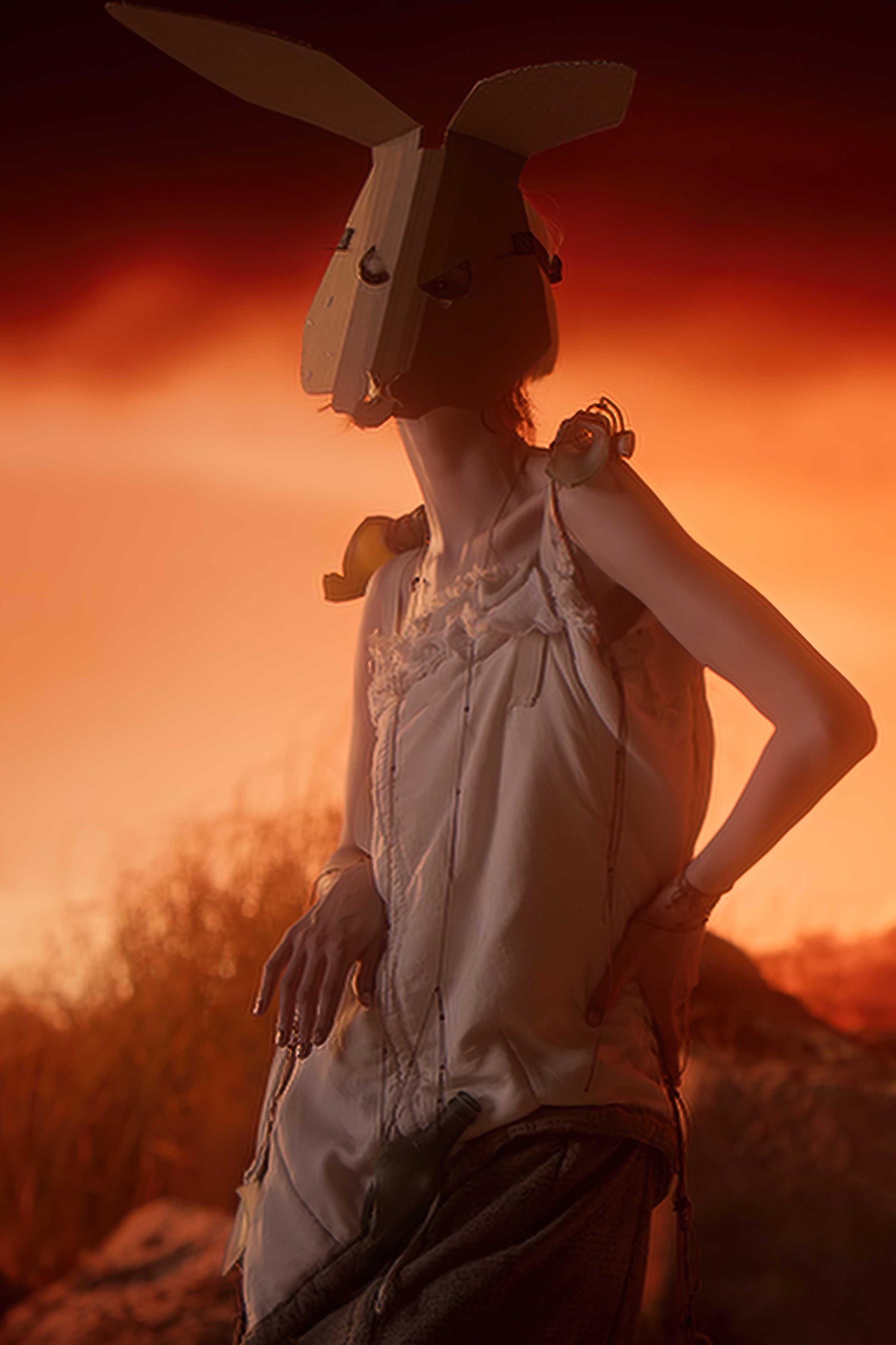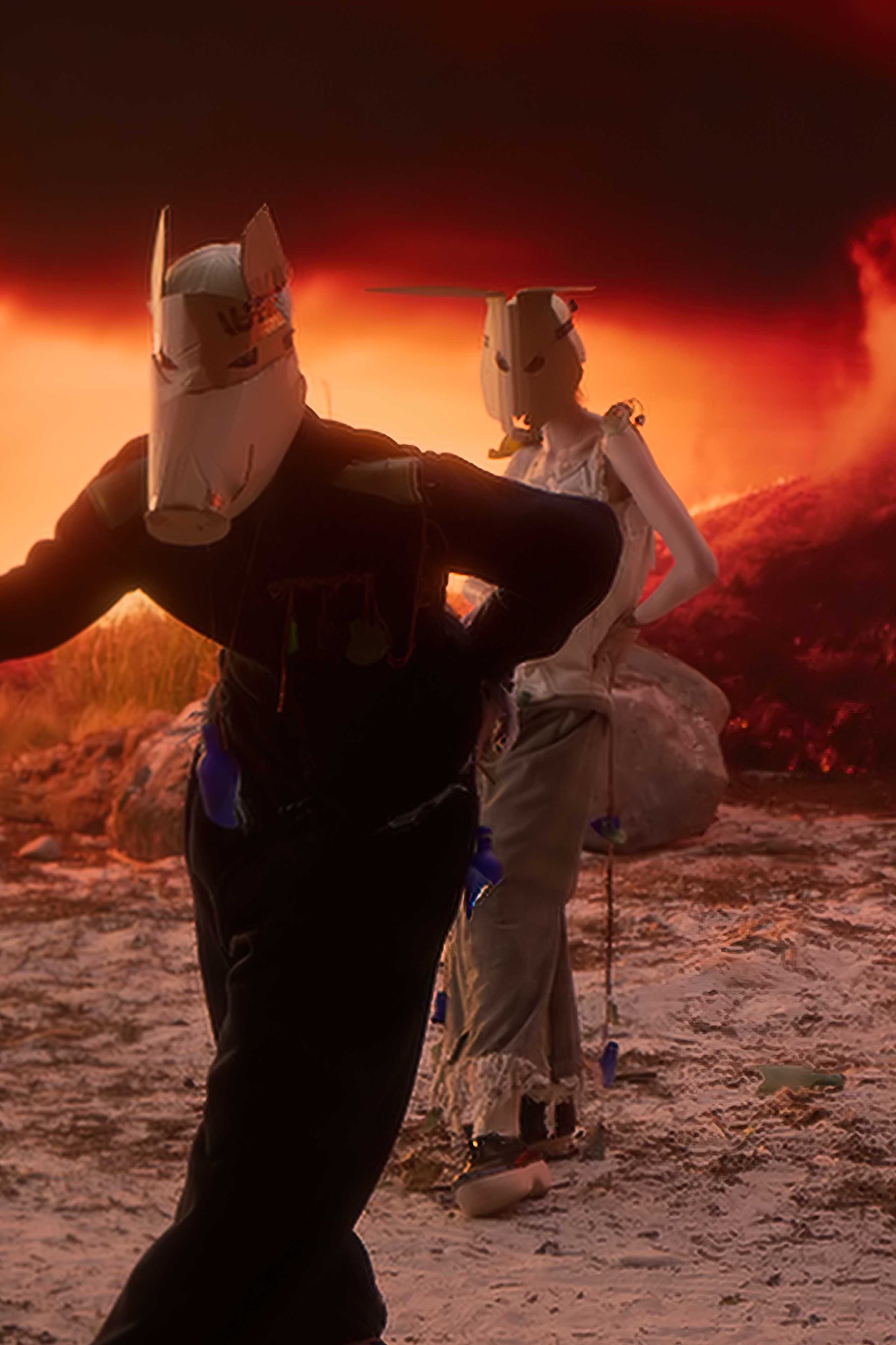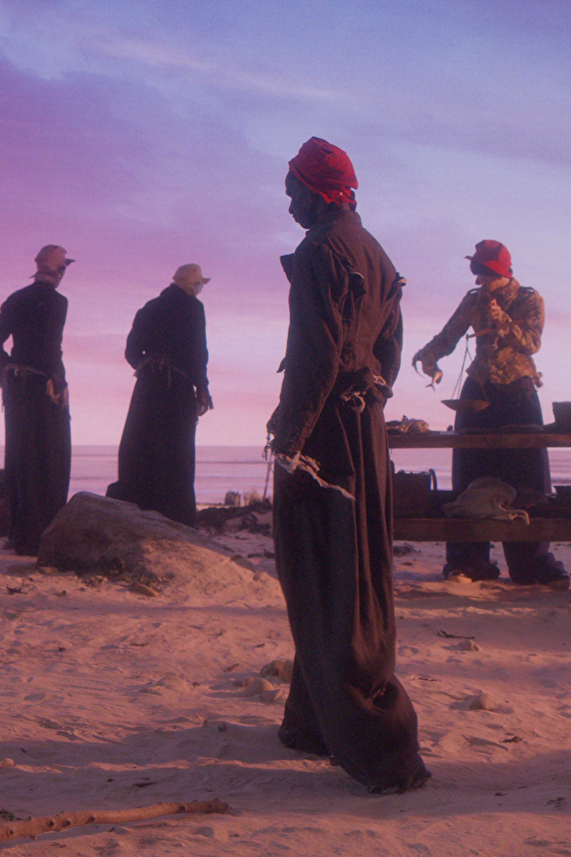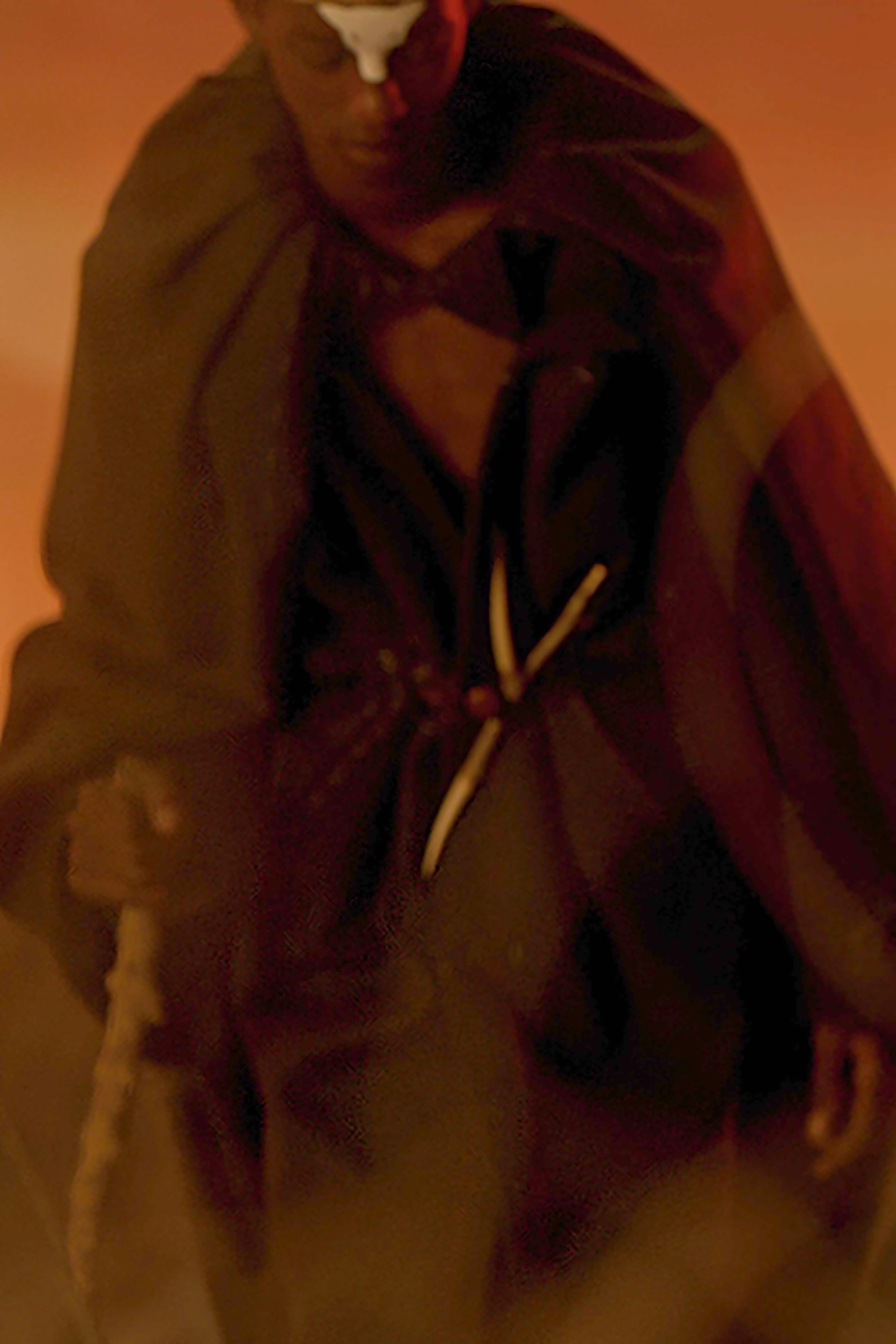 クロッグシューズは、通常シューズの木型で使うアオギリ科の木を用いたほか、「タビ」クロッグウェーダーは、漁師の長靴などを融合し、ウェーダーにペイントを何層も重ね履き込んだようなテクスチャーを与え、ソールとアッパーのー部をハンドカットして「タビ」のクロッグソールに手作業で留め付けたもの。ジュエリーは壊れたアンティークのボトルをハンドメイドし、酵素とサンド加工を施し半透明に変色させ、海岸で見つけた古い難破船のグラスを再現した。透明なマスクはプレキシグラスで製作し、動物のイラストをあしらったほか、コレクションではメゾンのアイコンバッグ「グラム スラム」も登場した。