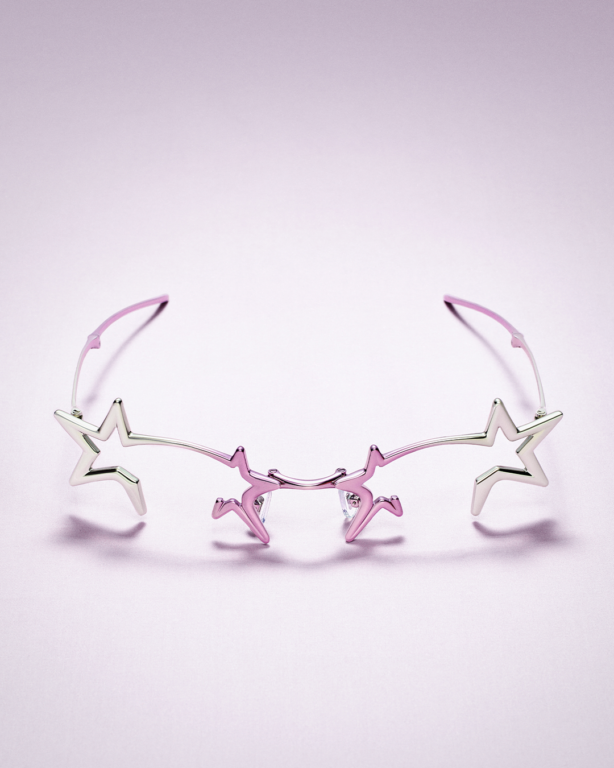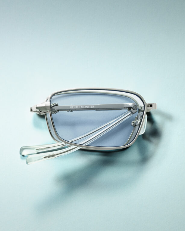 2000年代を着想源に、フレームレスメガネを未来的に表現した「VIZIONIZERI GENTLE MONSTER X MS METAL VISOR TINTED GLASSES」をデザイン。ゴーグルスタイルのモデル「sunnies」のデザインを元に、フロント中央部分に三日月のロゴを、両脇にGMの刻印を施した。繊細なメタルフレームはテンプルの付いたバイザーレンズをイメージし、デザインに落とし込んでいる。ファイアーレッドとミラーシルバー、コバルトブルーの3色を用意。