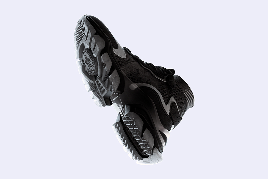 チャンキーなシルエットにオーシャンブルーを基調とした配色とトランスパレントソール、トランスルーセントのコードを組み合わせてデザイン。アッパーから繋がるニットソックスのボディにはMONCLERの「M」ロゴを配置した。メンズはトリプルブラック、ウィメンズはレモネードピンクでカラーリングして展開。ストリートな雰囲気とフレッシュな印象をまとった洗練されたモデルを生み出した。
