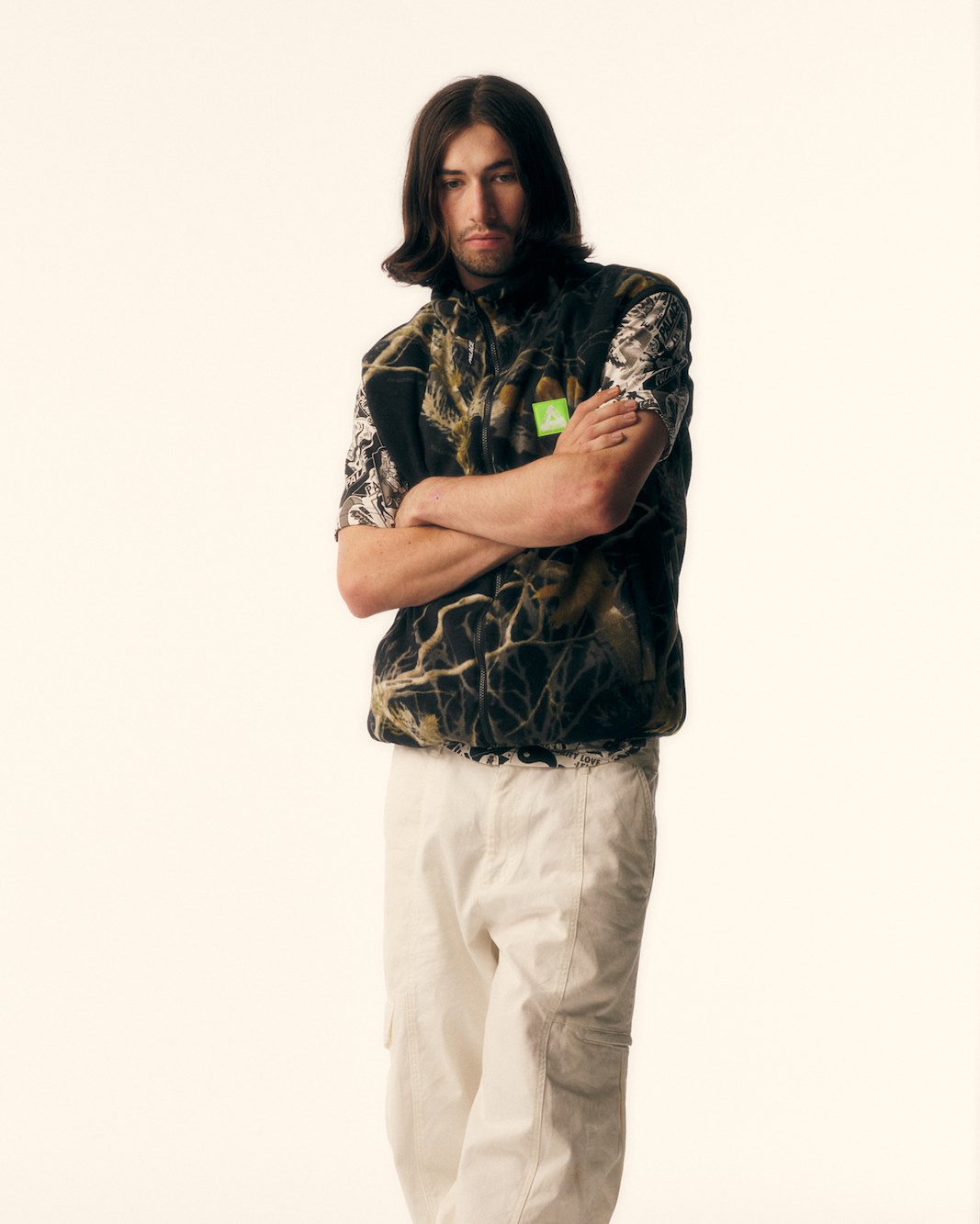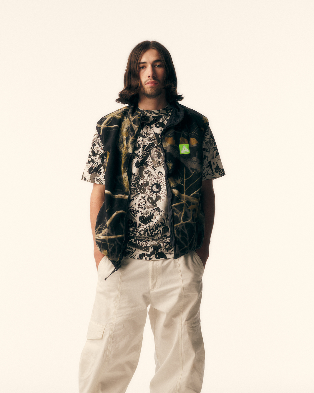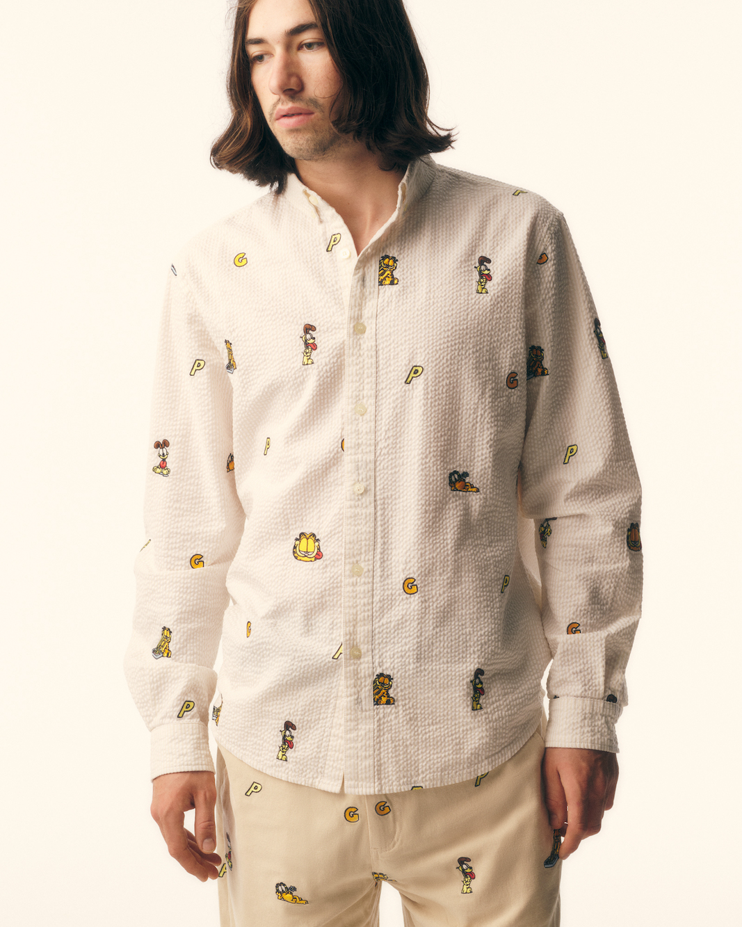 ポケットのサイズや、デボス加工などのディテールにこだわったGORE-TEXのセットアップや、REALTREEカモのフリースと単色のPERTEX素材で構築するリバーシブルベスト、歴代のステッカーグラフィックをコラージュしたTシャツ、フーディ、デニムパンツなどを展開。そのほかに日本画などから着想を得た鯉シリーズのシャツやフーディ、デニムパンツも取り揃える。Garfieldとのコラボアイテムからは、Garfieldと一緒に暮らす犬のOdieをあしらったシリーズを用意した。