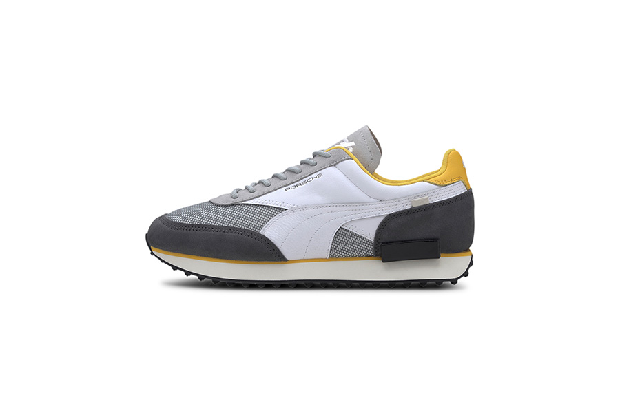 1980年に誕生し、約40年間愛され続けてきた「RIDER(ライダー)」をアップデートしたスニーカー「PORCHE LEGACY RIDER(ポルシェ レガシー ライダー)」(16,500円)は、波形フェダーバインソールを備えつつ、アッパーにプレミアムレザーを採用。鮮やかなイエローの差し色を取り入れ、高級感と上品さを演出した。