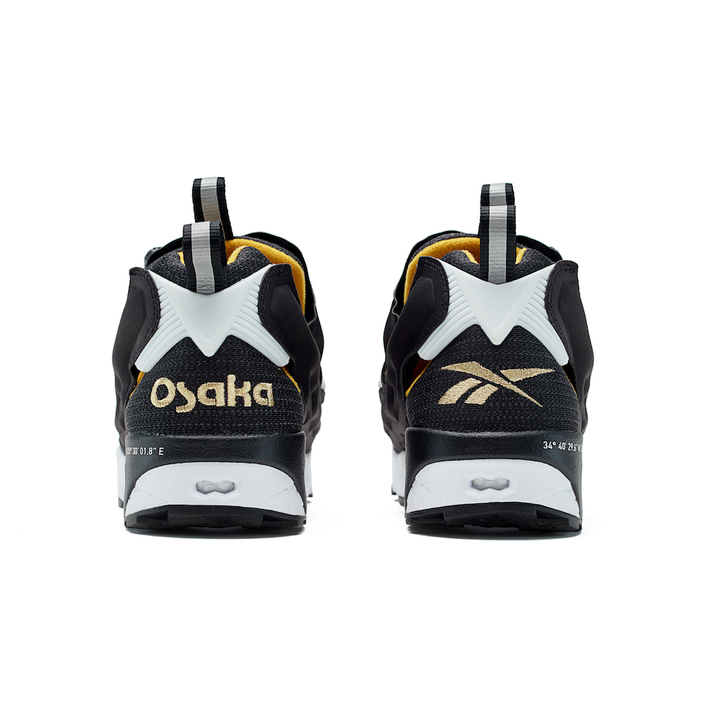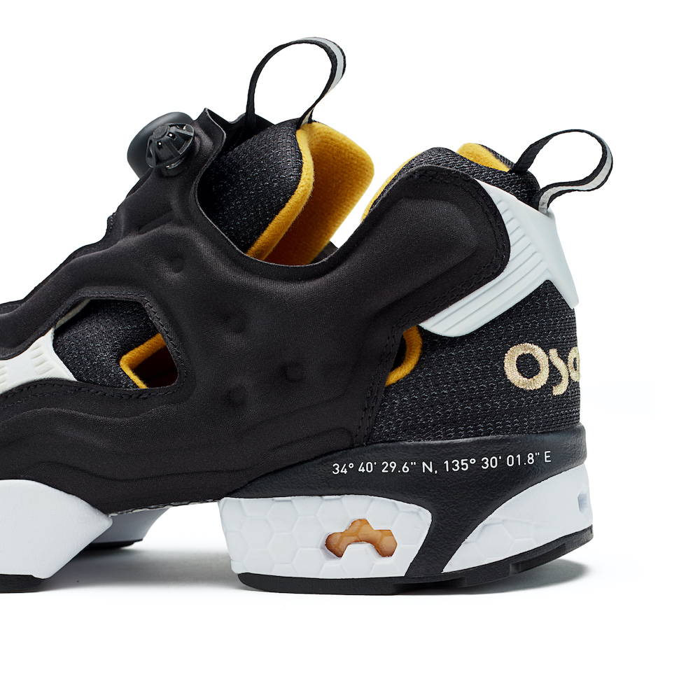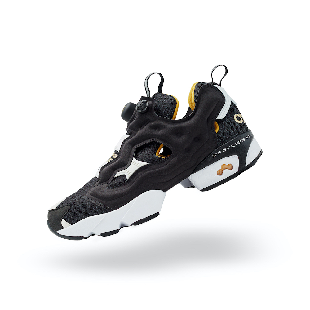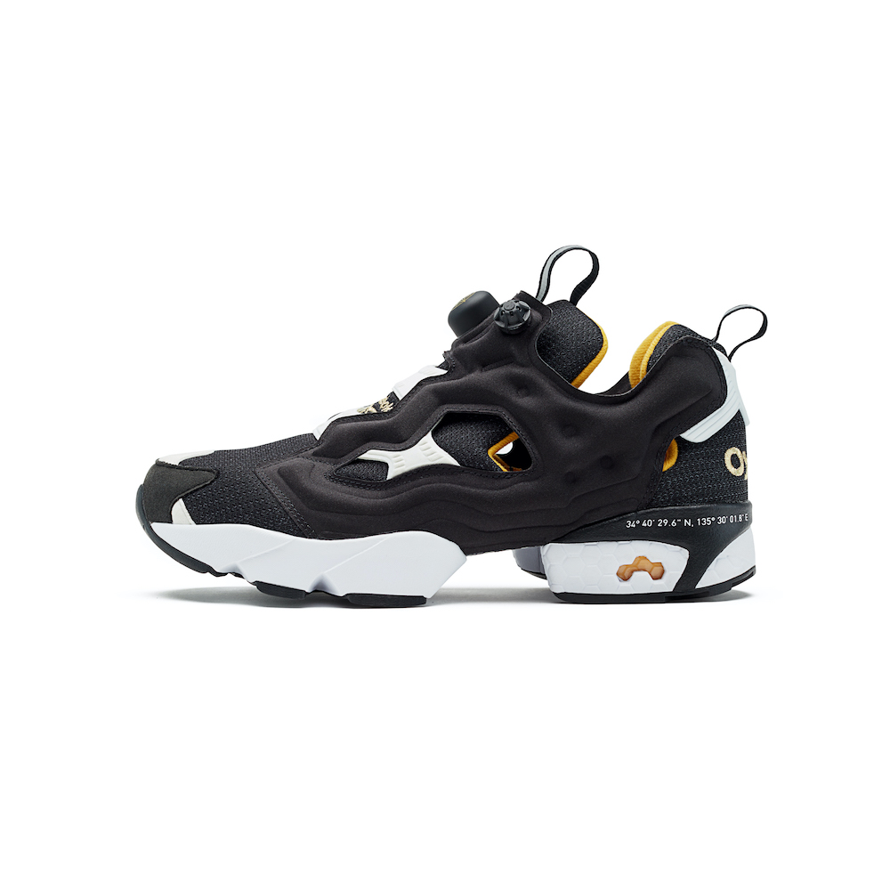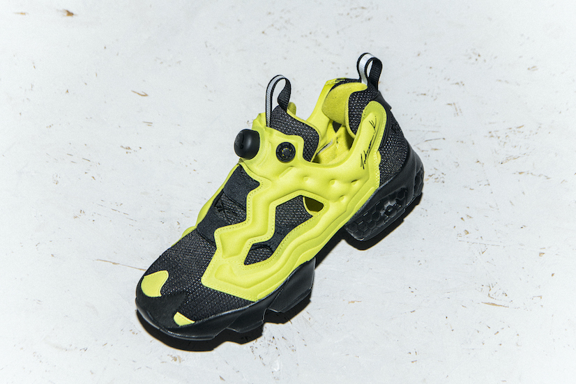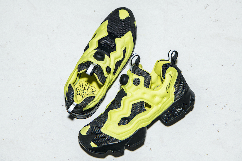 「Reebok 90s House」から生まれた日本エクスクルーシブモデル「INSTAPUMP FURY OG 90s House」は、2019年の春夏シーズンに、INSTAPUMP FURY25周年記念の一環として原宿で開催された、期間限定ミュージアム「Reebok 90s House(リーボック ナインティーズ ハウス)」での1シーンから着想を得て誕生した、日本限定モデル。様々なミュージシャンのジャケットデザインや、ファッションブランドのグラフィックも手がけるアーティストの上岡拓也が、Reebok 90s House開催期間中、イベント会場の壁にINSTAPUMP FURYのファーストカラーであるシトロンを描き、その描き途中(下地の黒いベースと特徴的な蛍光イエローのブラッダー部分)であるカラーリングをそのままデザインした。ヒール部分に上岡のシグネチャーが施され、インソールには今作のために上岡がデザインした「PUMP FURY」の文字をプリント。3アイテムで唯一の日本エクスクルーシブモデルとなる。