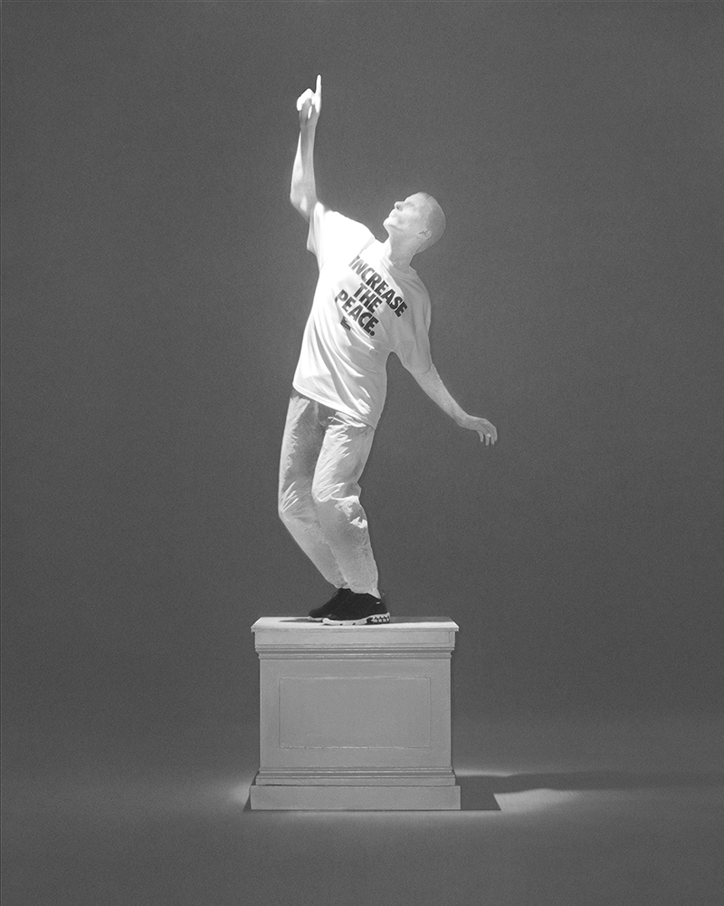 メッシュ素材を用いたアッパーはブラック、マットな印象のソールはグレーでそれぞれカラーリング。スポーティなデザインでありながらも、シックな雰囲気まとった一足を作り上げた。両ブランドのアイコニックなグラフィックとメッセージをあしらった「Increase The Peace」のグラフィックTシャツもあわせて展開。