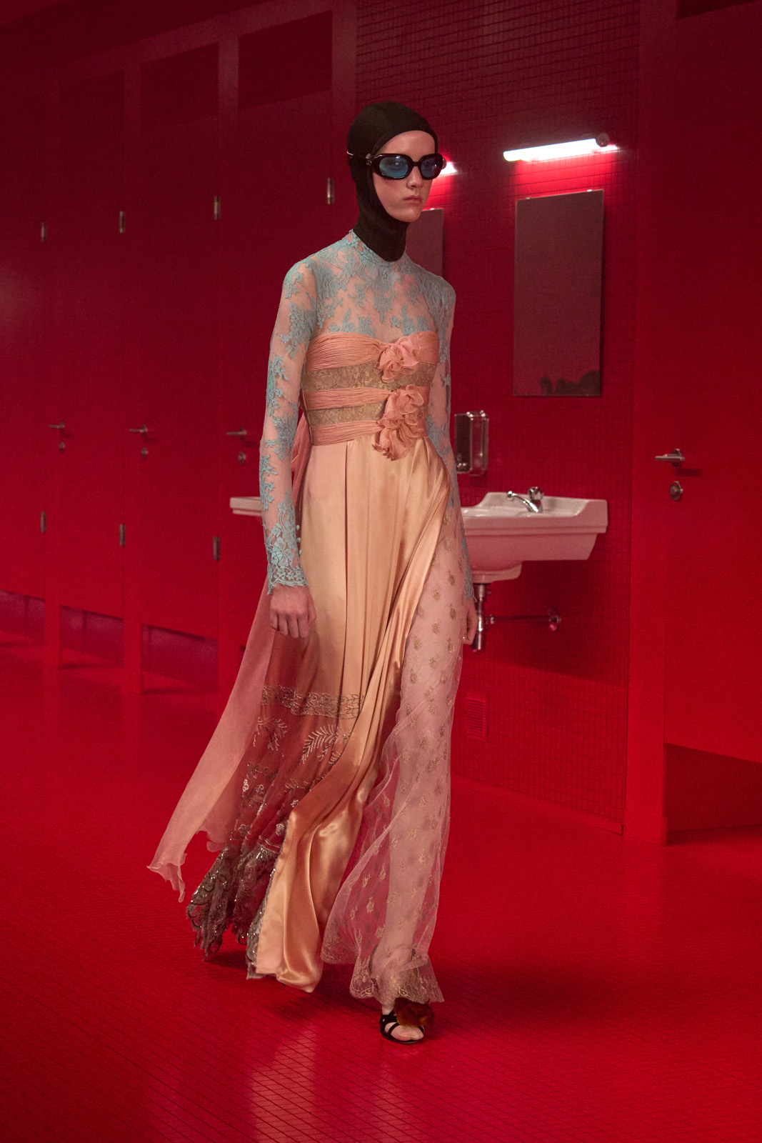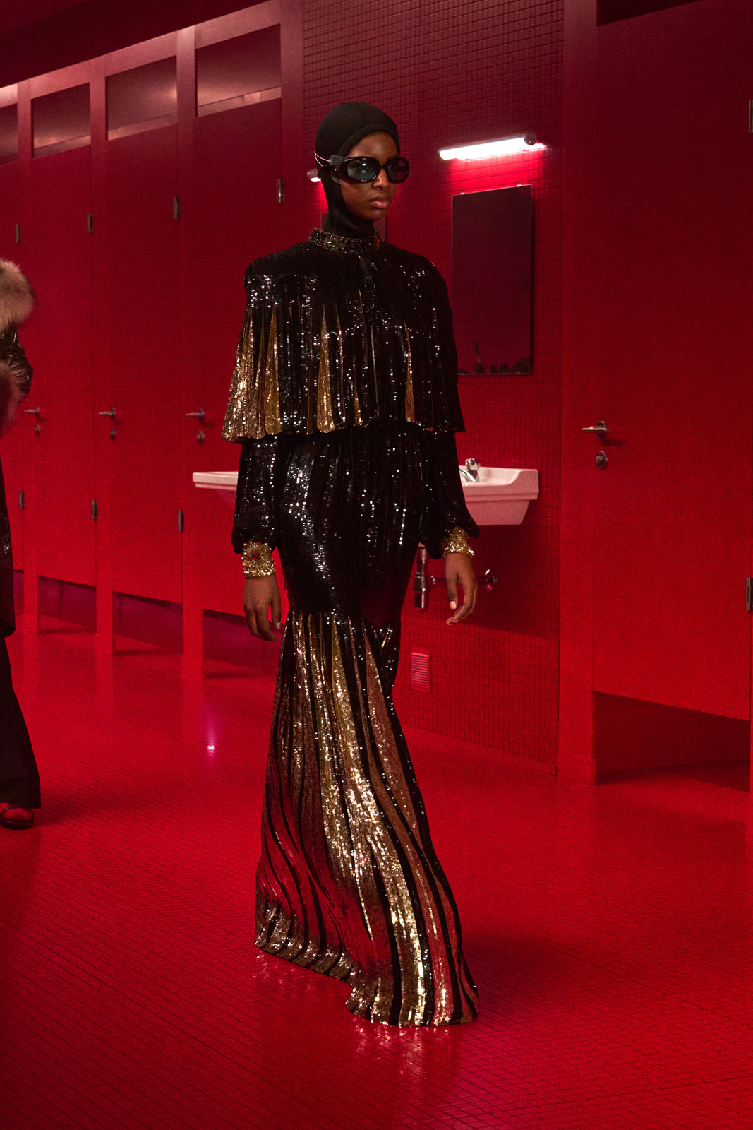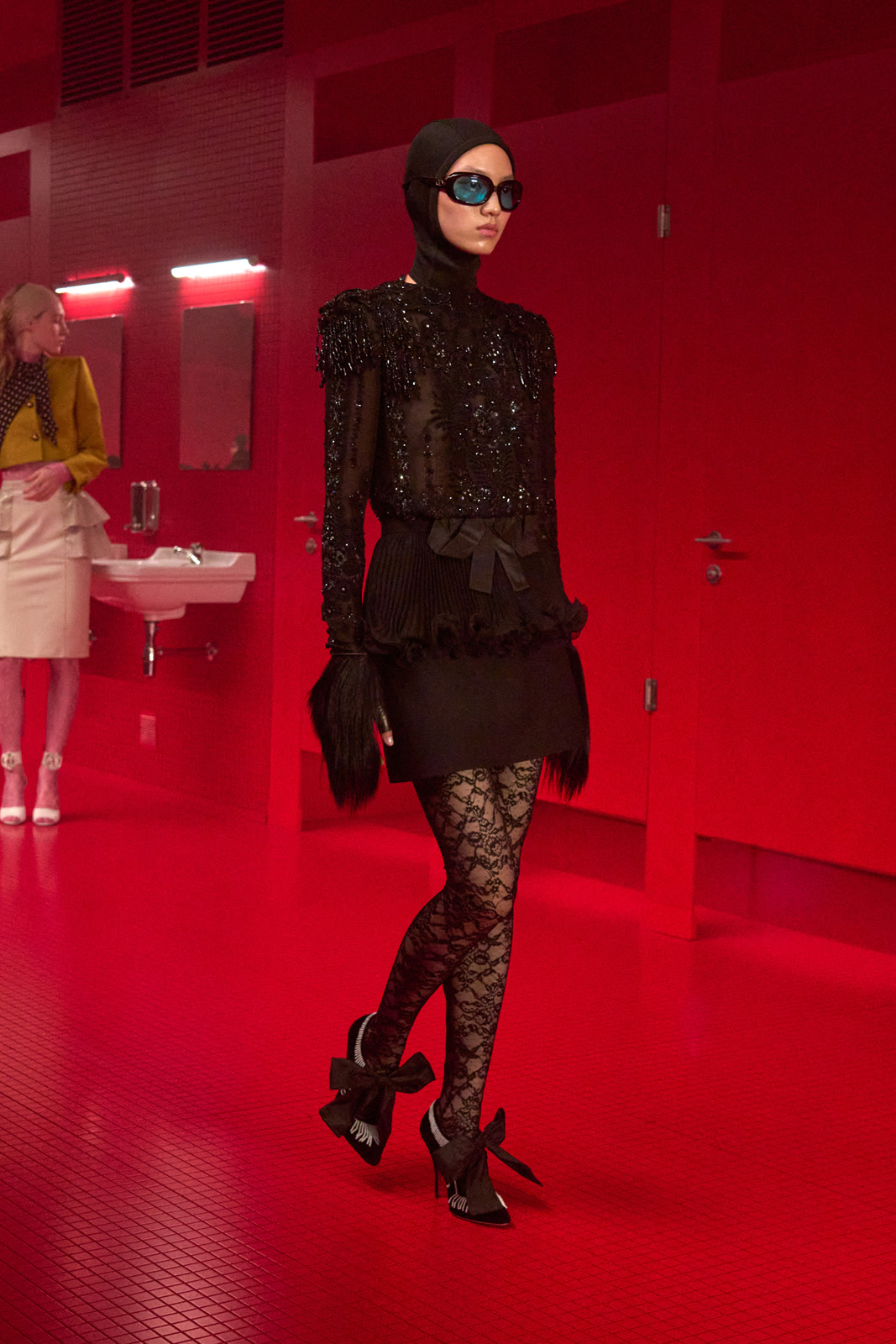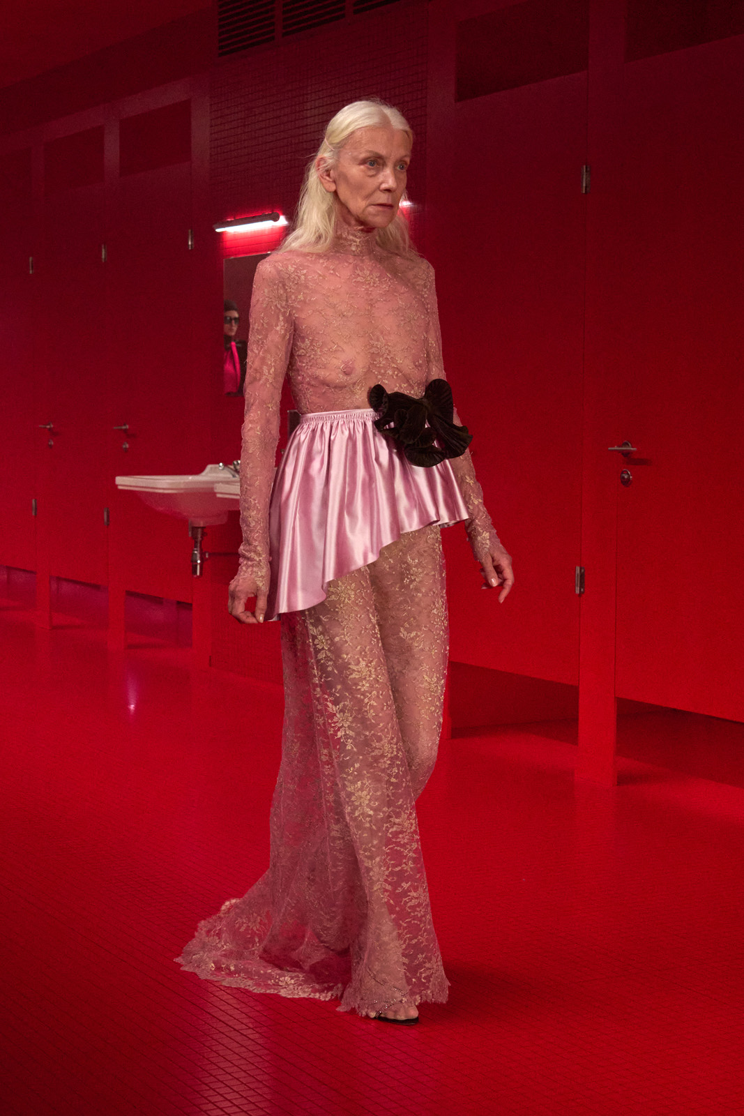 舞台となるのは、ヴァレンティノ レッドに染め上げられた公衆トイレ。プライベートとパブリックが交錯し、礼儀と背徳、露出と隠蔽がせめぎ合う境界的な空間に、 登場人物たちが「ル メタ テアトロ デ アンティミテ」のルックを人生という舞台で自己を表現するための第二の皮膚としてまとい、映し出される。