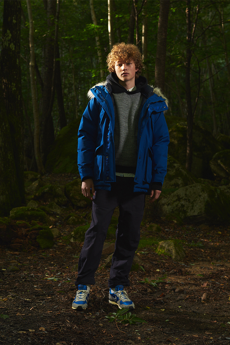 またフラッグシップモデルとなる「スーペリアアークティックパーカ」は、アウトドアアパレルの特徴でもある“環境変化への適応性能”の中でも堅牢性と保温性の最大化に挑戦をしたという。“高耐久 200デニールナイロン GORE-TEX®”ファブリックを使用し、貴重な資源である天然ダウンの保温性能を最大限に活かすため、遠赤外線効果を持つ“光電子”ファイバーを加えた。さらに降雨や発汗といった”かさ高”の減少を招く水濡れ対策として、衣服内外温度差による結露が発生しやすい外層部分には、撥水性の高い合繊中綿プリマロフトを、身体側にはダウンを配した2層構造を採用。さらにコールドスポットとダウン抜けを最小化する為に、袋状に織られた特殊な裏地にダウンを封入されている。また、表素材の撥水加工には自然環境への影響が懸念される有機フッ素化合物であるPFCを使用せず、衿元のファーには世界市場をリ ードする高度な日本の植毛技術を活用して開発した『Fur Free Fur』を使用。