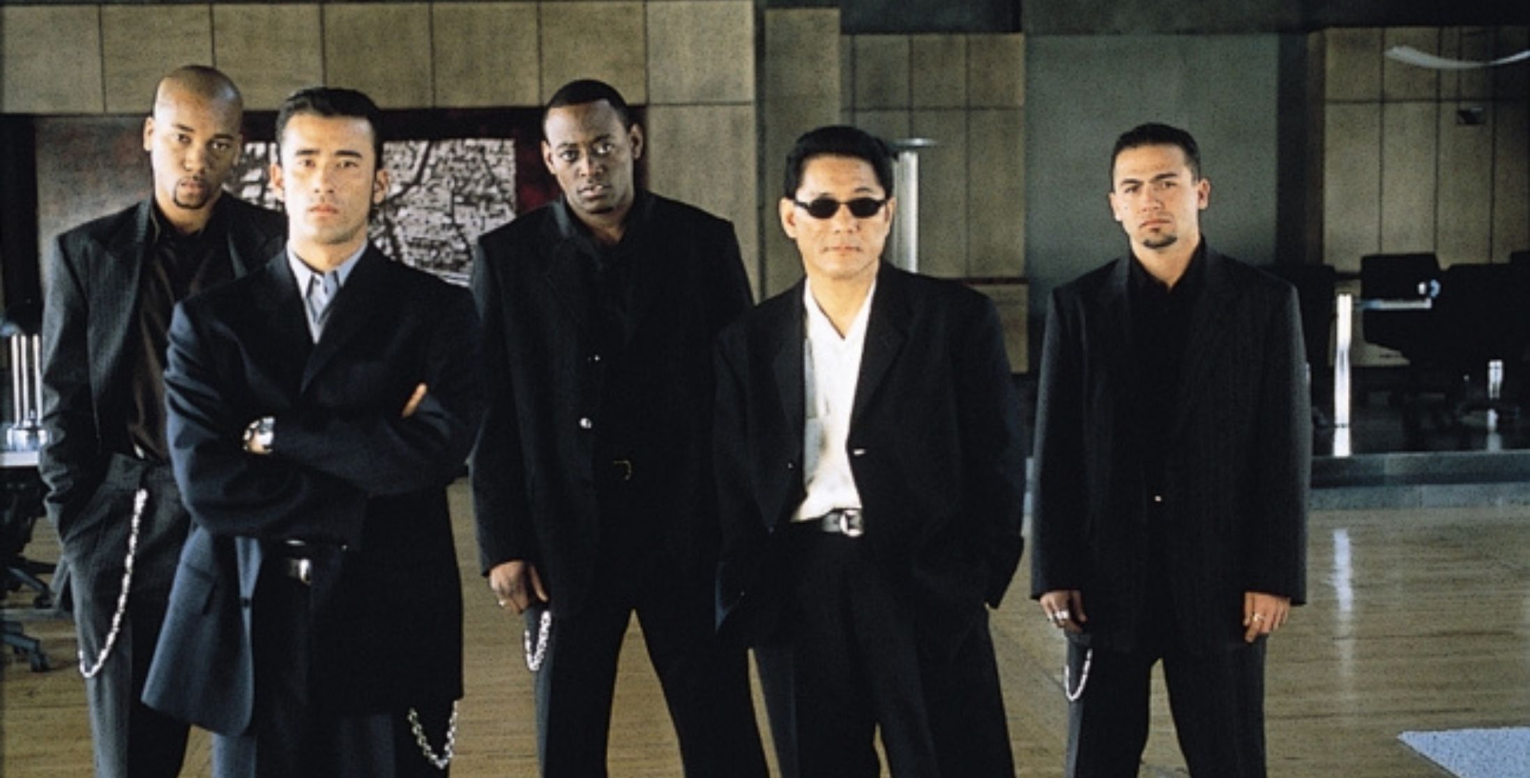 『ブラザー』の主人公は偶然にも “山本” という名前で、北野(脚本・監督・編集も務めた)自身が演じている。その彼が1990年代後半のロサンゼルスに現れるときにまとっているのは、ダークネイビーの肩幅が広くゆったりとしたYohji Yamamoto(ヨウジヤマモト)のブレザーに、スプレッドカラーのシャツを合わせたスタイルだ。やがて物語の終盤には、山本率いるロサンゼルスのギャングたちも、その装いを真似るようになっていく。