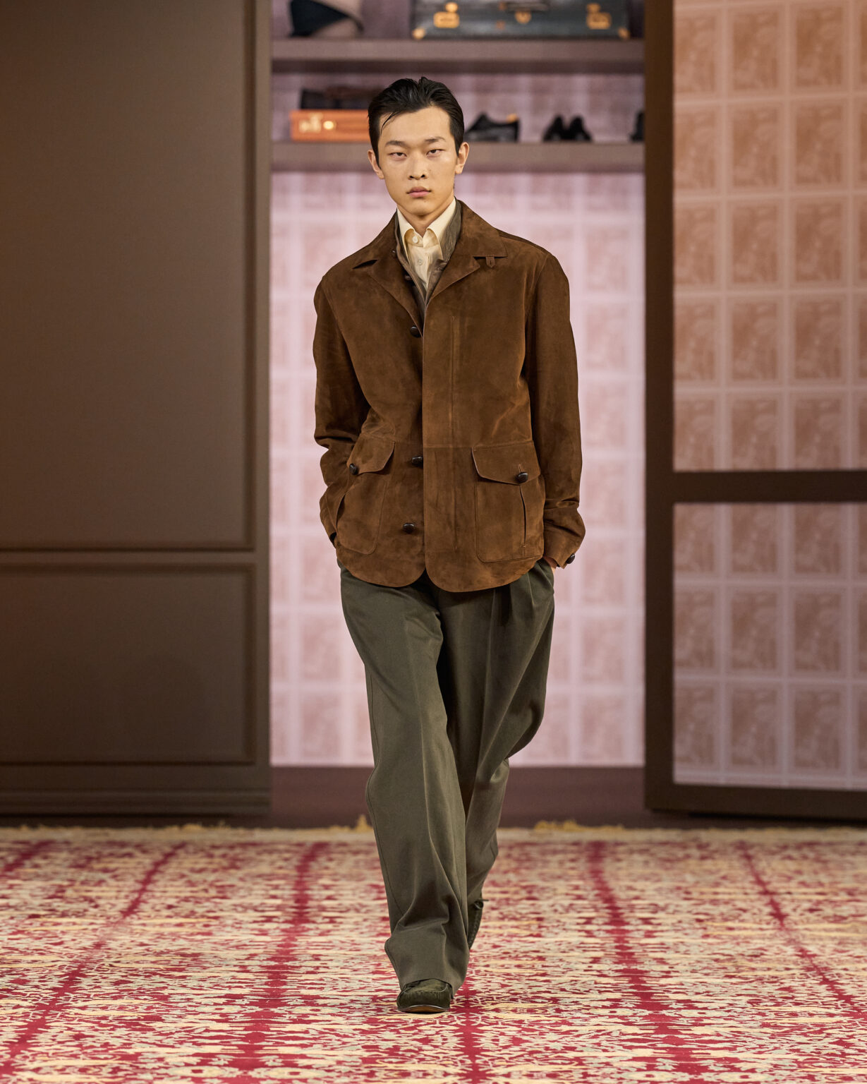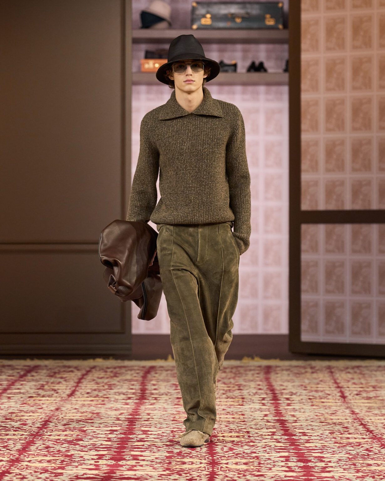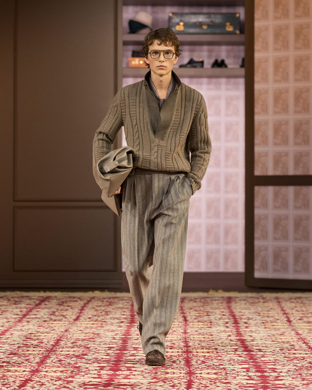 オアジ・ゼニアに象徴される卓越性と美の追求を具現化したのが、イタリアの匠の技の集大成である「オアジカシミヤ」。さらに、このコレクションでは、#UseTheExisitingTMによる原材料から作った花崗岩のような印象の素材、アルパカ、コットン混紡コーデュロイ、心地よい感触のウールツイルも登場。