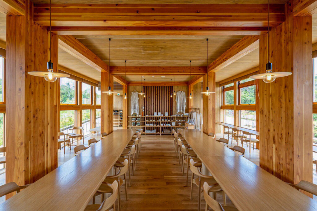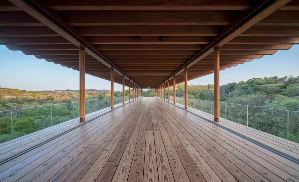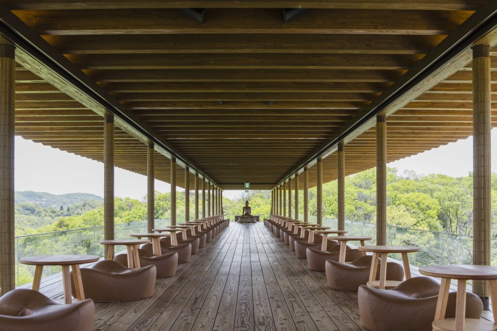 全長100mの空中回廊を抱き、まるで深い森に船が浮かぶように幻想的な建築を手がけたのは、プリツカー賞受賞建築家の坂茂。コンクリートと鉄を巧みに使い分け、細部まで計算された木造構造には、建設で伐採された木材が再利用されている。1986年に再生紙の紙管を発表して以来、サステナブルな建築の先駆者として知られる坂。その素材や構造への挑戦、美と合理性の両立、公共性を取り入れた建築美学が、人の手によって自然との美しい調和と融合を実現している。
