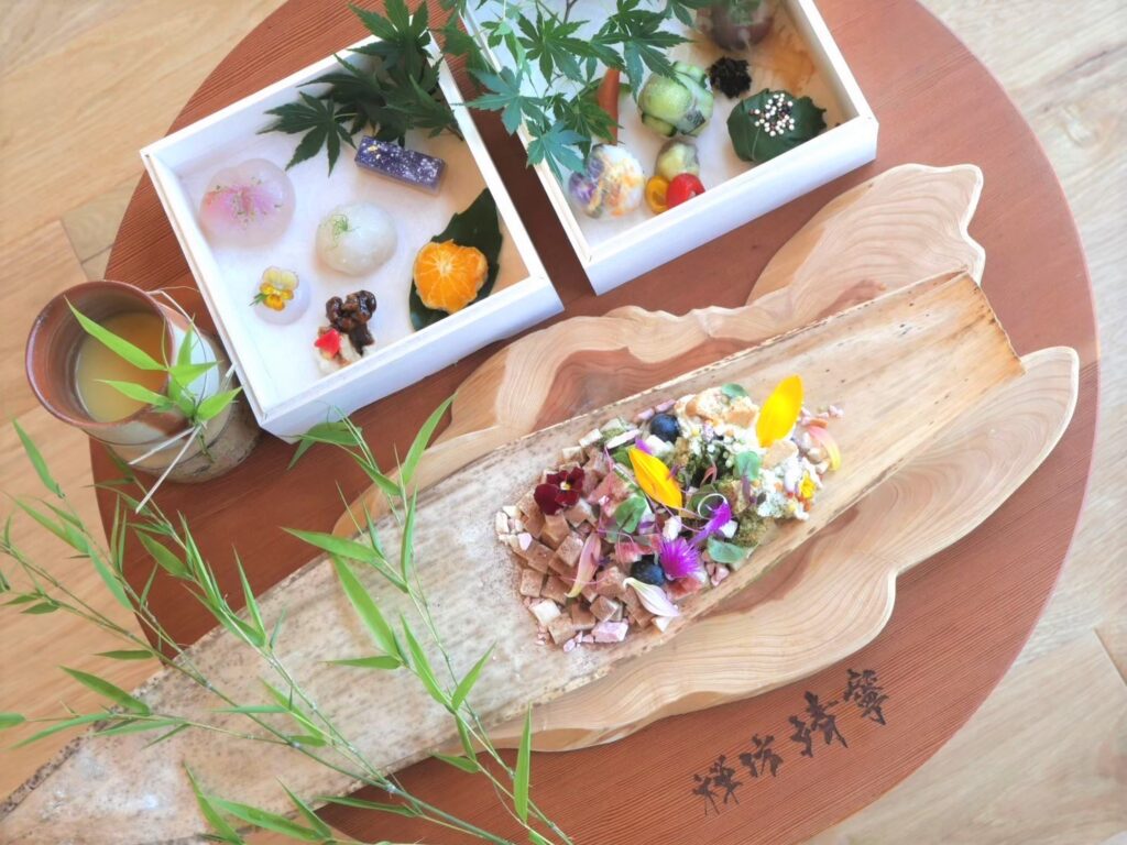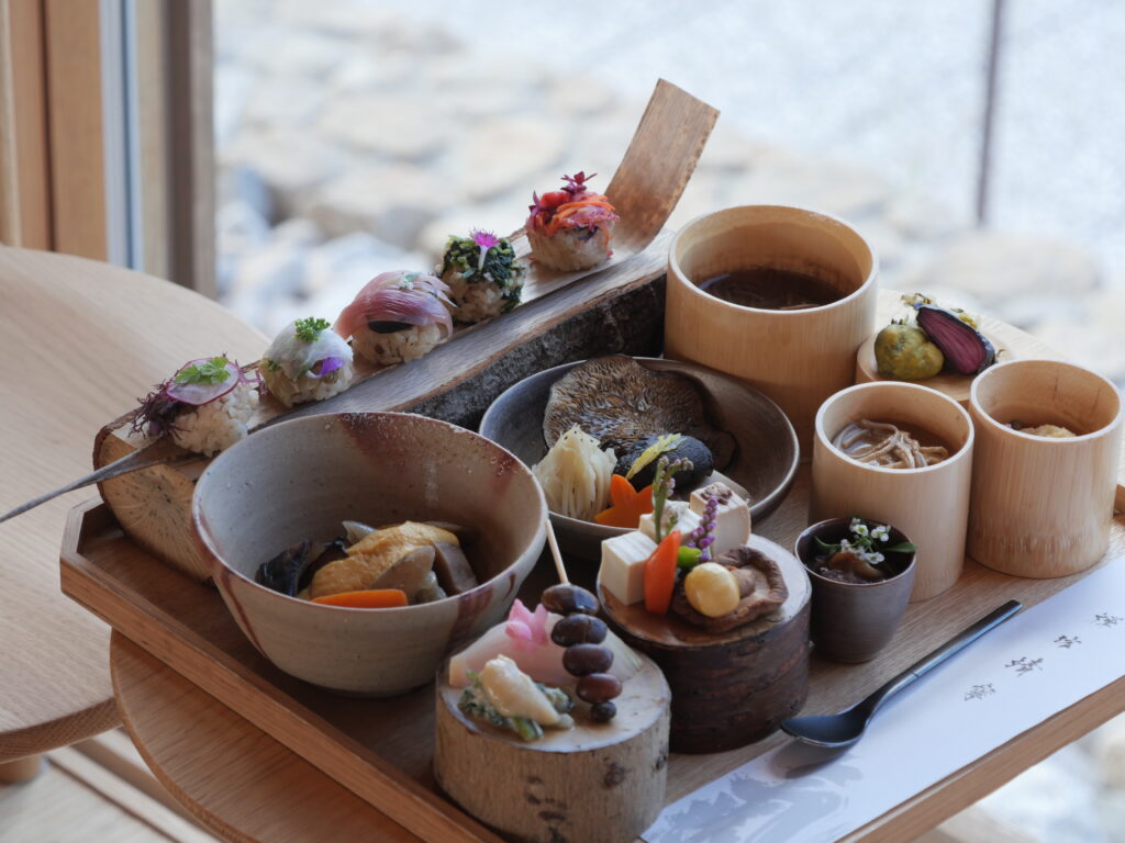 食事は、肉・魚・油・小麦粉・白砂糖を一切使わないオリジナルの発酵料理「禅坊料理」。醸造料理人であり日本の発酵食文化伝承人、伏木暢顕の監修のもと、地元や自家栽培の野菜を主役に調理される。味噌や醤油、麹といった古来の発酵調味料の中でも、1年から3年かけて伝統的な製法でつくられたものを厳選し、生きた酵素や菌をそのまま届けることを信念とする。四季の味覚と細やかな手仕事を感じながら、口の中で完成する味わいをじっくりと楽しむことができる。