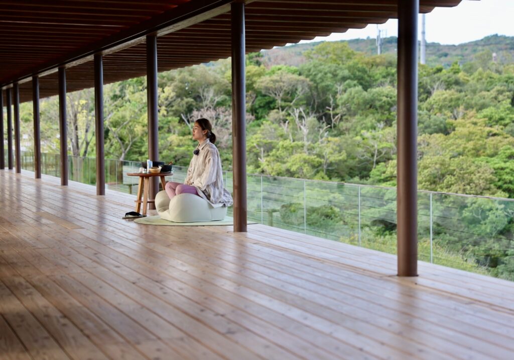 月一回開催のZEN Detoxリトリートは、ヨガや瞑想、呼吸法といったワークが組み込まれたプラン。禅由来のメソッドが、日常で散漫になった思考や精神を整えてくれる。宿坊のように並ぶ部屋では、畳製のベッドに自ら布団を敷き、寝床を整える。一つ一つの儀式を丁寧に行うことで、心が静寂へと向かっていく。360度のパノラマで自然が広がるウッドデッキで行う昼のヨガ、森の静寂に包まれる夜の瞑想、そして早朝の雑巾がけが、心の塵を払う。部屋や回廊には禅語が記されており、一つ一つの行動が意味を持つ。清らかな脳内に、その時々に必要とされる言葉がスッと入り込み、新たな学びの扉を開く。独特な波長によって、自己が静かに調律されていく。